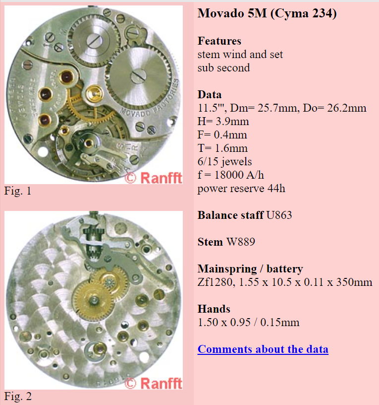 ·Recently, I was looking at the time-only movements in Movado's Ermeto and I noticed something unexpected. Along with the caliber 150MN, I found a couple of examples with what looked to be Cyma movements. Conveniently, Ranfft has a page on the caliber in question, which is referred to as a "Movado 5M (Cyma 234)".