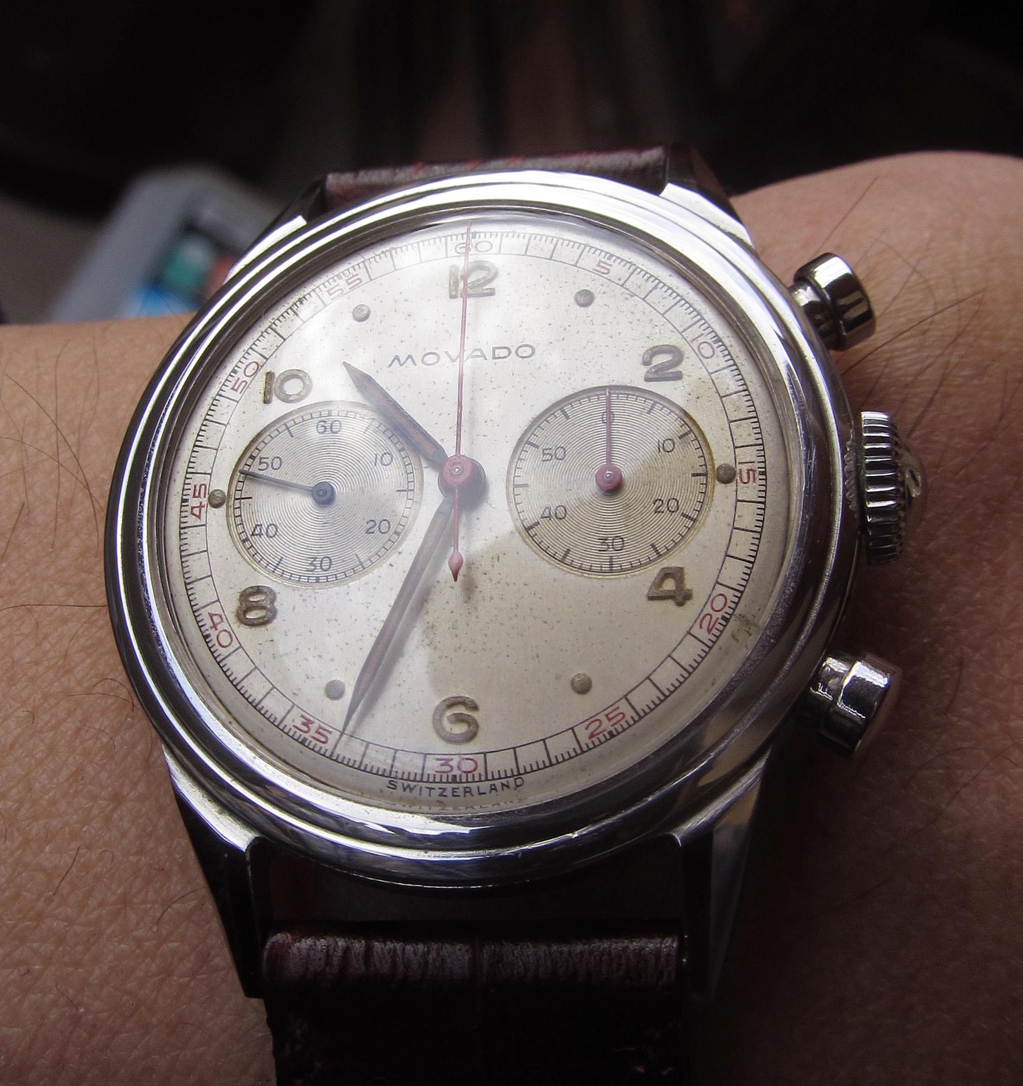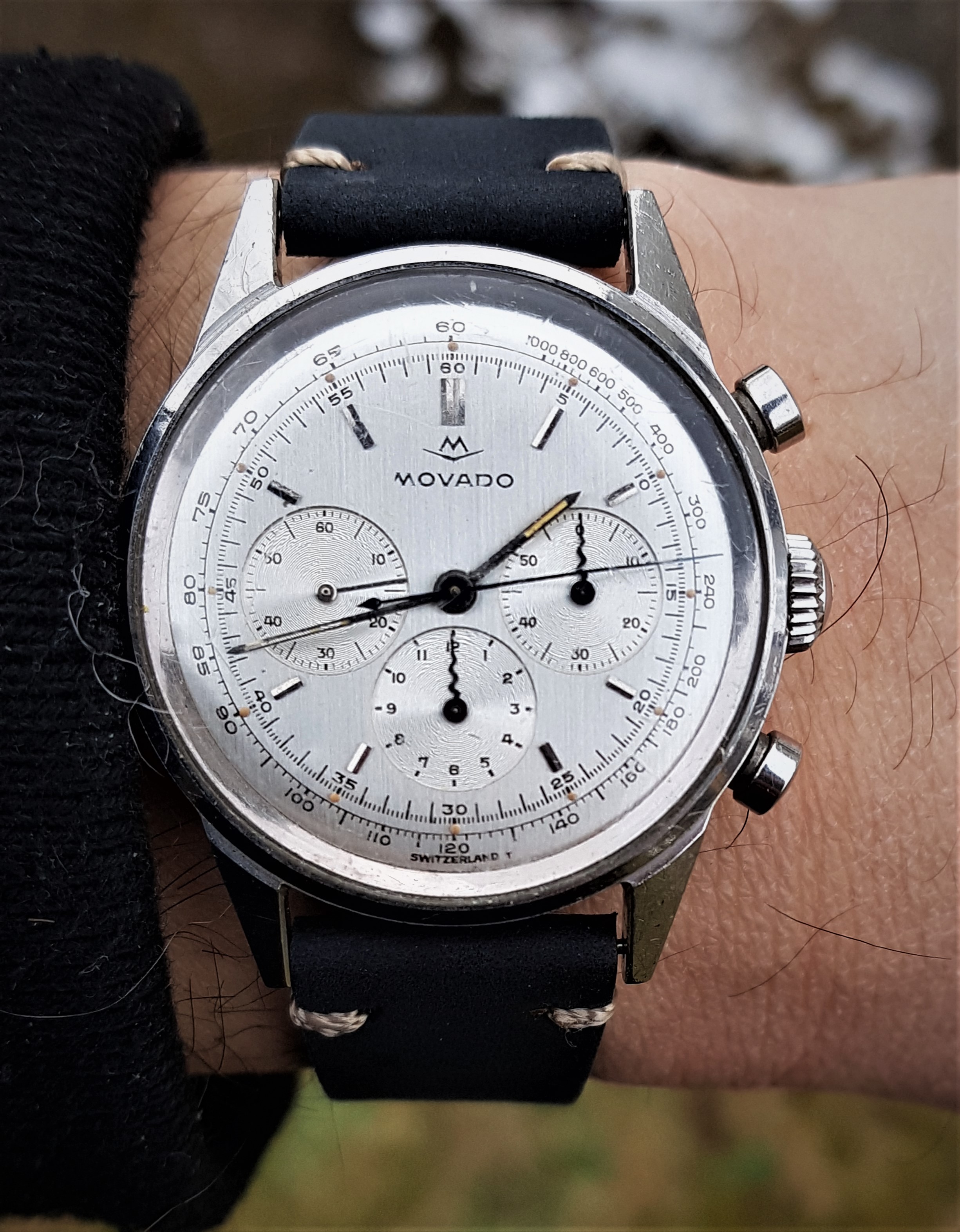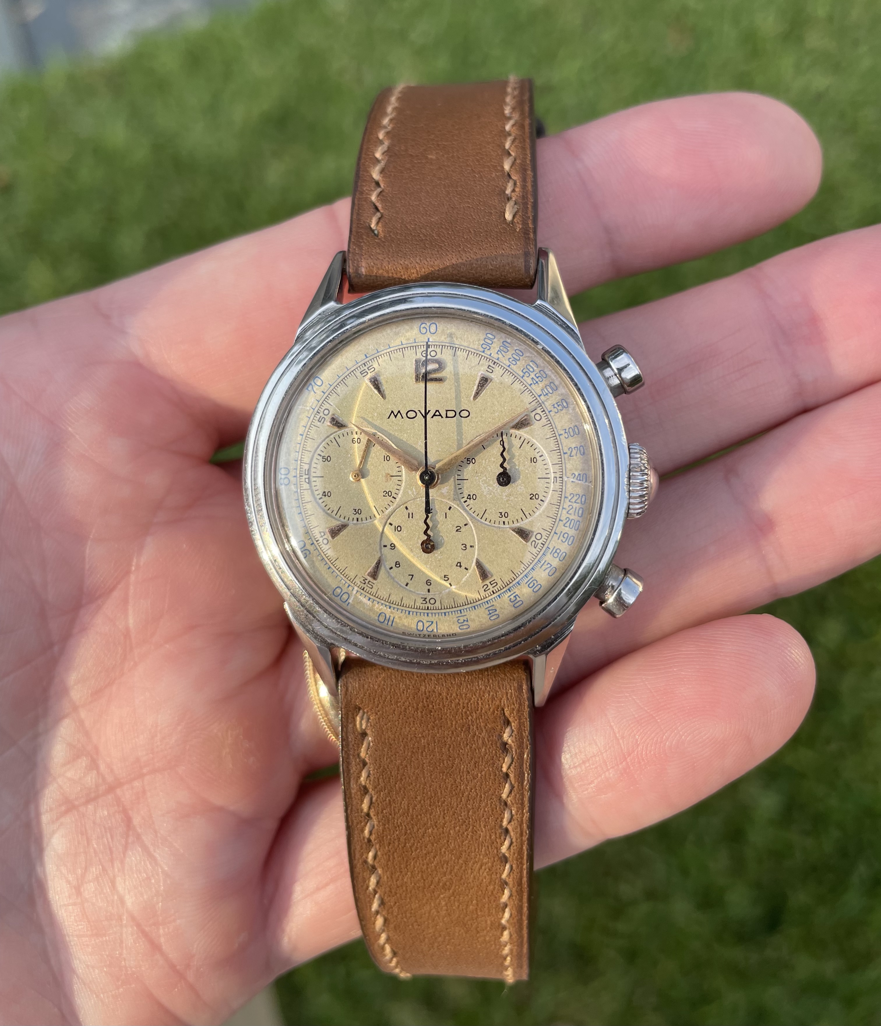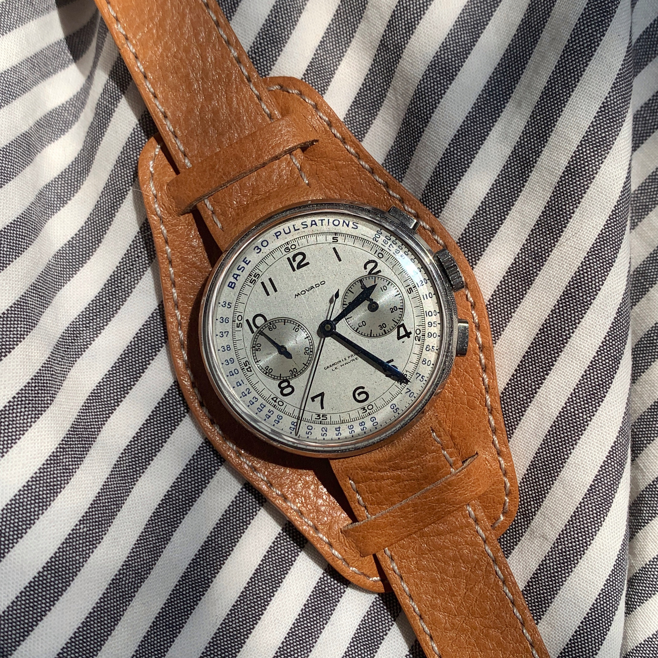 That looks so cool! The colour of the leather straps complements the dial perfectly. Not the biggest fan of the bund though.
