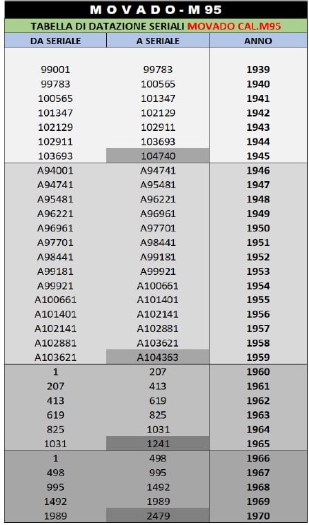 https://www.rescapement.com/blog/for-your-reference-the-movado-fb-95m ). In the piece the attentive author, regarding the seriality of the ref. 9038, at one point he writes verbatim: “The earliest number I have observed is 'A94380' and the latest in this format is '104832.' Note the lack of an A on the second number, at some point around '104300' the letter was dropped".