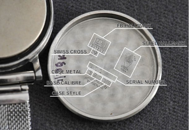 In The Movado History, p. 194, Appendix 1, Fritz von Osterhausen marks 1966 as such passage giving body (again) to the validity of the dating of the Movado chronographs proposed in this study. From '66 onwards, therefore, the references shown on the case backs of all M 95 models (and others) will bear the structure “XX - XXX - XXX” (here the example of ref. 95-224-568) :