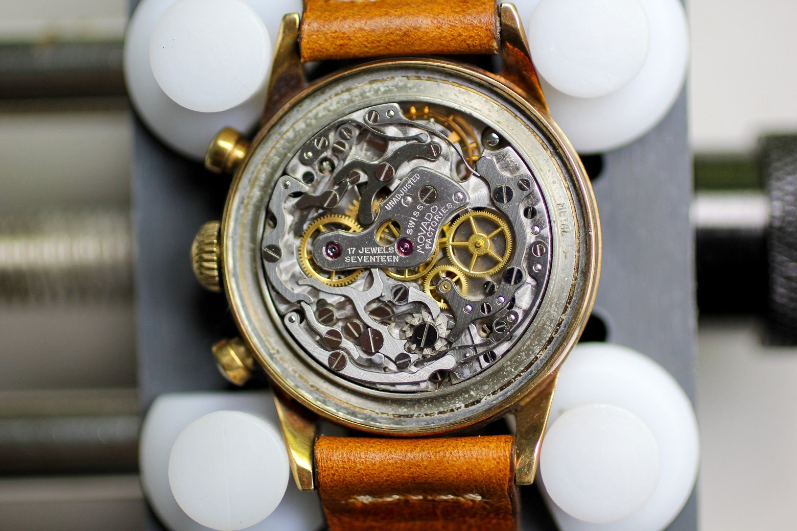 Movement / Functionality: The M95 chronograph caliber was the first modular chronograph movement to be produced and was utilized in continuous production for over 30 years after its introduction in 1939. Aside from being unique and horologically noteworthy, it is beautifully constructed (see last picture below) and capable of tracking up to 60 minutes, in addition to the running hours and seconds. I had the watch serviced ~5 years ago and it has been worn sparingly and in a deep rotation since then. All functions work properly and the watch keeps good time. As an FYI, this is one of the few chronographs that starts/stops using the bottom button and resets with the top.