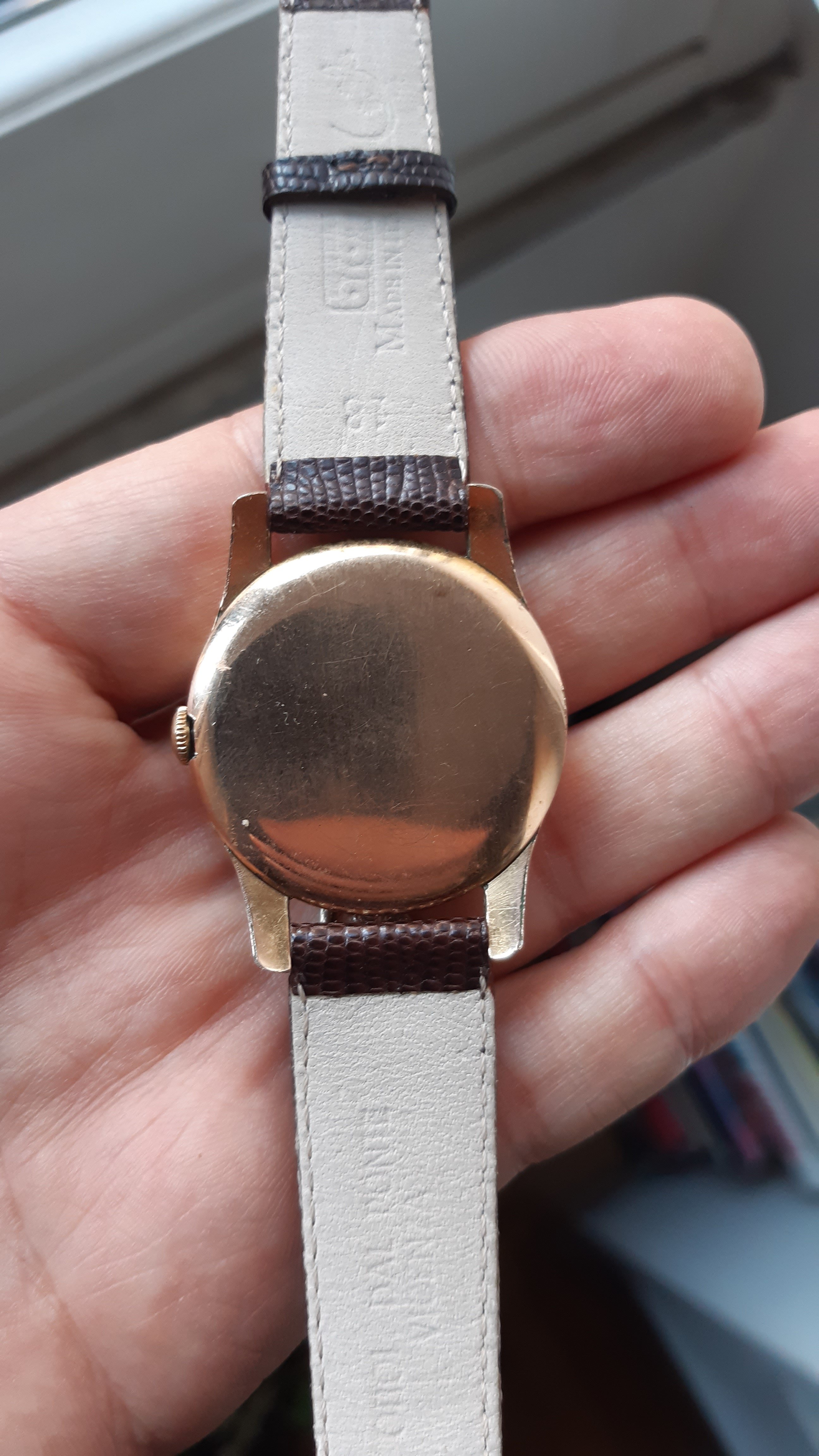 helped me to date this watch back to 1946. Reference is R64928, R6 standing for pink gold plating, which is unusual, being the majority of these yellow gold plated.