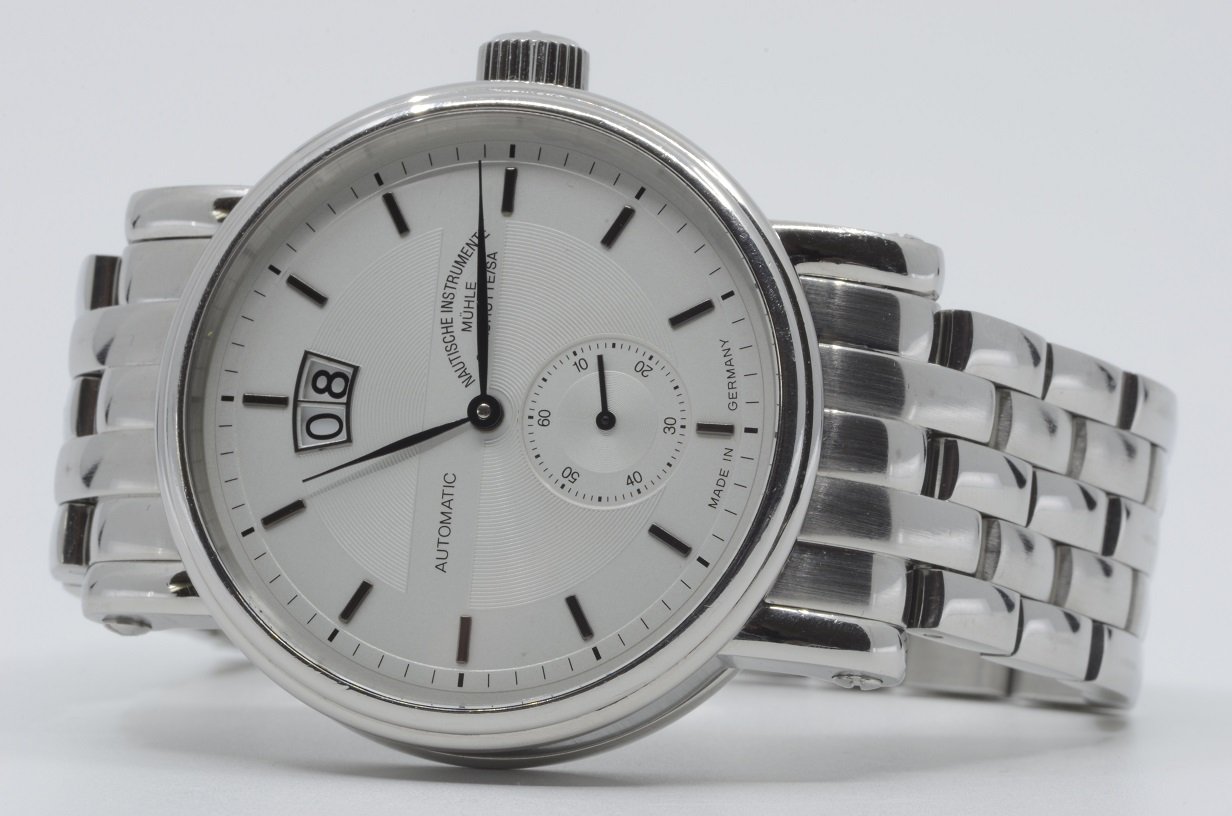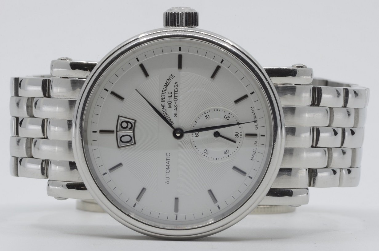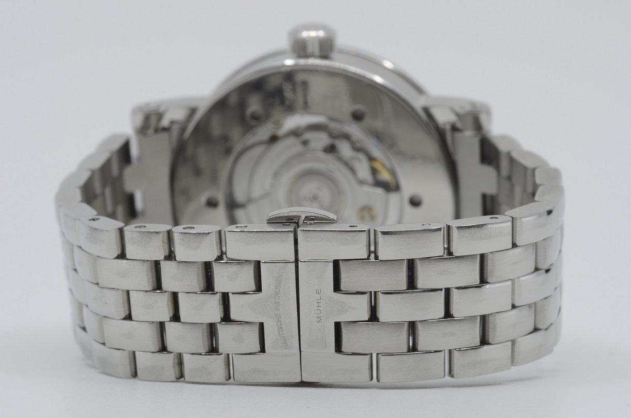 Condition: The Mühle Glashütte Teutonia Big Date was serviced in 08/2022 (service paperwork included). A thorough service was carried out including complete overhaul of the movement (the movement was disassembled, cleaned, oiled, adjusted) and replacing all gaskets. Watch was never polished/brushed. Hairline scratches present on case and bracelet, please see pictures.