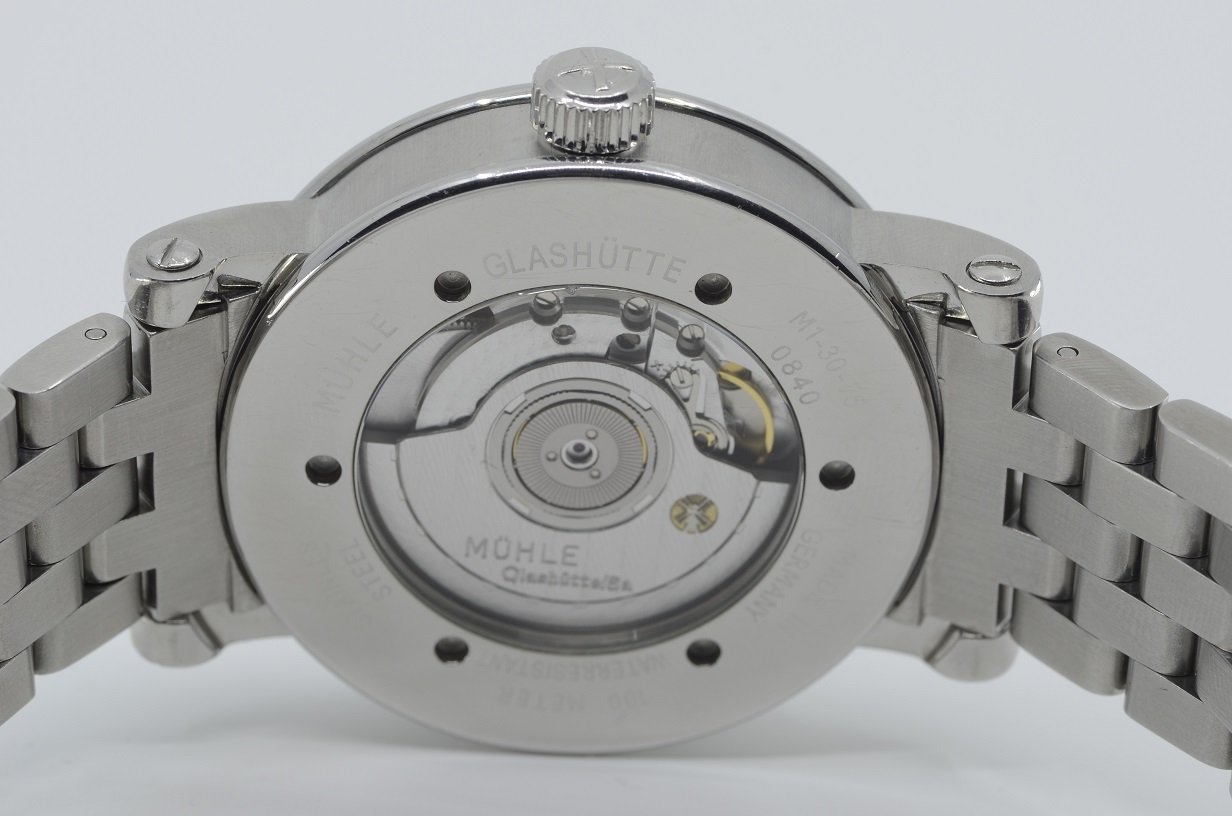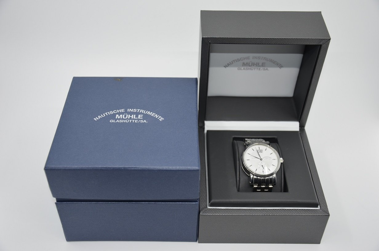 Watch comes with: Mühle blue outer box, Mühle grey inner box, watch, bracelet (Papers/warranty card is missing).