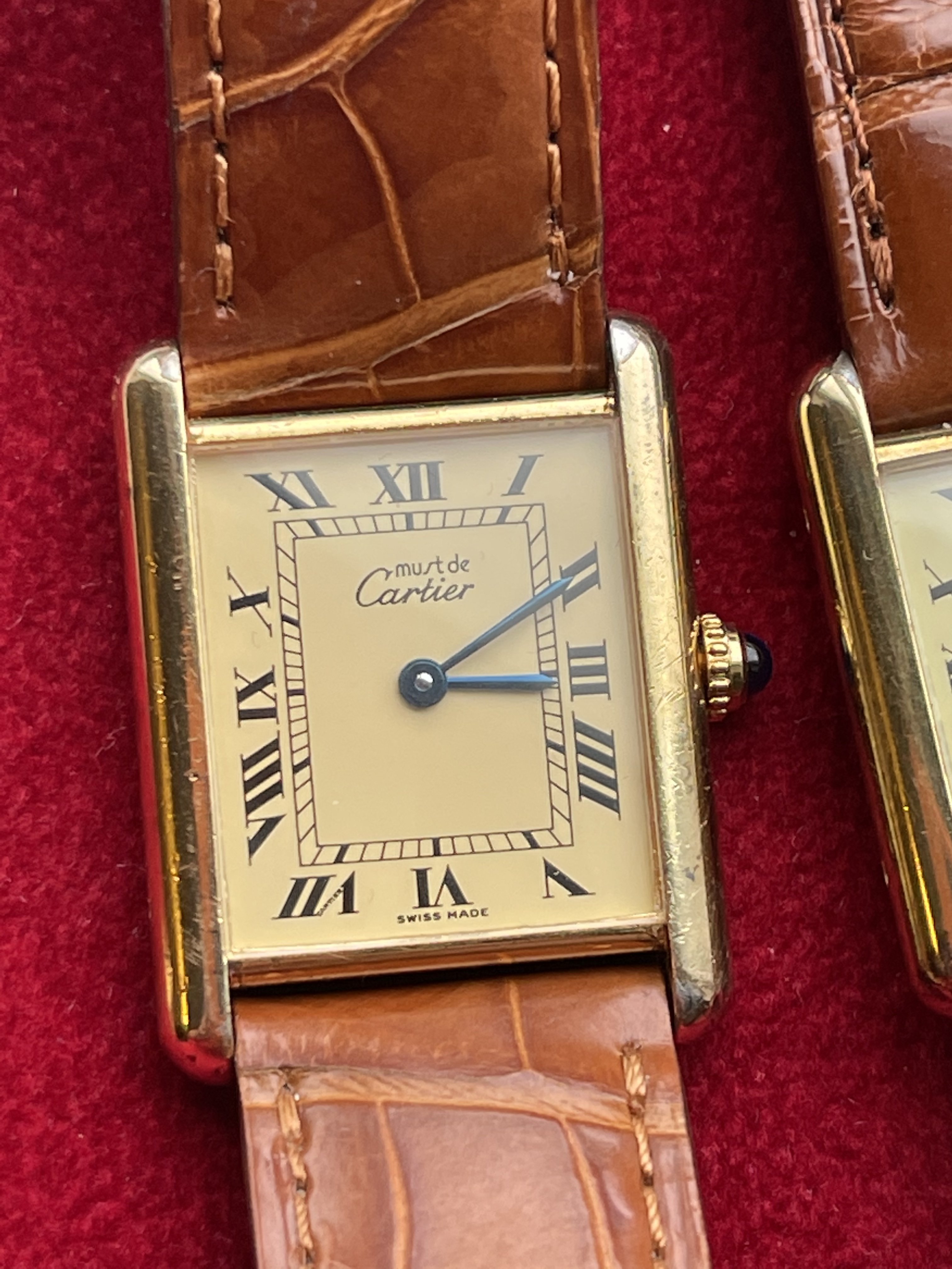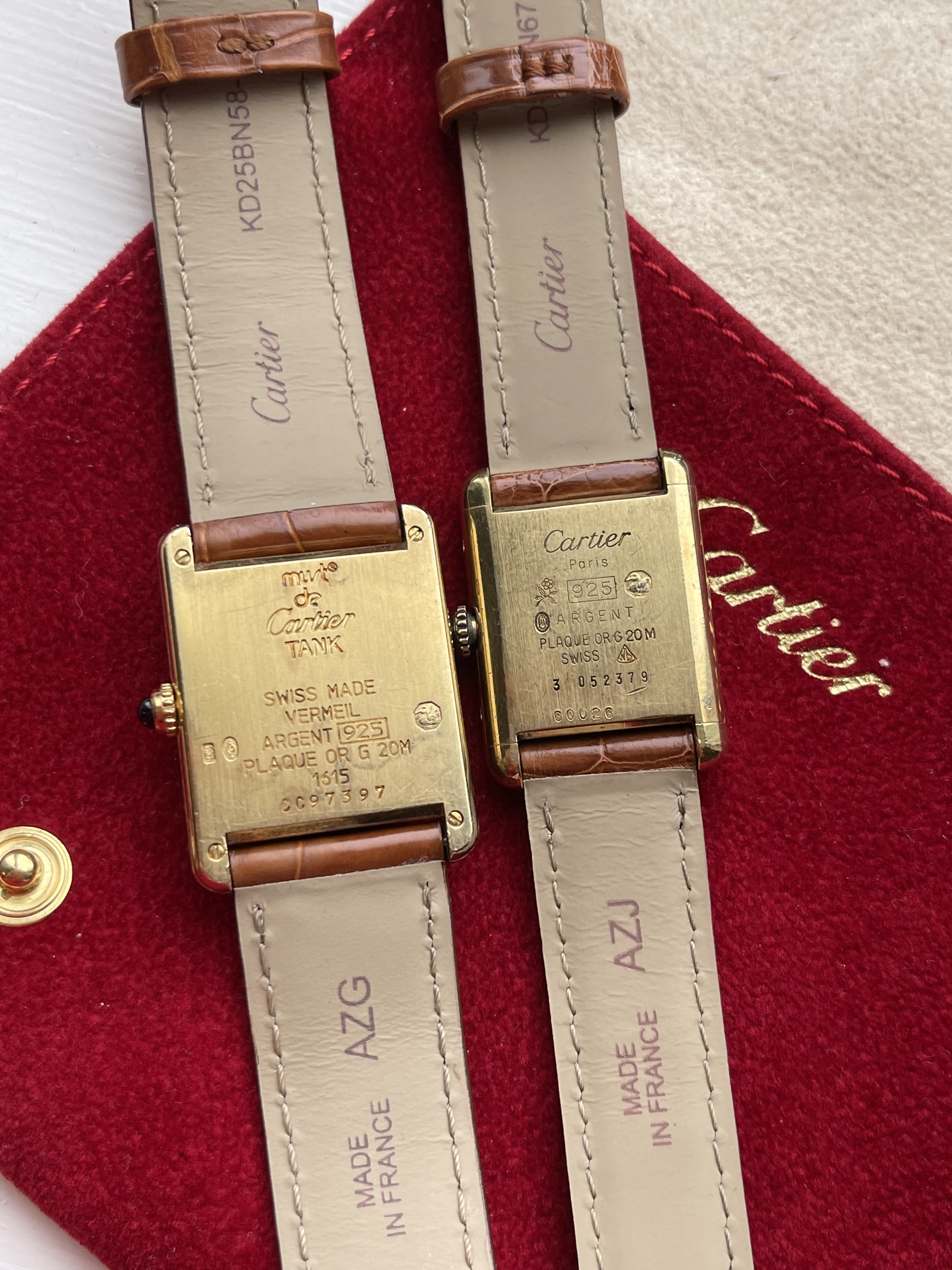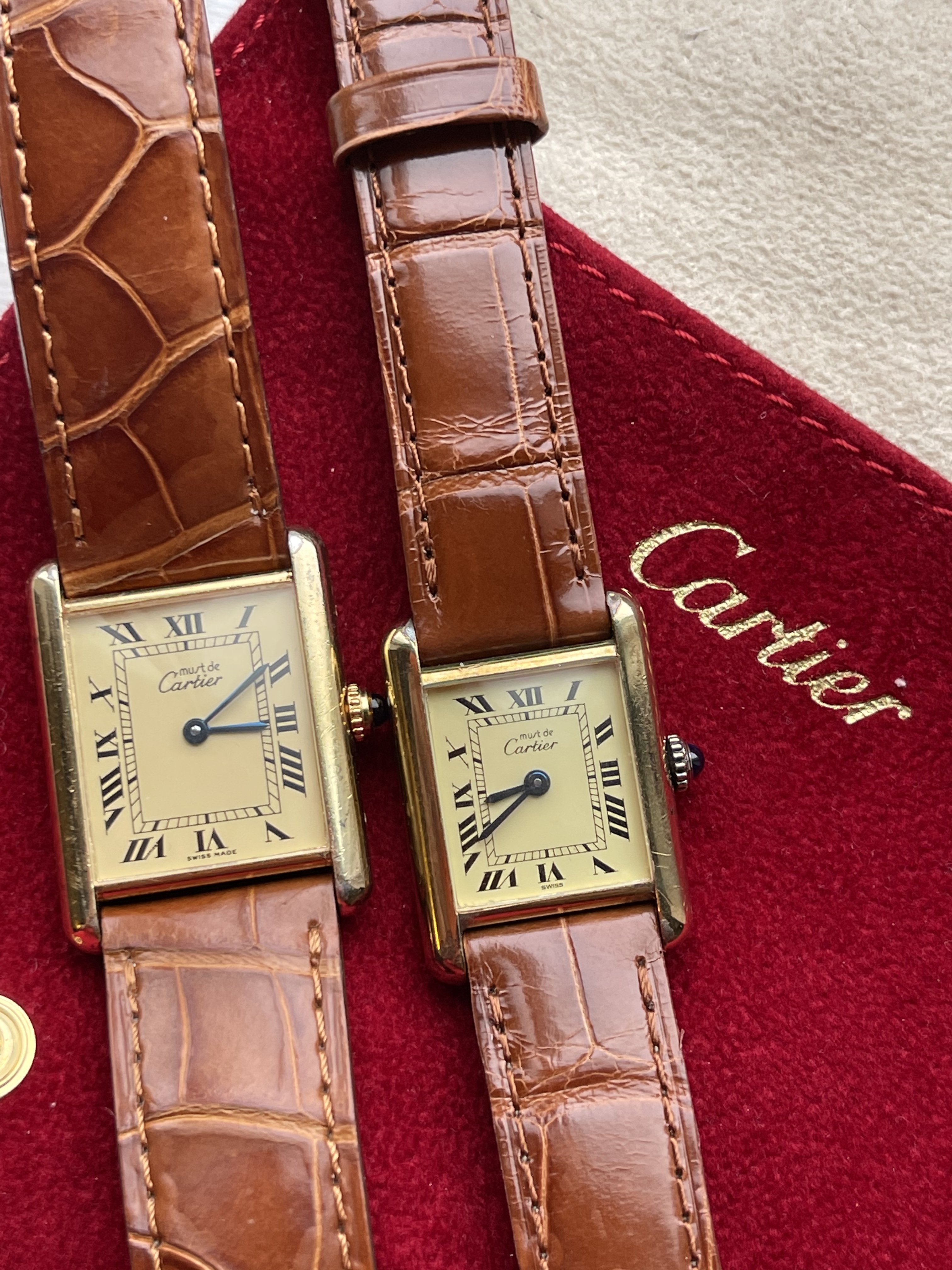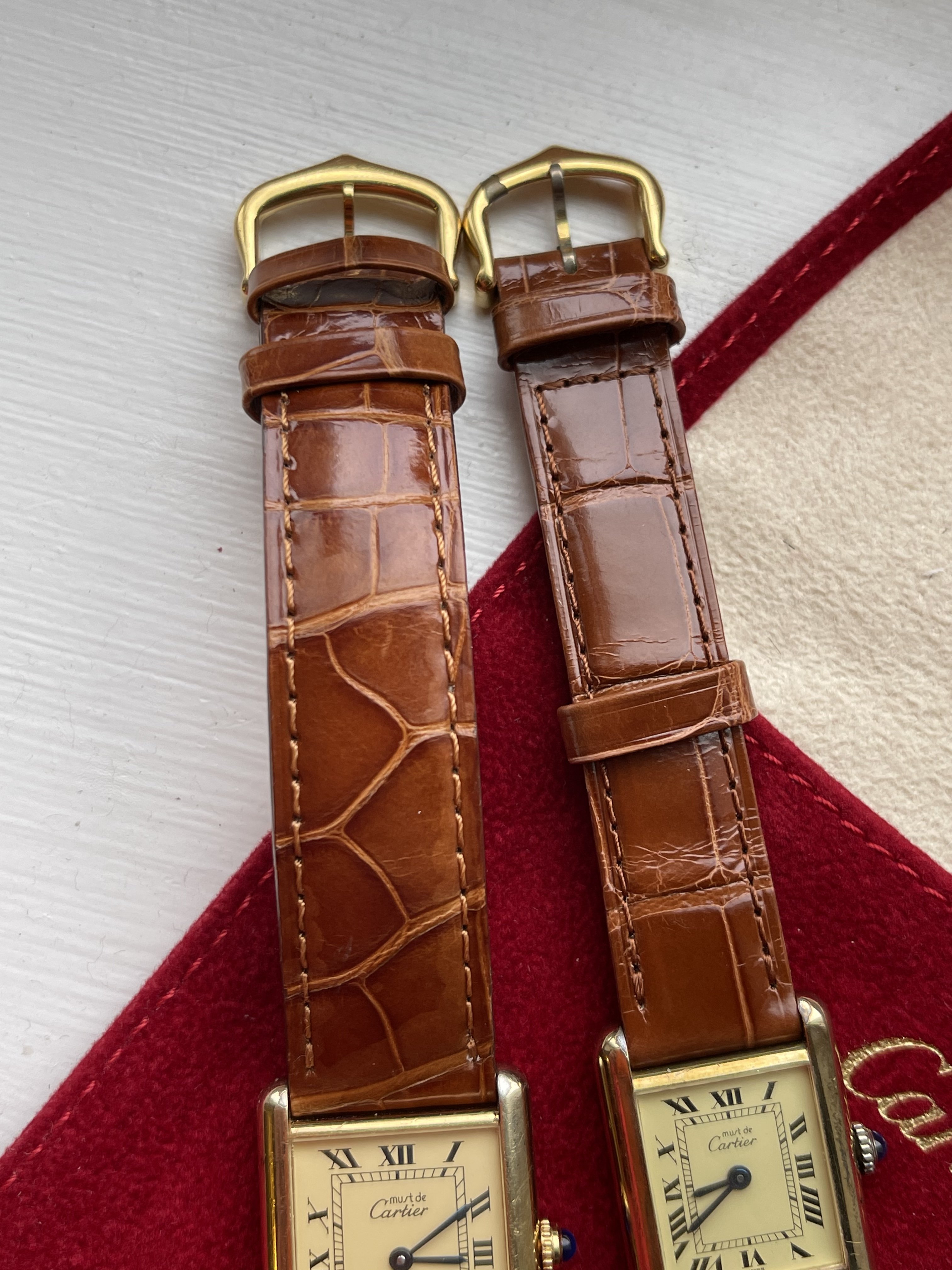 ·Up for grabs is a great matching Cartier tank set. Both are the gold over silver models. Condition is overall good. Comes with Cartier pouch and Cartier signed leather straps with little use but look modern. Unsure about service history but given the straps and the pouch it could be recent but don’t want to speculate. Quartz movements.