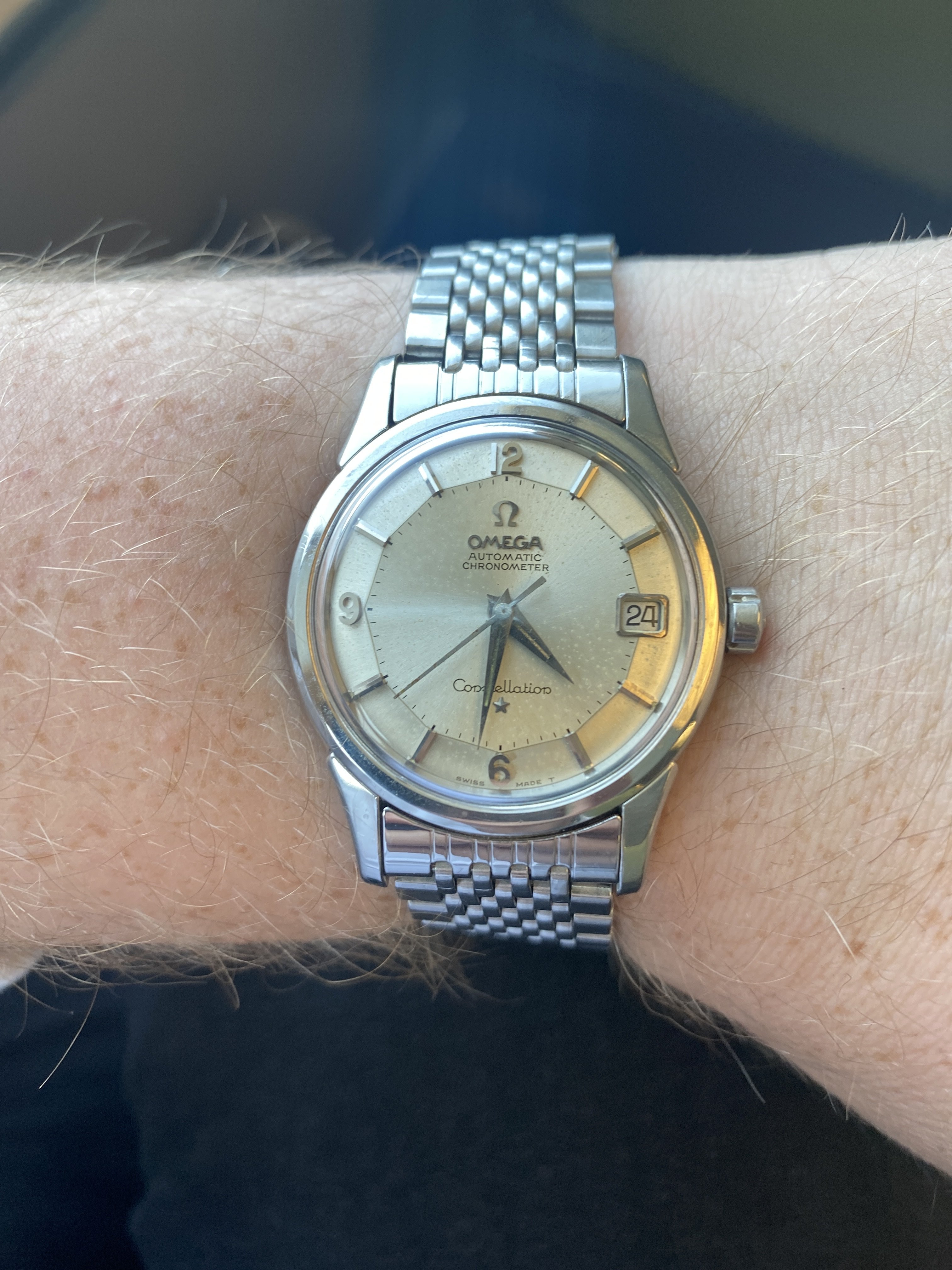 This is my 1961 Omega Constellation Pie Pan, ref 14393 6 SC with original papers and certificate of high precision denoting especially good results (the highest grade of certification given). It also has a vintage Omega box though I do not know if this came with the watch in 61. I spoke with the Omega Enthusiast previously and he said it may have been original if the boutique ran out of the standard box (apparently not unheard of) .. anyways, I digress, This watch was purchased on December 22, 1961 by the original owner as shown in the warranty book, the serial number denoted matches both the movement and chronometer certification and as I’ve been wearing it as my daily the last few months, I can tell you it keeps fantastic time. The dial is in original condition with applied Arabic numerals (a personal favorite) and it has not been refinished. There is some nice patina on the dial that only adds to its charm. Regarding the T mark, according to Desmond of the wonderful Constellation Blog who was kind enough to answer a few questions I had “The legal cut-off date for the use of radium was in 1962, but there is evidence Omega was using tritium in dials earlier.”. The crystal is new (had a recent service) and the crown though not original (unfortunate) is vintage and Omega. The 10 sided original crown came with the watch when I purchased it though the threads are not good hence the replacement. The case back is worn from many years of love and wear and the beating heart of this watch looks wonderful, is a calibre 561 and the serial number is very clear and visible. It is currently on a later 7 bead Omega no12 Beads of rice bracelet which completes the piece nicely. Lastly, the BOR bracelet had end-links that weren’t quite right when first added, that problem has now been rectified but for you eagle eyed viewers that is why some pictures have additional gap. Thank you all for reading! I hope you enjoy. Cheers