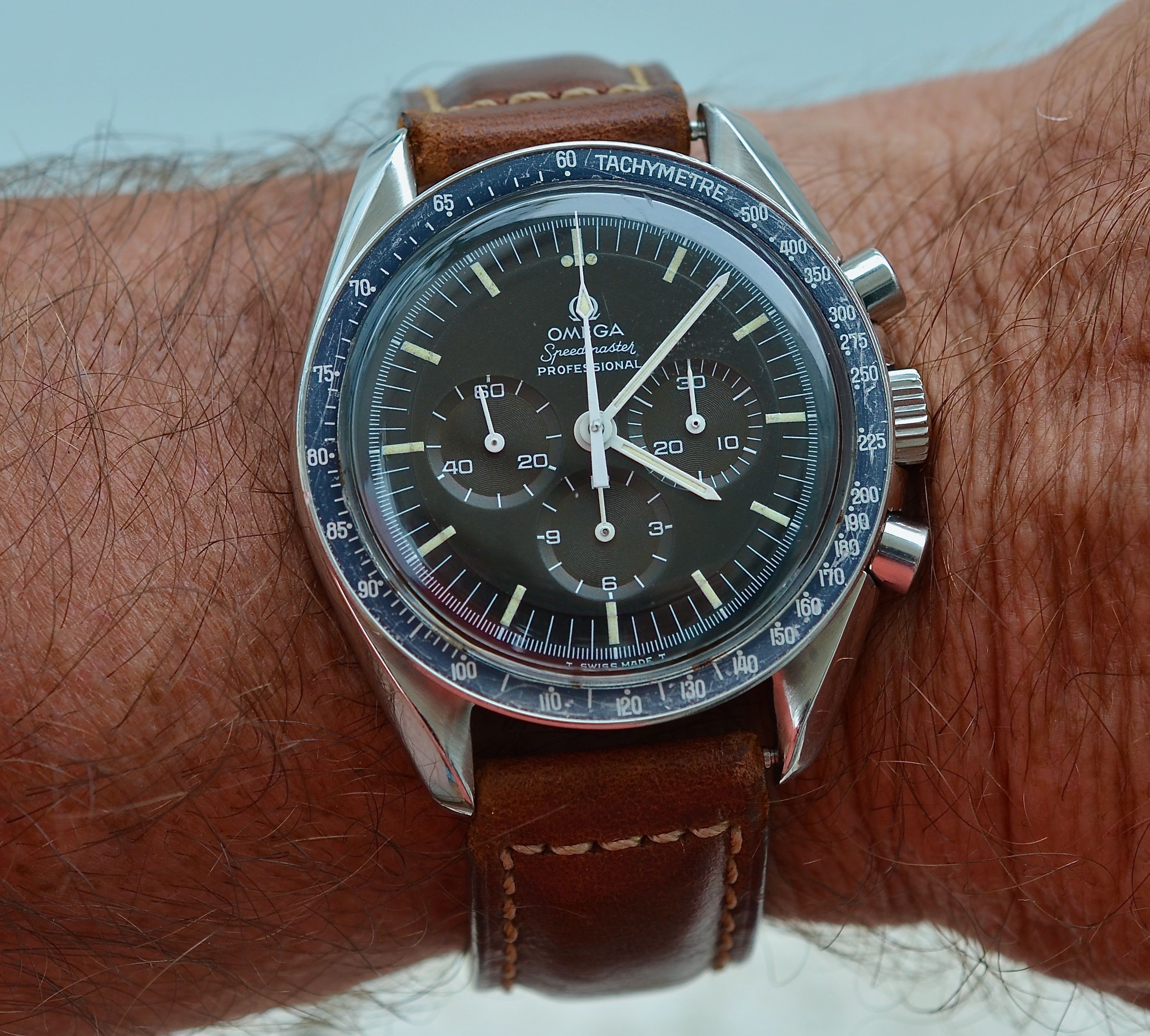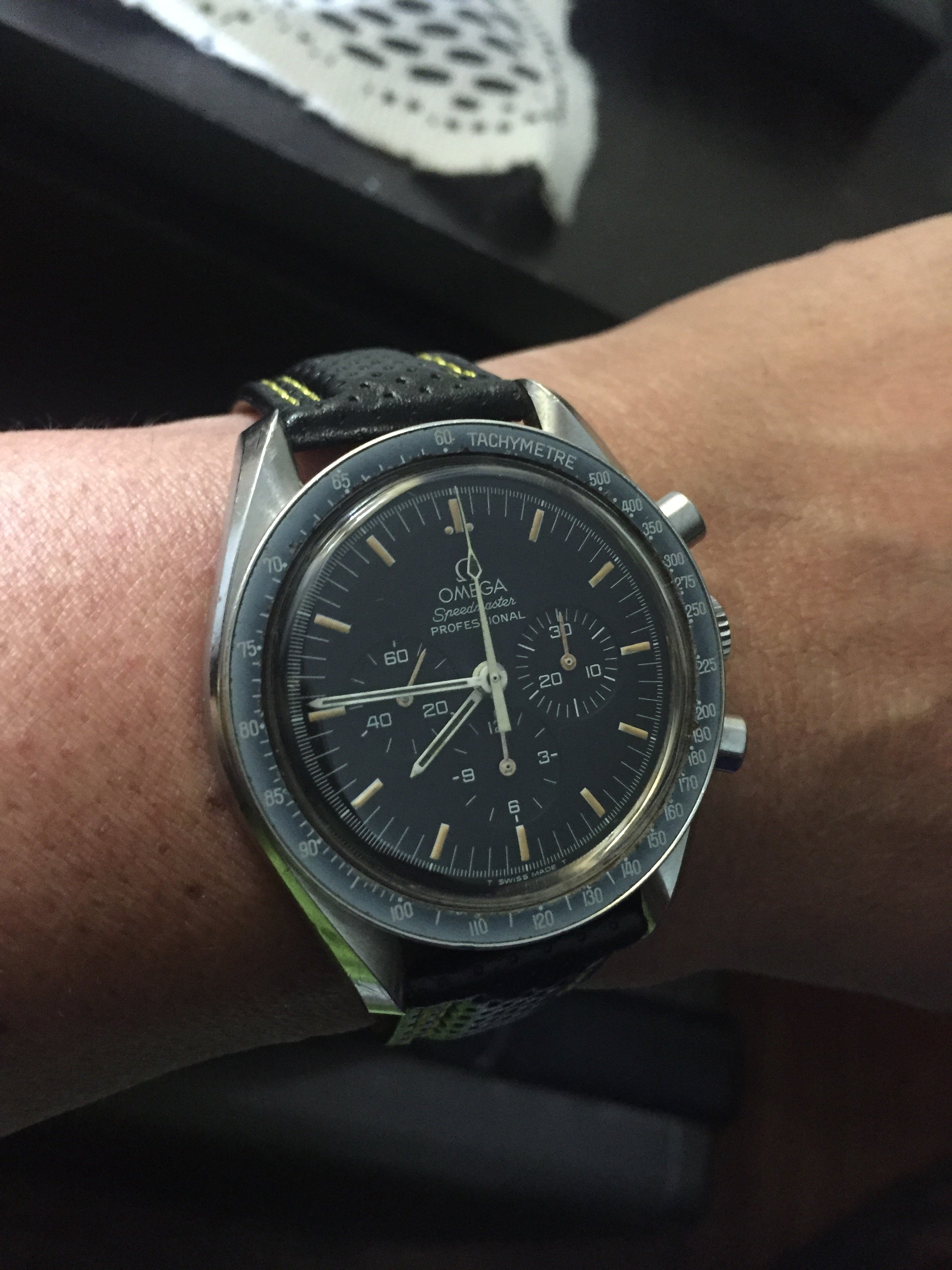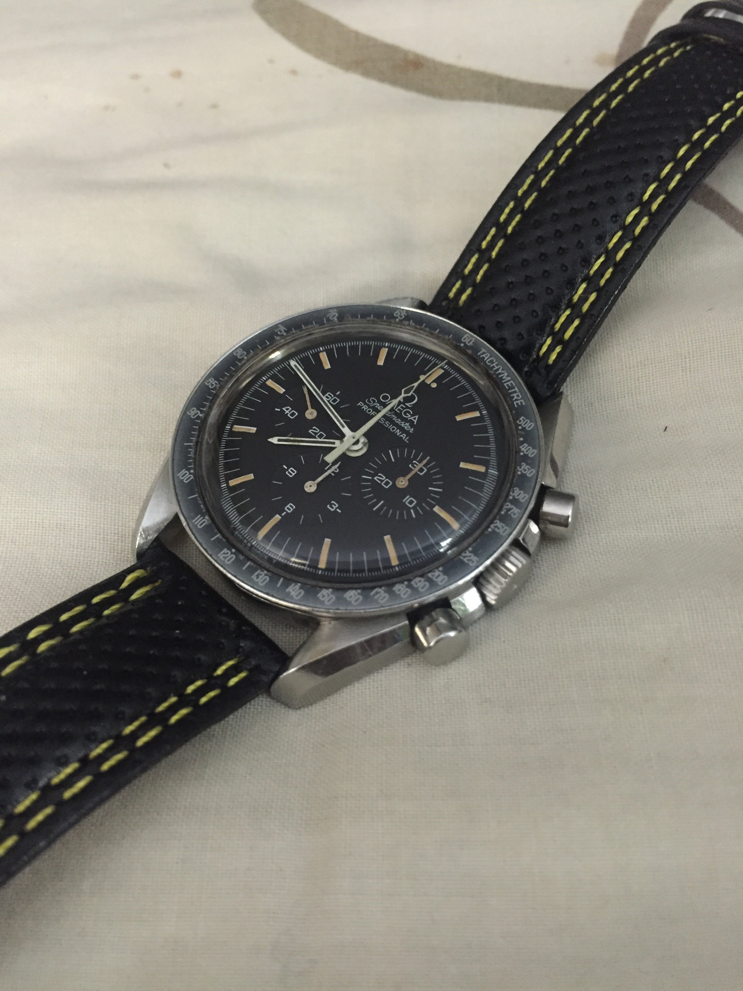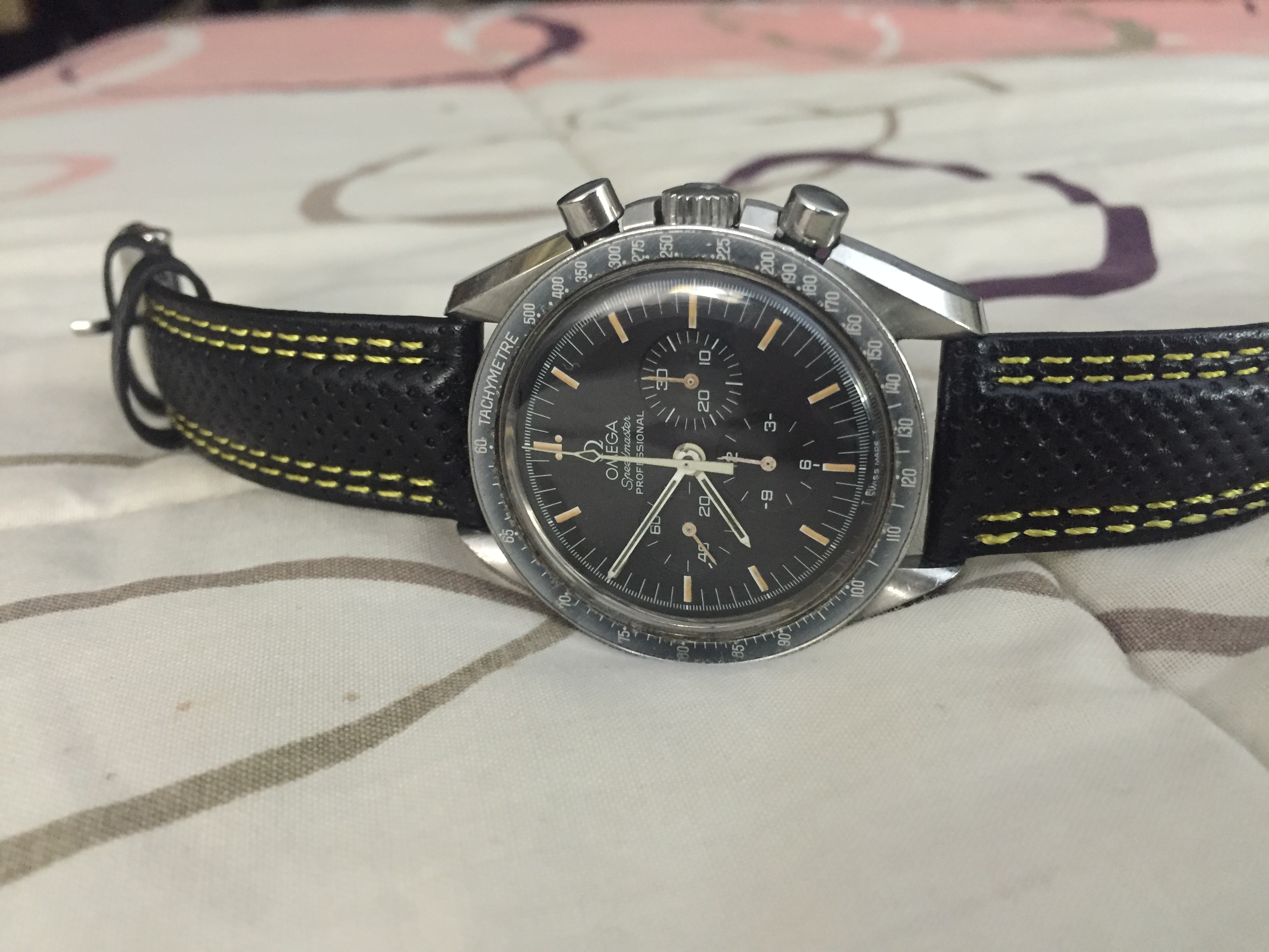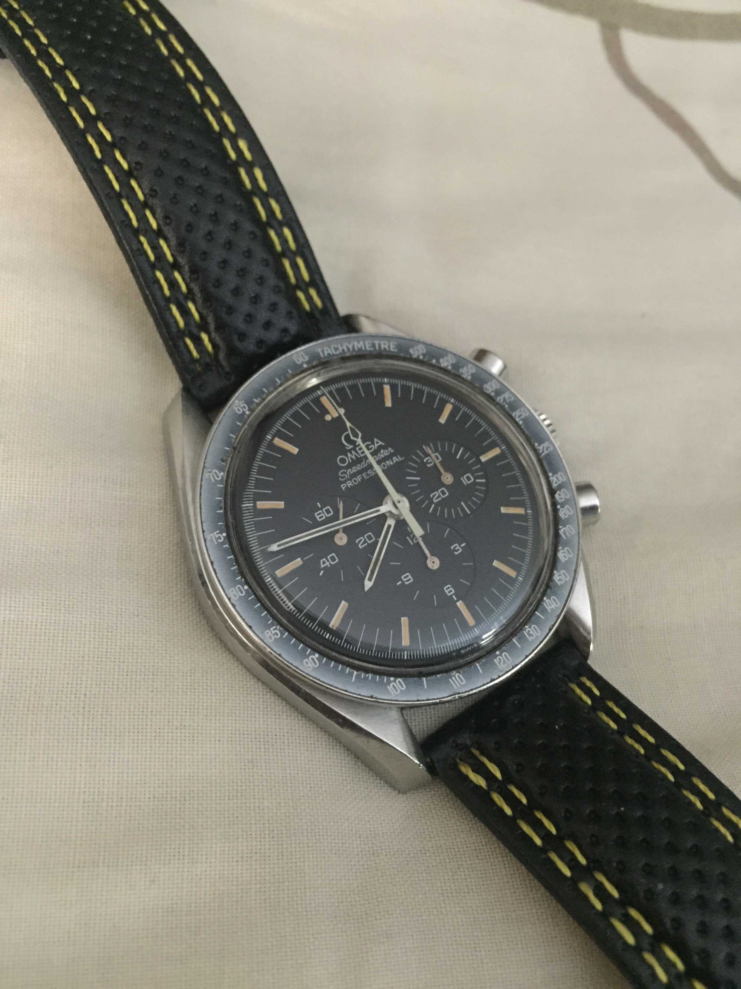 ·I have had this 1969 Speedmaster for more than 10 years and a safe queen for maybe 8 years. During the covid pandemic lockdown, I took out some of the watches from the safe. I was quite surprised by the nice patina that developed on the hour markers on this particular Speedy as it was much lighter before its hiatus. I decided to changed the steel bracelet with a black leather strap with yellow piping which matched well with the watch. Its now part of my watch rotation.