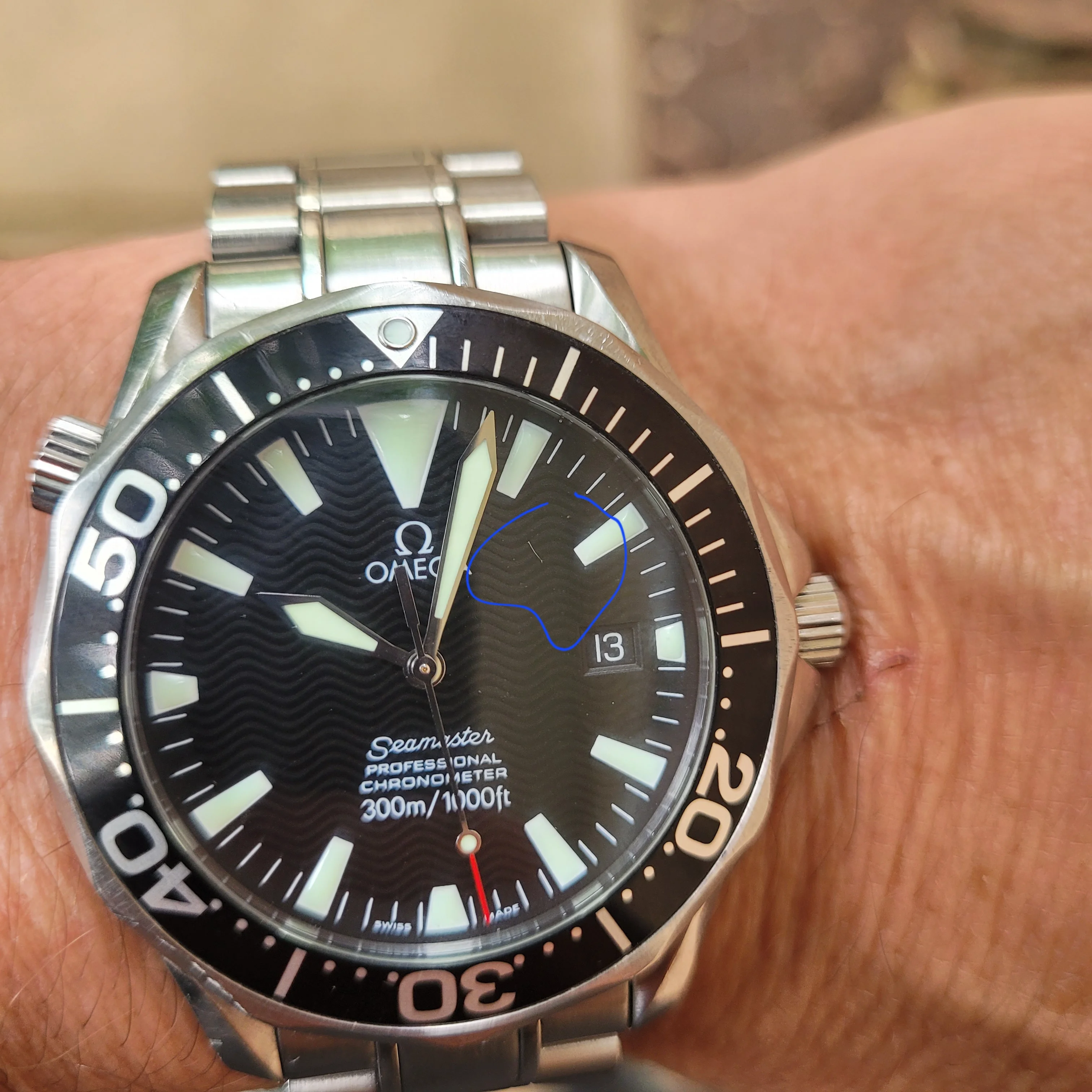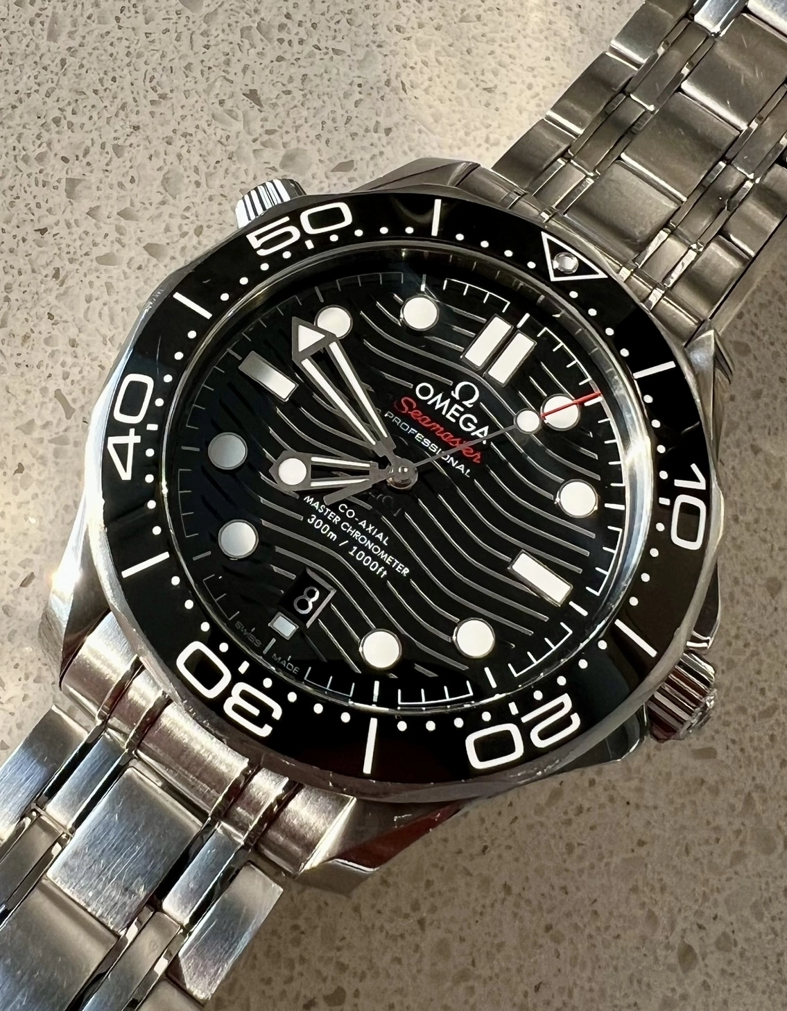 To clarify, I'm jealous because this is my Seamaster 300. I can't bring myself to spend more then $2500 for a watch for myself. If you look close it has a hair in it. Going to pick it up tomorrow though hair free.