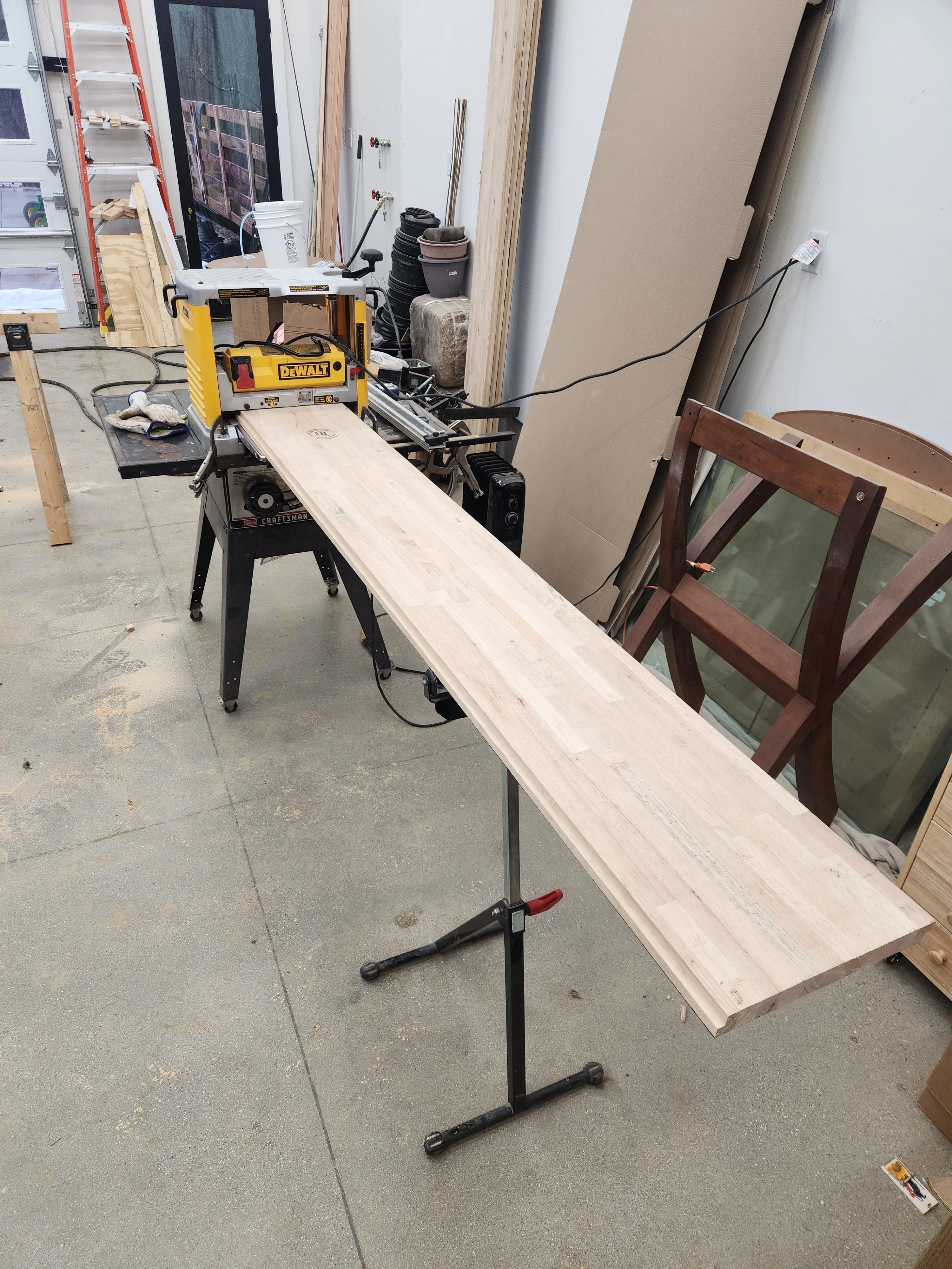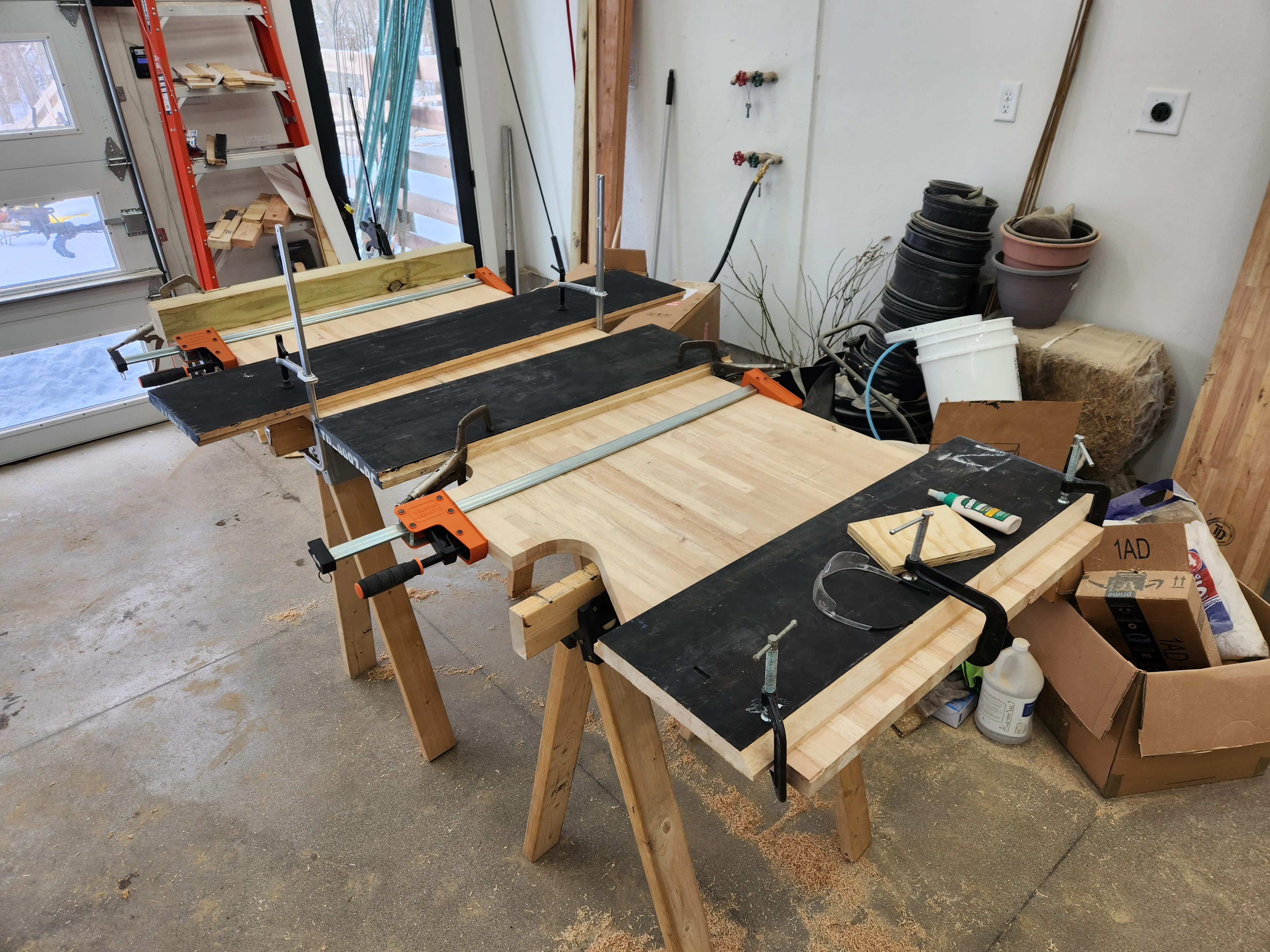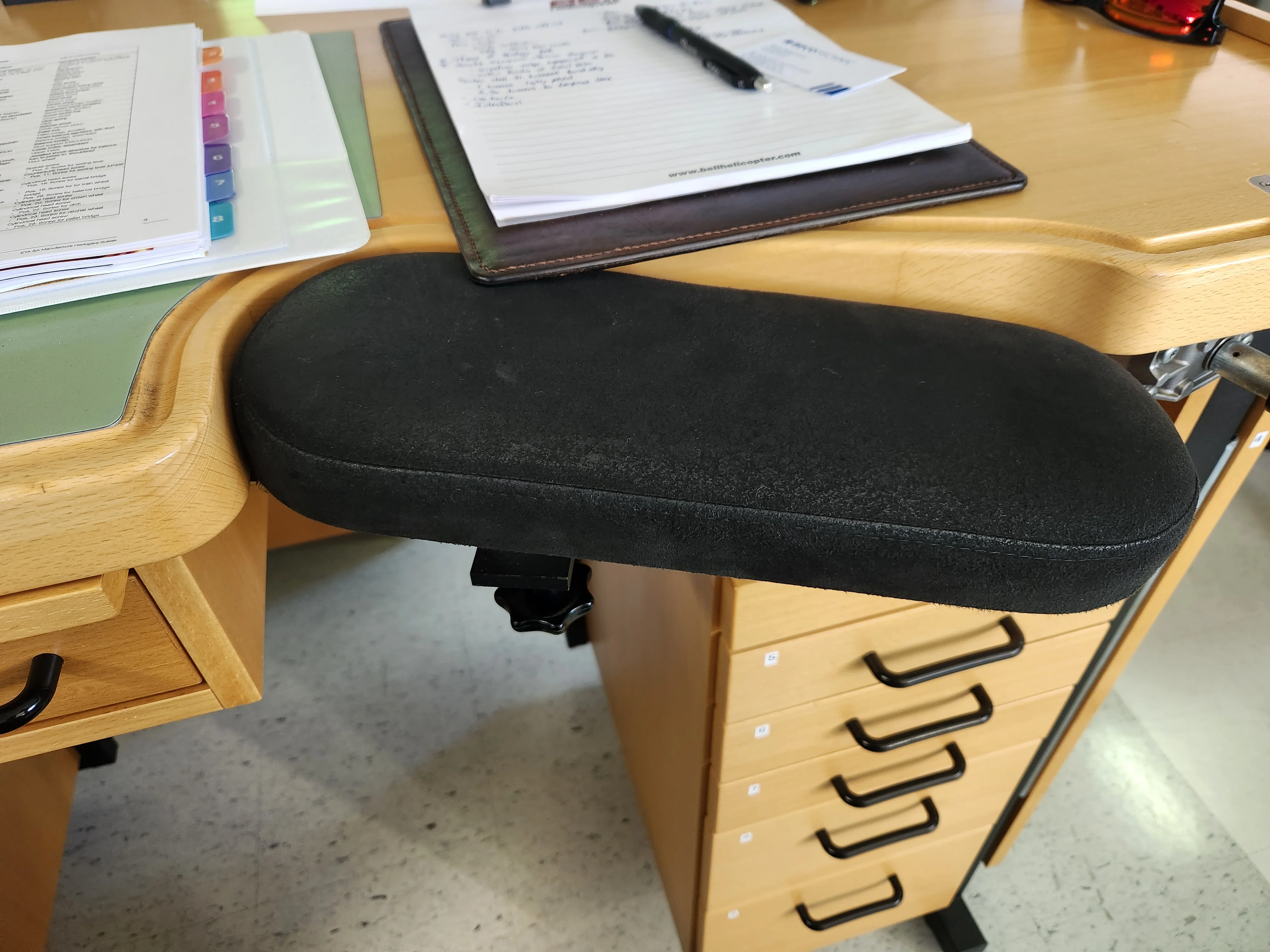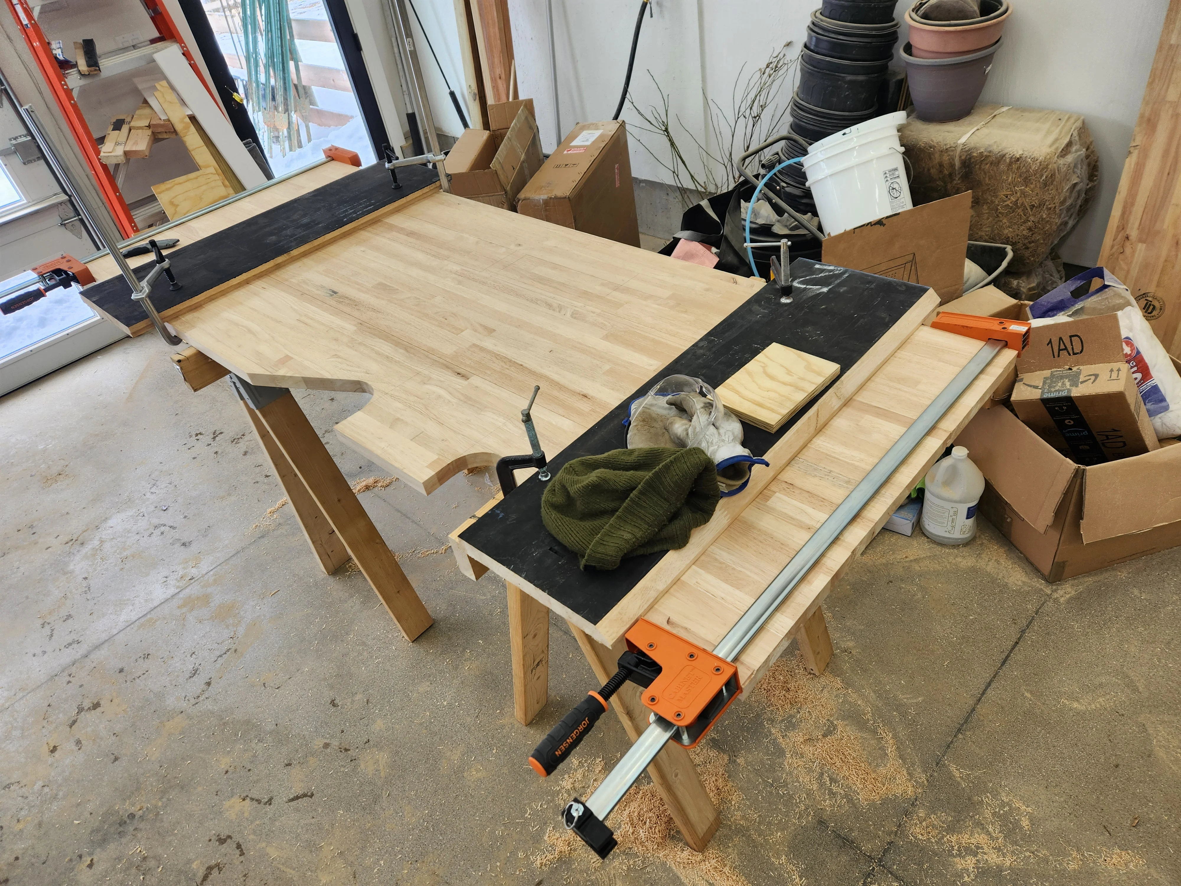 For the bench top, I had a bunch of left over “uninstalled tractor trailer flooring” I had sourced for my garage workbench. This is all hardwood laminate, mostly maple I think, and comes in 12”x 1.5”x 12’ boards. I mimicked the layout from a standard watchmakers bench for the arm rests.