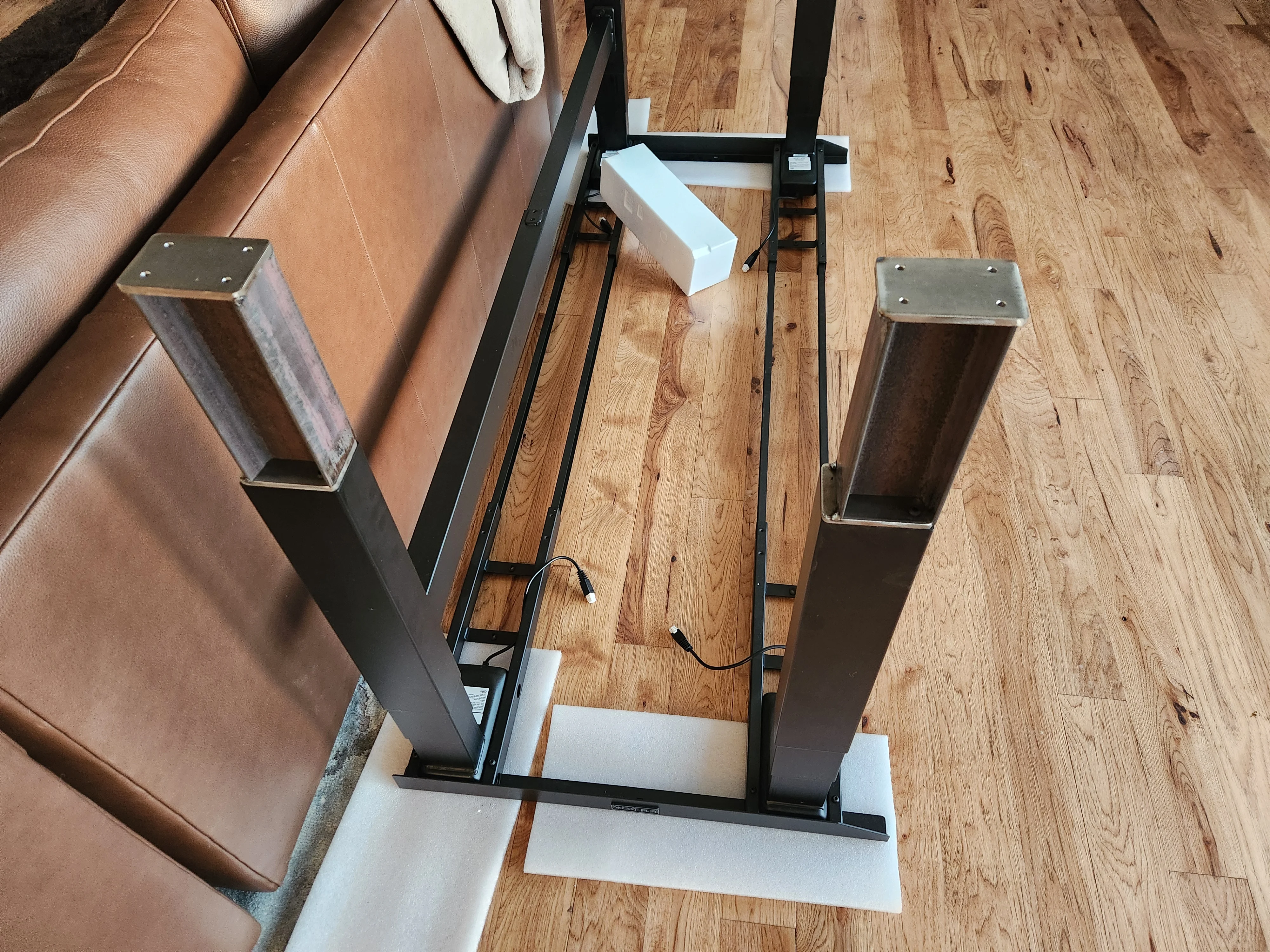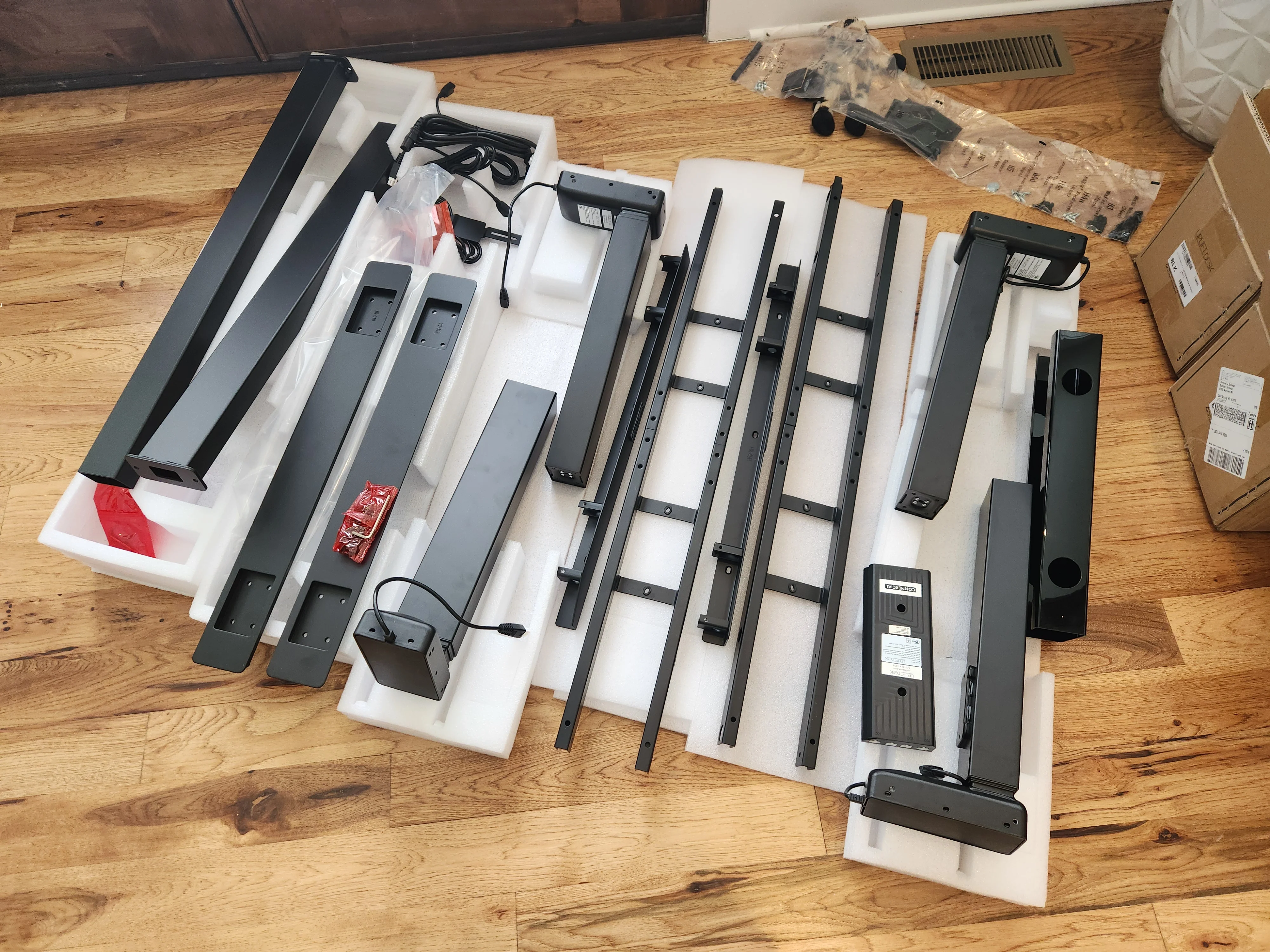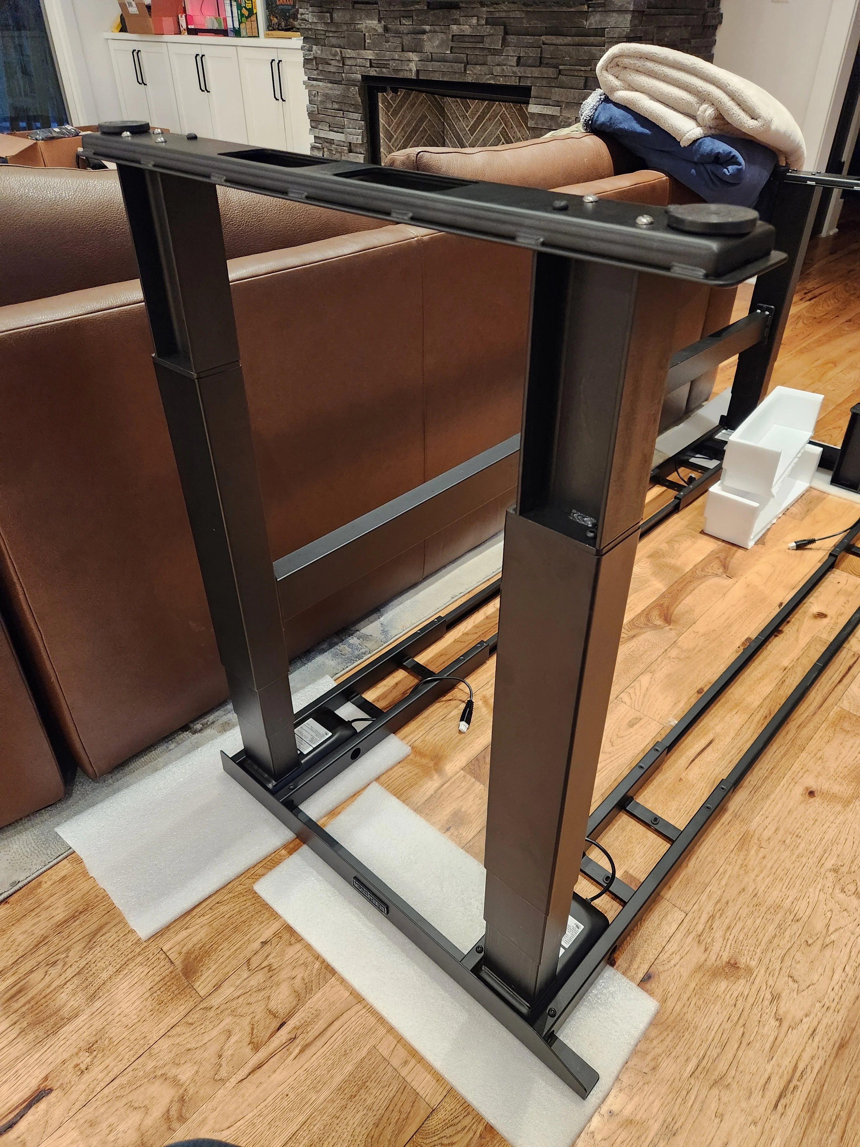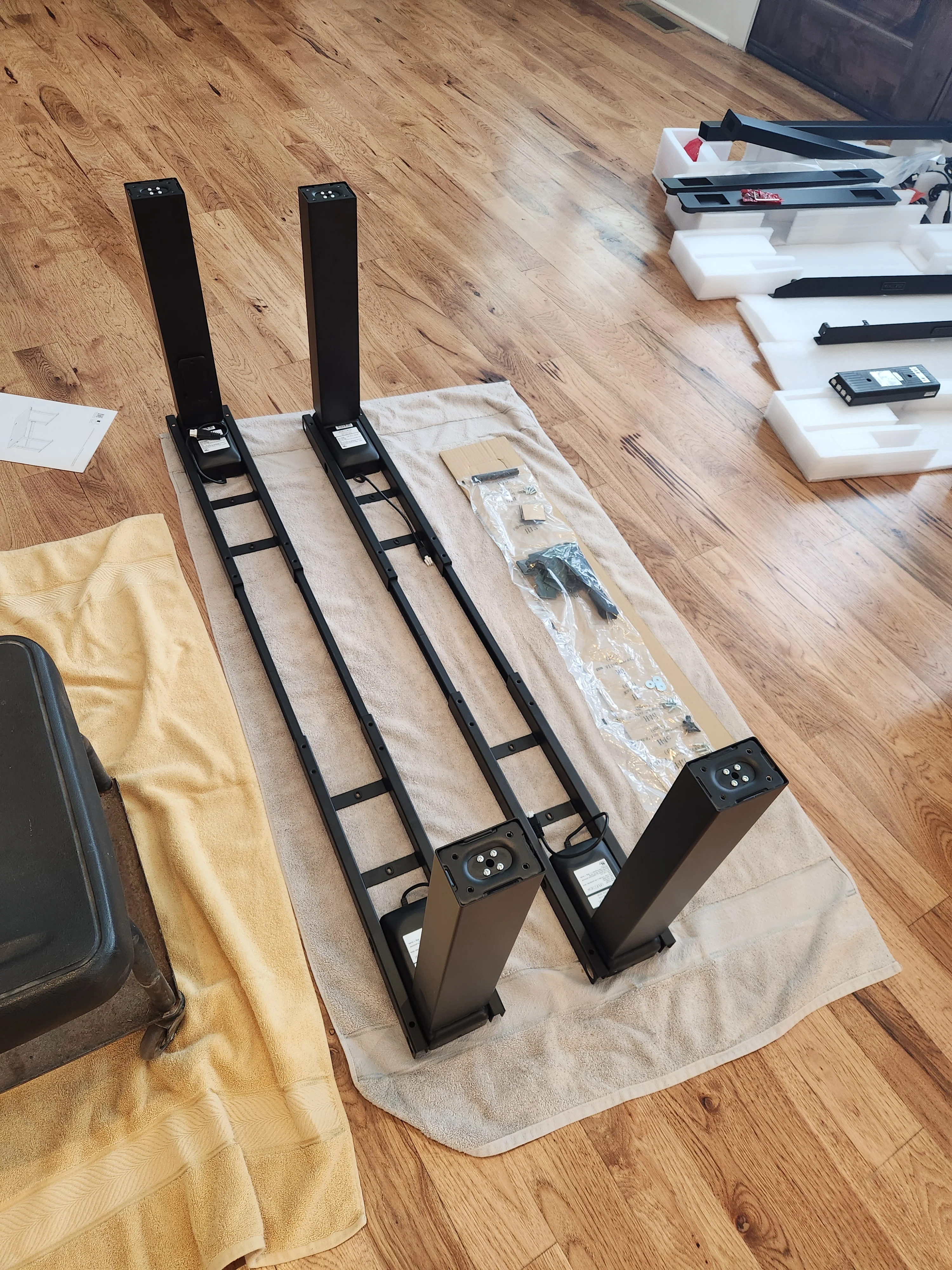 The frame. Purchased an UpLift industrial v2 4-leg/4-motor frame. linky This was the most costly bit of the whole project. A savvy pennypincher can find these identical components on AliX and Alibaba for a LOT less. But I didn’t know what I needed starting out and decided it was the easiest way to go. It is capable of 1000+lbs lift. The only downside is it only maxes out at like 52” height. I will address that below.