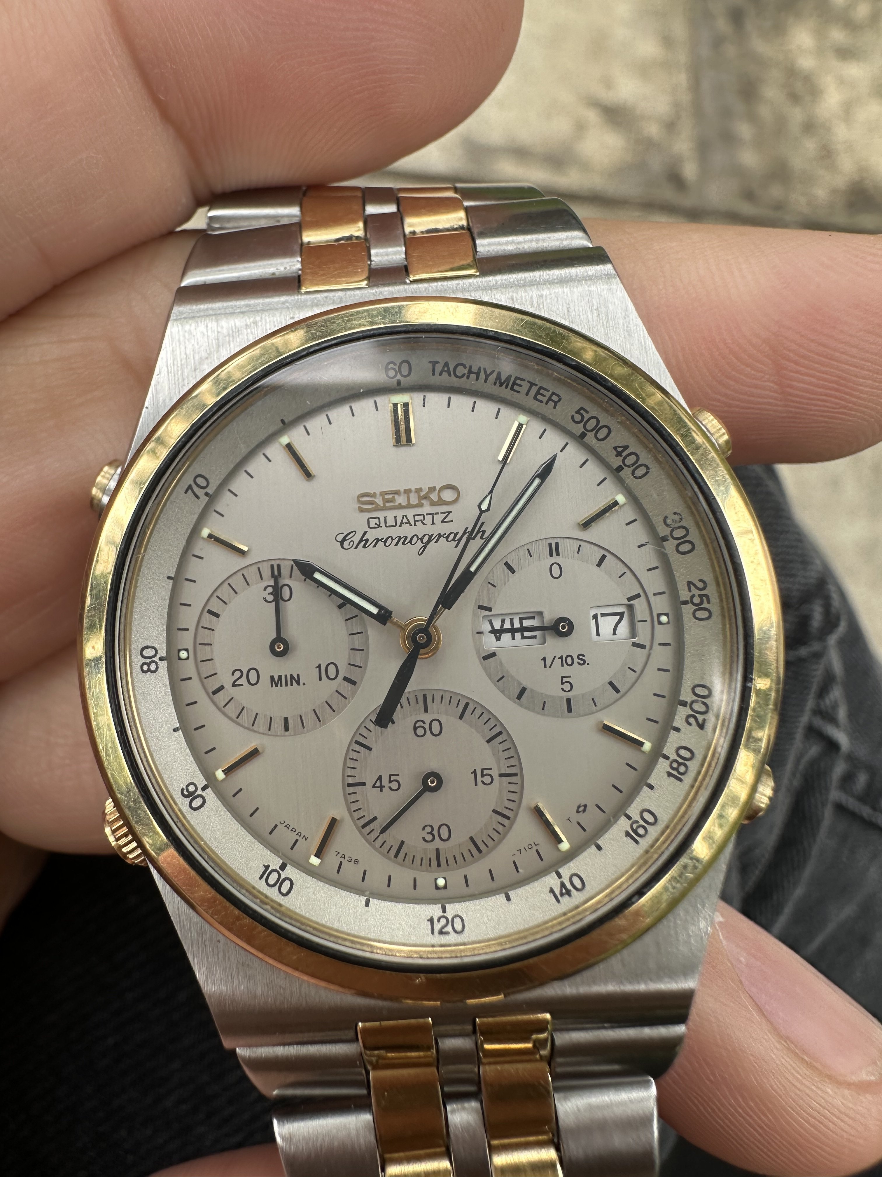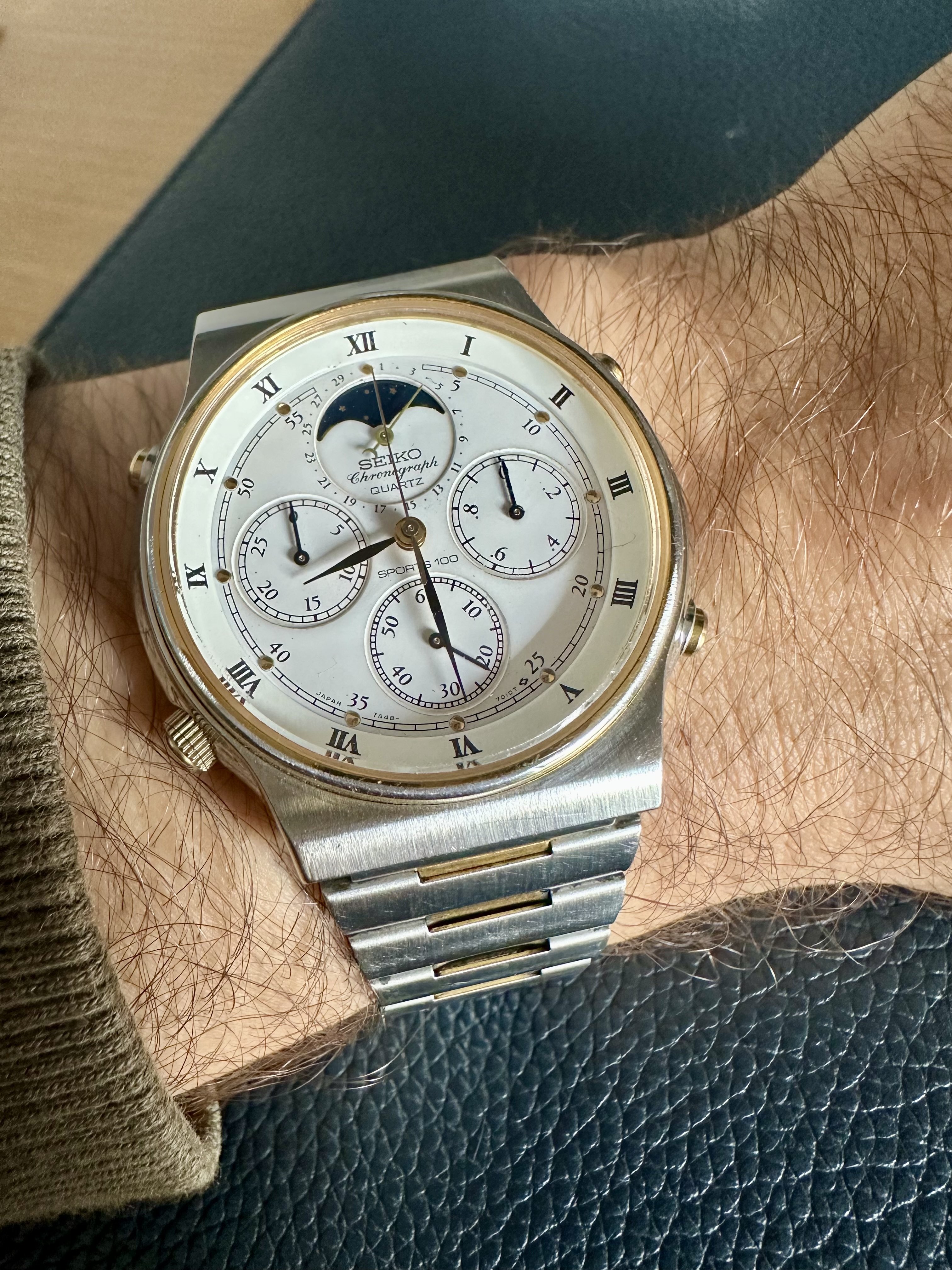 When my Dad passed away 20 years ago, my Mom kept the last watch he had worn, and it was his own Seiko chronograph. I had vague recollections of what it looked like, but I certainly couldn't point to a specific model for sure. I was not even sure whether it was a 7A28 or a 7A38. All I was sure of is that it was a two-tone model with a dark dial.