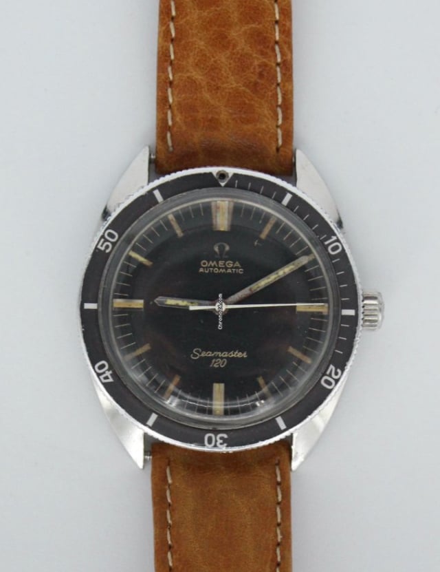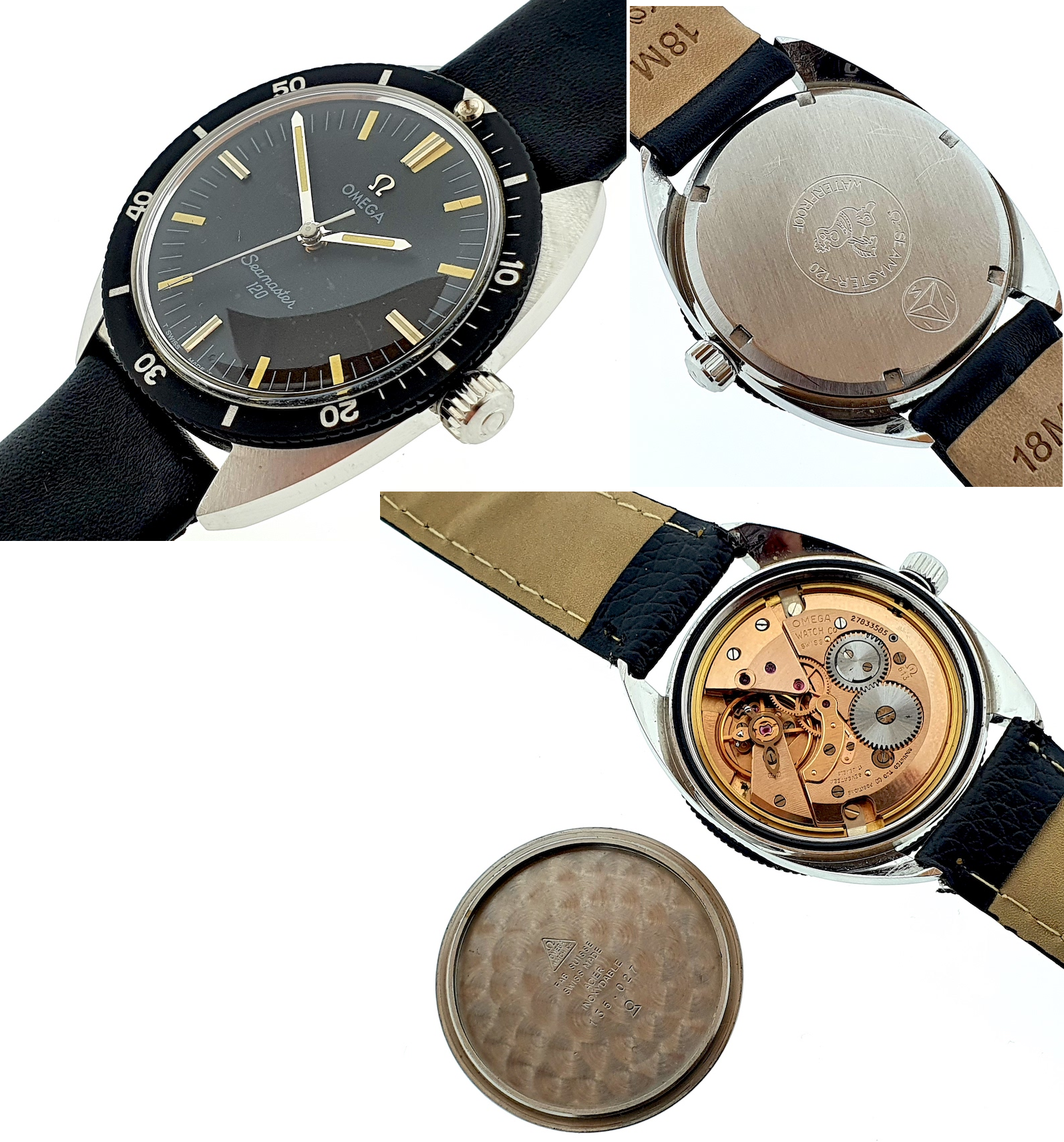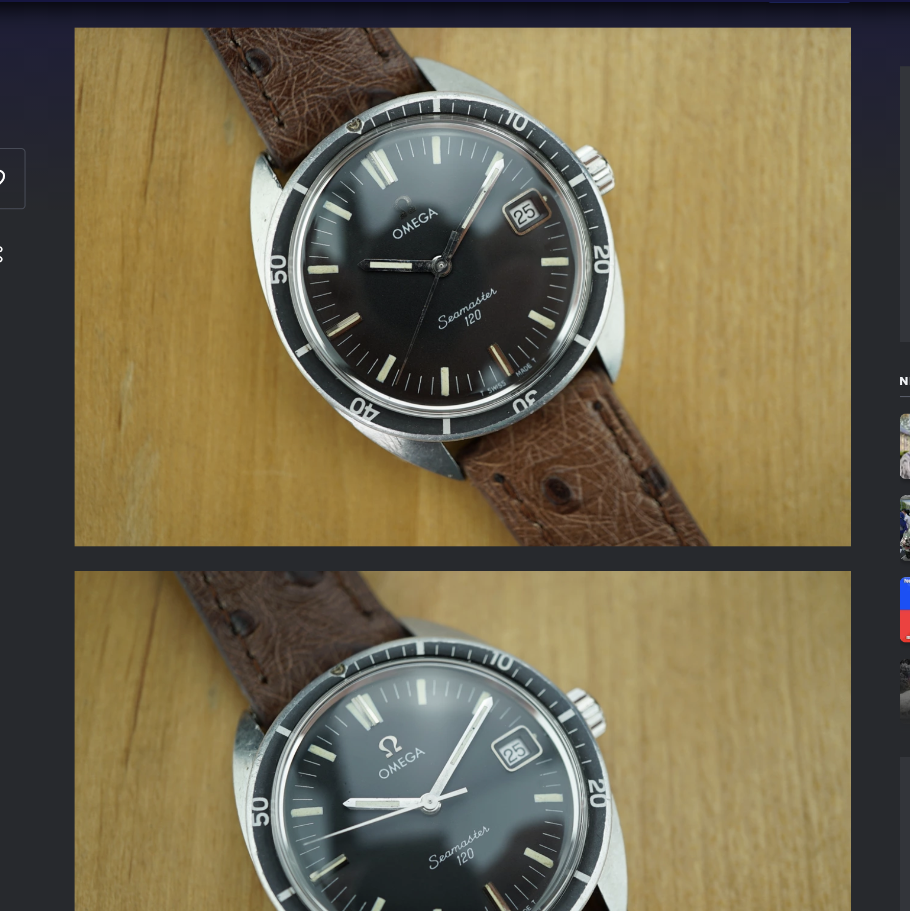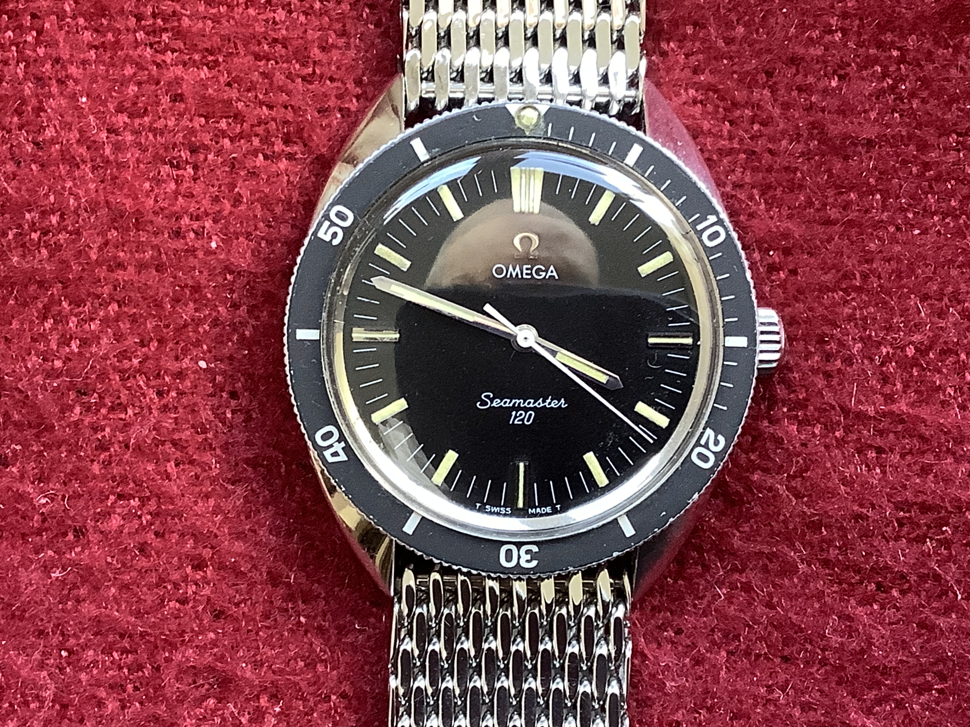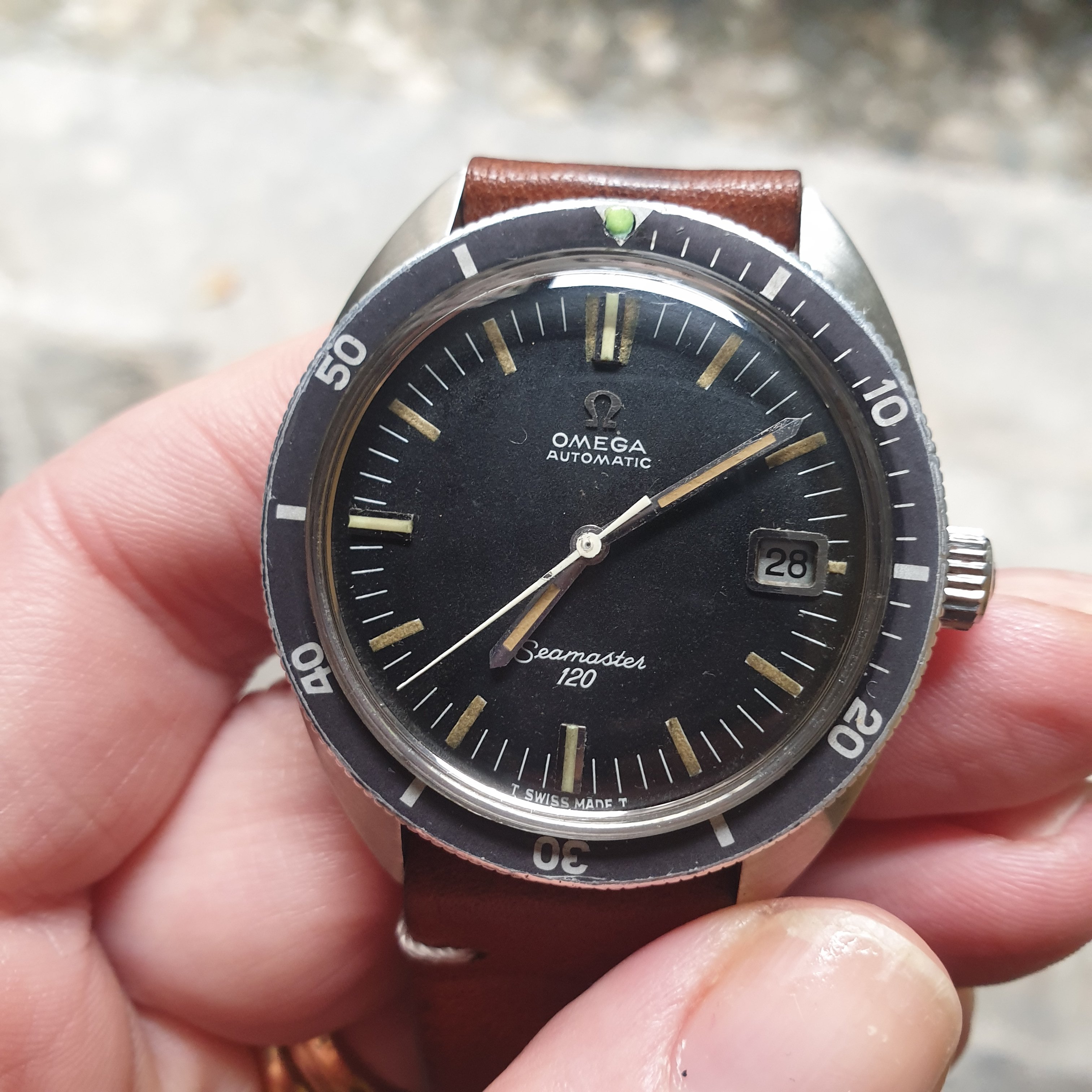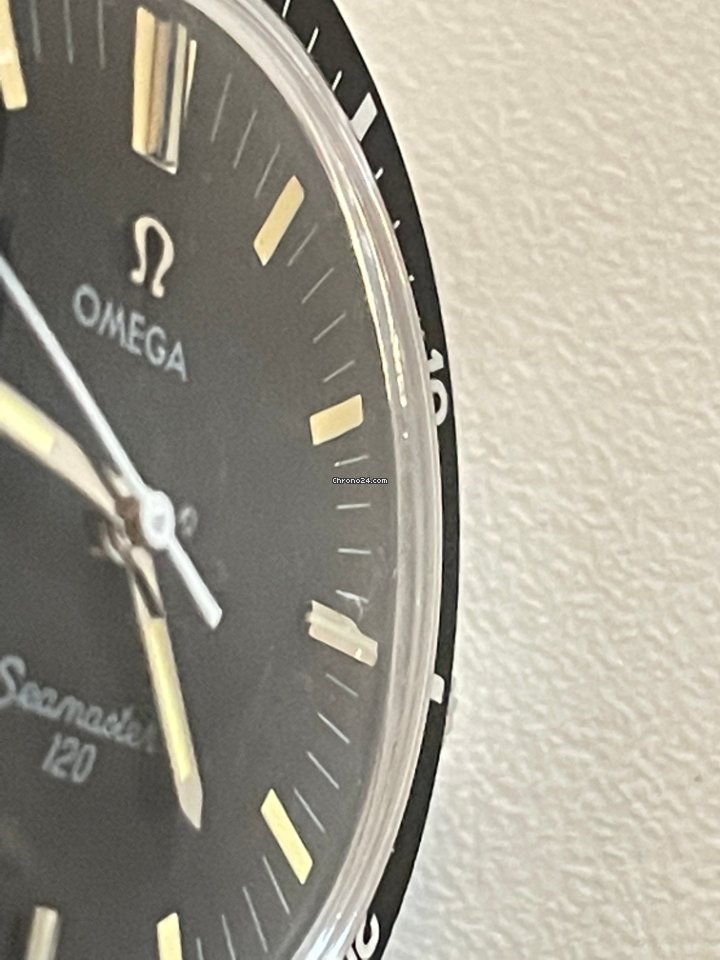 And I have this 2nd option, below. Movement number and ref. on the inner side of the case back match (166.027 / caliber 565). The case, case back, inner side of case back, and movement is original based on the photos I saw. Lume dot on the bezel is reapplied, not too nice. Bezel looks original and is a relatively good condition. Lume on the dial and hands are faded, dirty-ish, but perhaps considering the age of the watch it's ok. Colors on the dial and hands match. However, the "Omega automatic" and the "Seamaster 120" text looks too brigh/white on the dial compared to the aged lume on the dial, perhaps reapplied, a bit off I would say. May I have your opinion please about the dial?