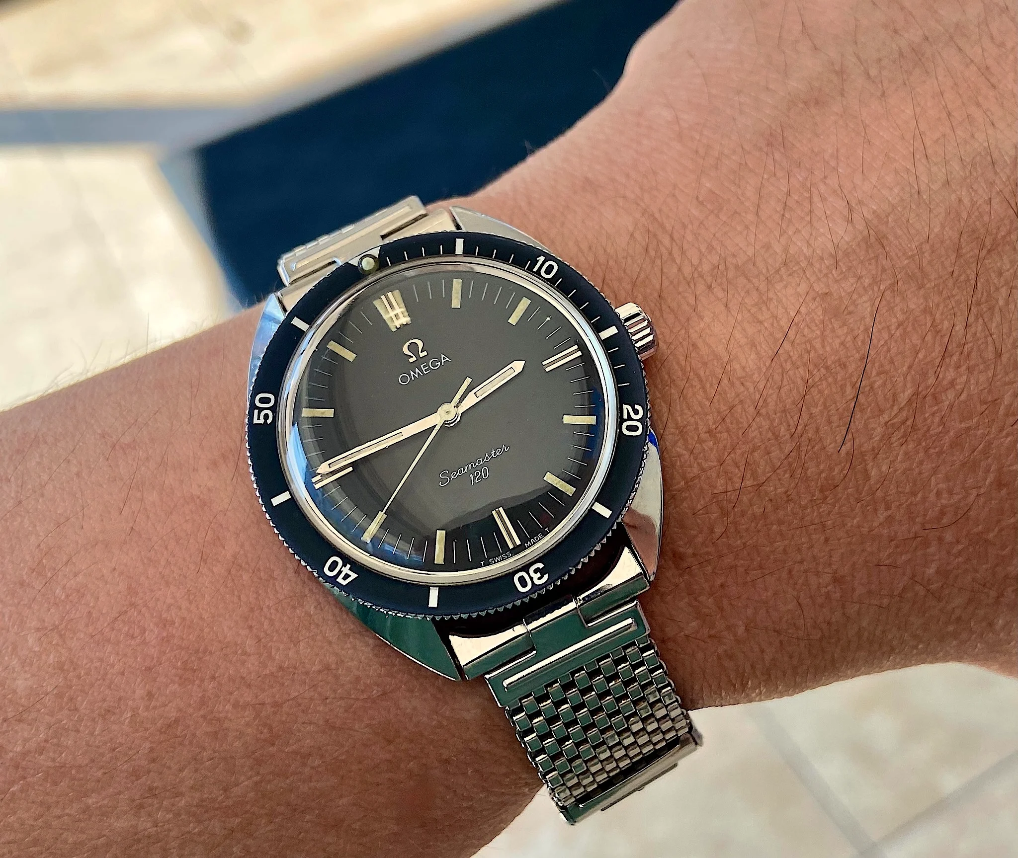 The 120 if purchased with a stainless steel bracelet would have came from OMEGA paired with a Omega branded stainless steel bracelet made by JB Champion USA ref.# 1098 No.11 and 19MM ref.# 547 curved end links. OMEGA bracelets MADE BY JB Champion USA will have a small triangle with an Omega logo inside.