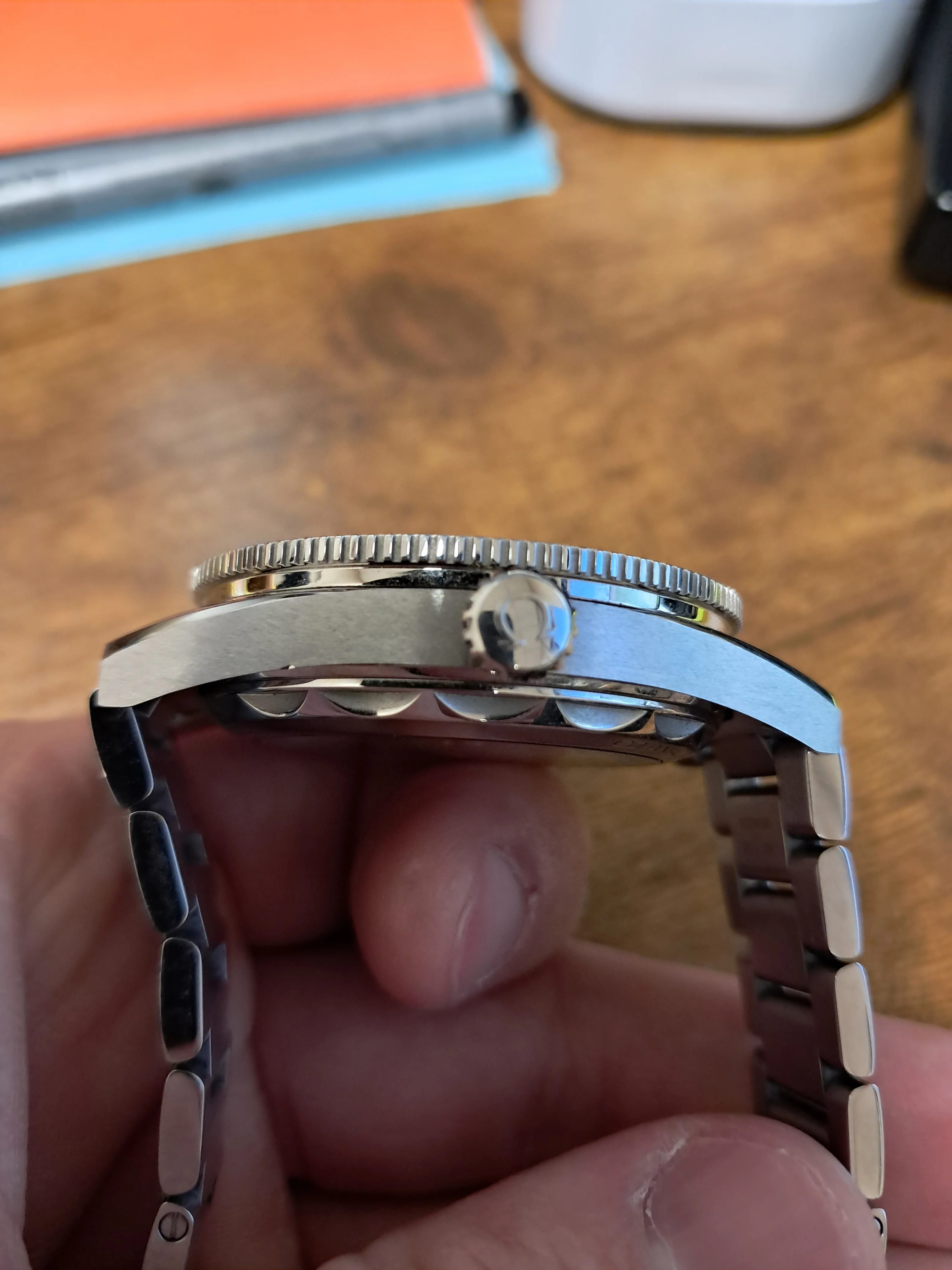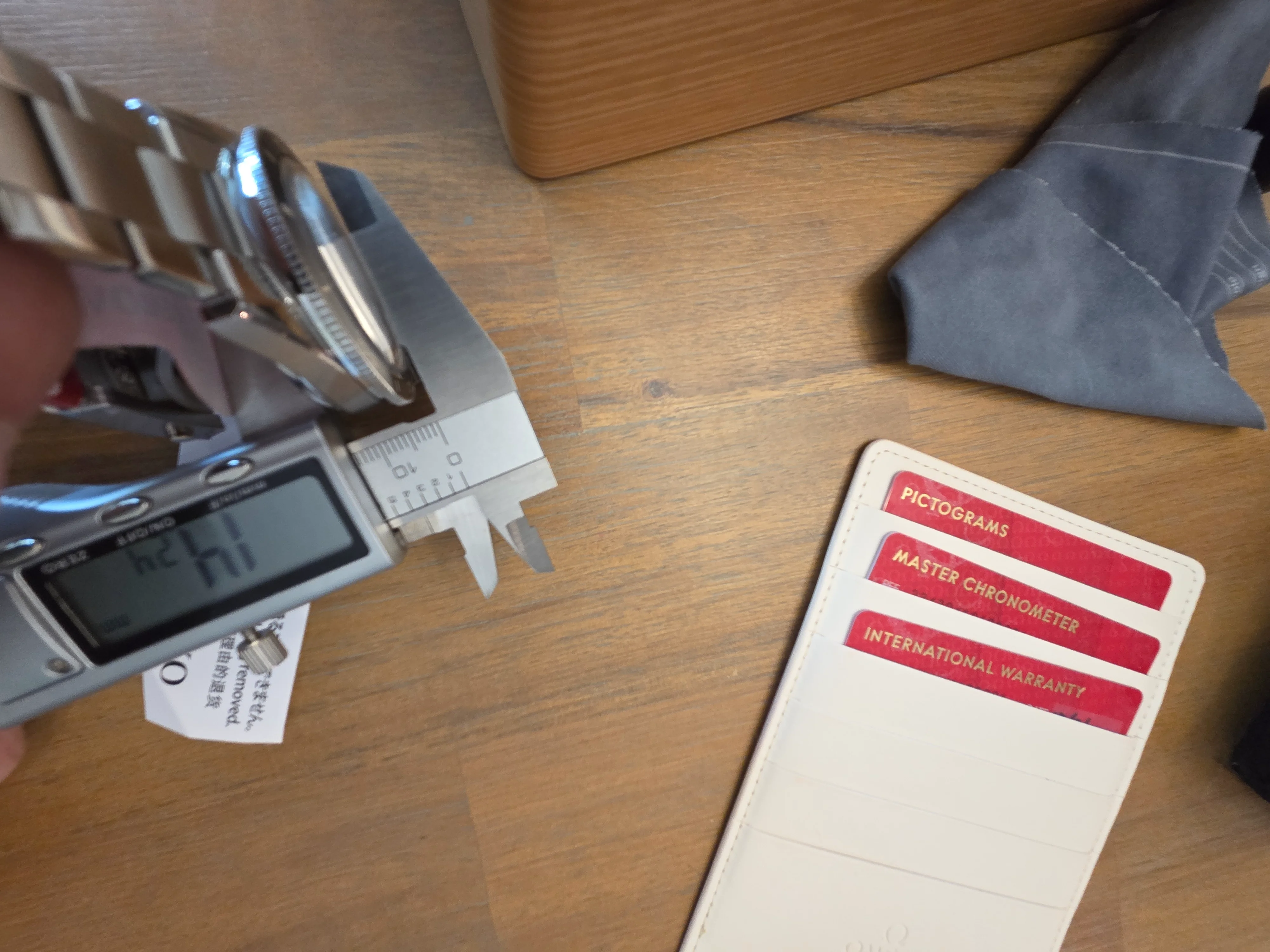 The only issue I could find was that the case thickness measured 14.24 mm, and it should have been 13.9 mm. As a sanity check, I checked my caliper calibration by measuring several different feeler gauge sets, and it was dead on to the hundredths. When I measured it, I took multiple measurements along the domed crystal to verify the thickest area. There were no stickers, etc. on the case back.