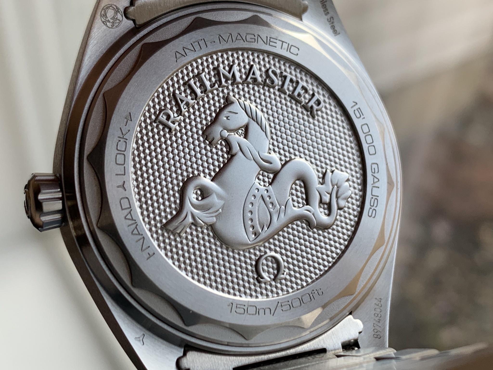 The dial is something that needs to be seen in person, under different lighting conditions. I think it's a unique, eye catching dial that can appear almost black, then have shades of dark blue, stone blue, and sky blue in different lighting. It really comes alive and shines. In my opinion, it slightly offsets the fact that it's printed, without applied indices. Having a brown second hand and brown "Railmaster" text on the dial provides some subtle color contrast. In terms of the case and bracelet finishing, I love the contrasting brushed surfaces that the Railmaster offers. You won't have to worry about fingerprints all over polished surfaces, and some of the hairline scratches/normal wear which pick up easily, especially on polished bracelet center links (looking at you AT). Brushing the watch in different directions and with different grains really gives the finishing some depth that I appreciate. Some might prefer a display caseback on this model, the solid caseback is extremely well done, proudly displaying the classic Omega Hippocampus which fits the overall aesthetic of the Railmaster in my opinion. A couple things I'm not a fan of is the bracelet clasp and adjustment. With no adjustment outside of links, and the fiddly dual clasp system, I find the bracelet to be a bit lacking compared to some other competitors, even at cheaper price points (I personally prefer the setup my Tudor has, as an example).