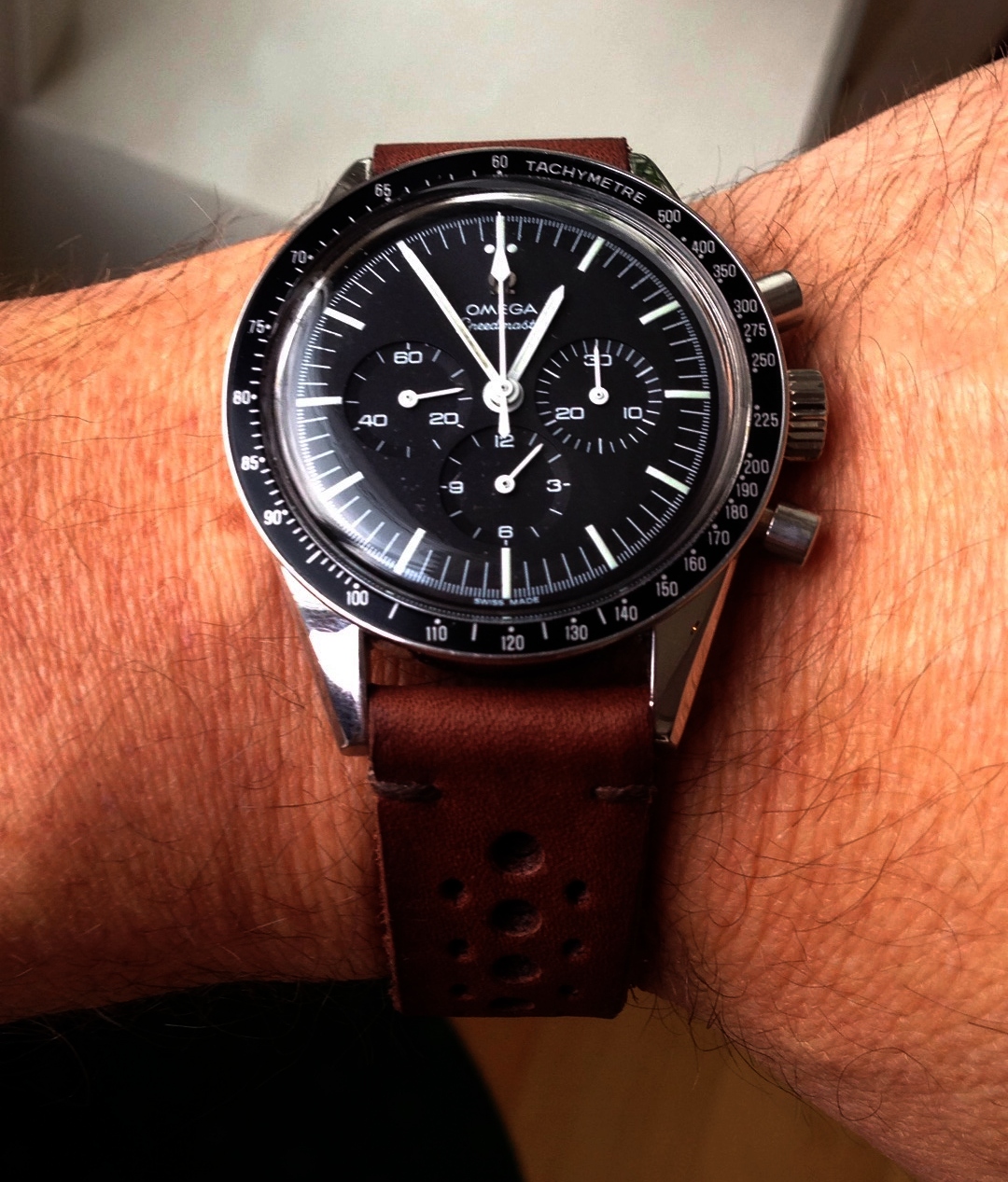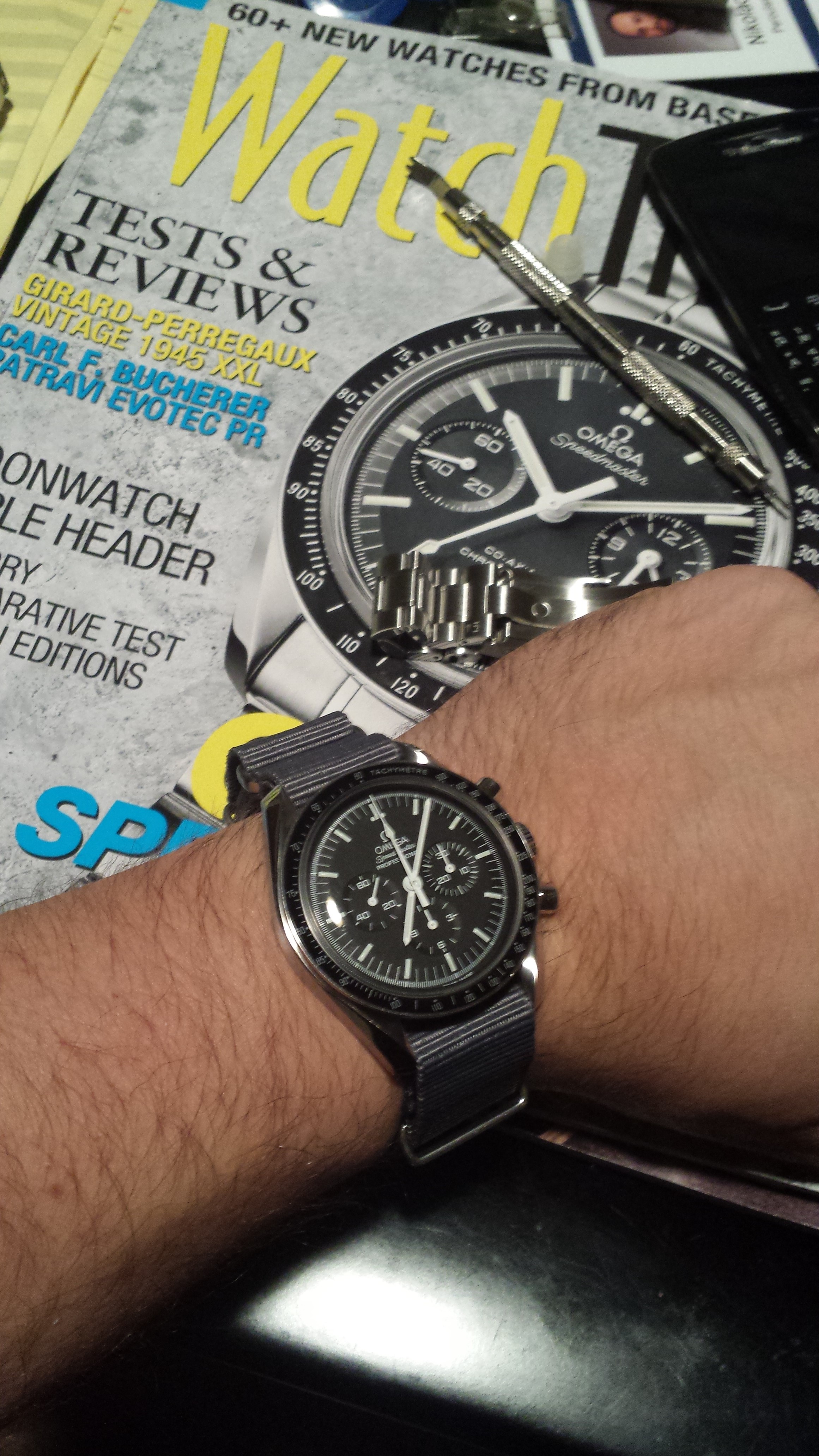 ·Well my first true nice watch actually. I guess I'm a Swatch Group strategist dreams. Started with quartz Swatches, auto Swatches, Hamilton Khaki and now a Speedmaster. The initial feeling of guilt for spending the "rainy day" funds on this watch have quickly subsided. It is really that much better in the flesh. The overall look, the domed Polyglass crystal, the action of the chrono and the way it looks just right on the wrist regardless of occasion. Favorite part so far? I just noticed that there is a tiny Omega etched into the center of the crystal. I am so glad i waited it out for a Professional and not a cheaper variant.