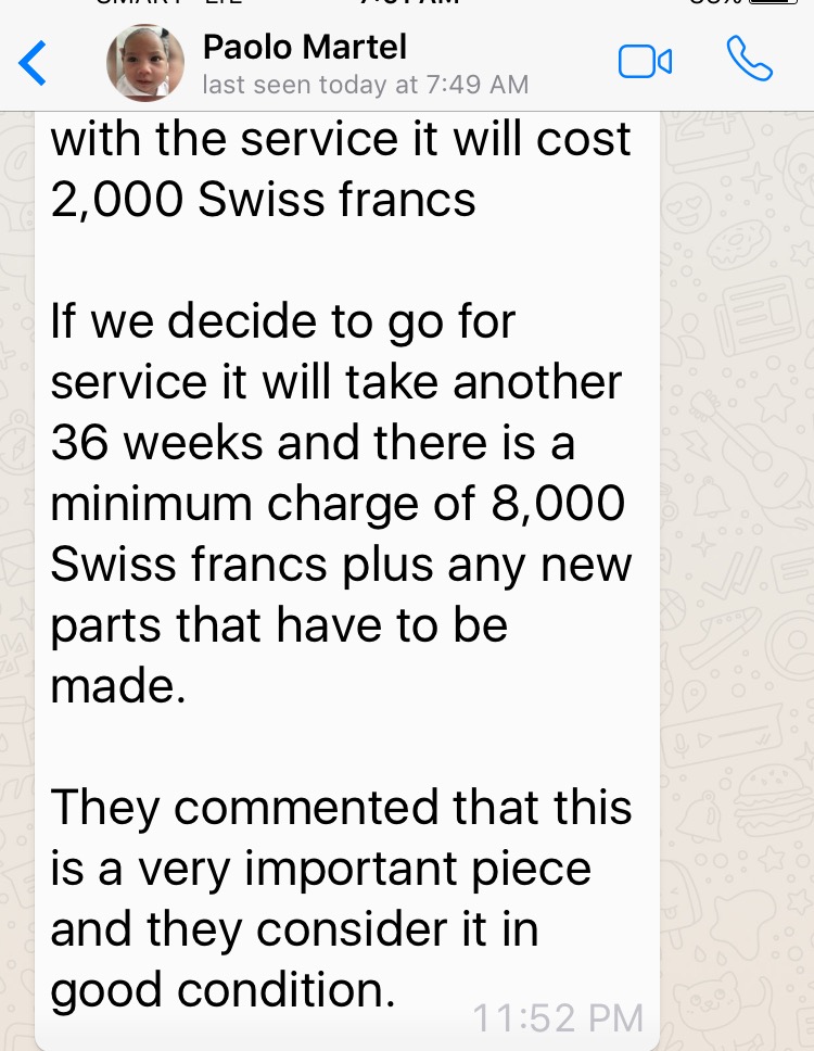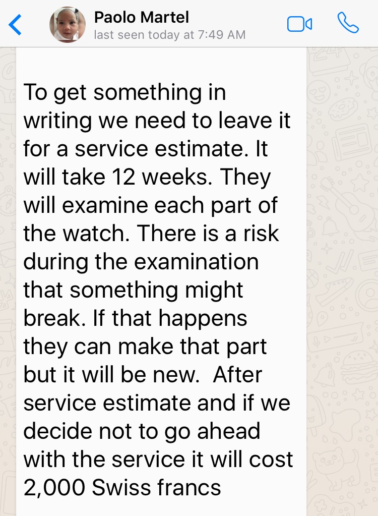 On top of that, another 8k minimum for servicing!? Sounds like a rip off for work that can be well done by many other watch makers for far less. The only thing that might be worth that is an impossible to find vintage part that they could supply but I don’t see that being likely.