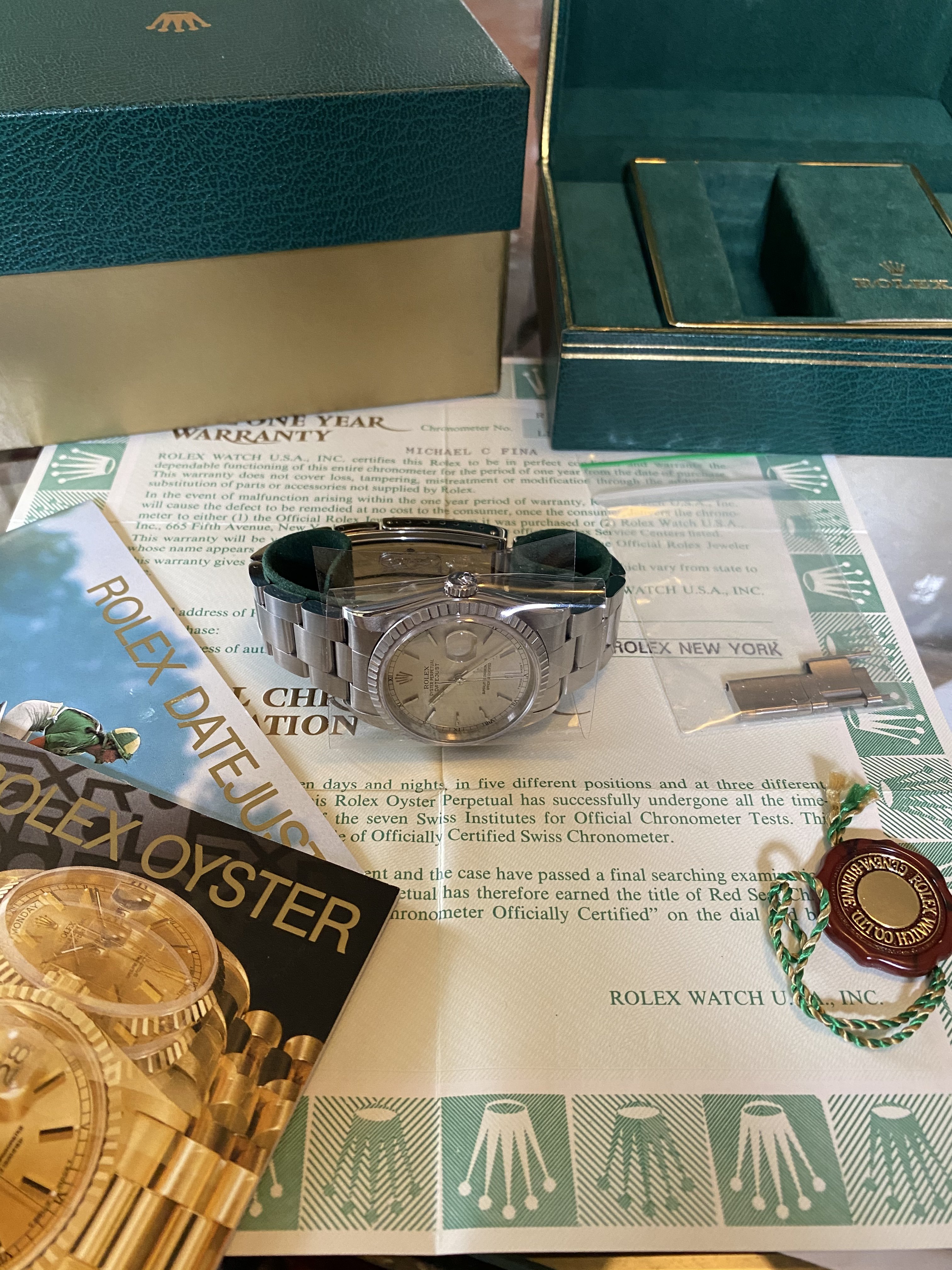 It wasn't until much later that I realized the papers included with my watch weren't for my watch but for another 16220 (possible IBM as well) Datejust. With the help of another member, we looked into every IBM Datejust we could find, and found a plausible reason why my papers were incorrect. Every IBM Datejust that we could find, that was pictured with their papers, had the name Michael C Fina stamped on them, which was a jeweler in NY. It's possible the jeweler put the papers in the incorrect box from the get go, but we had a feeling this was accidentally done by IBM when they received and inspected the watch(es). Its all speculation but both of us were confident these papers have lived their entire life with my watch. Like the two brochures, the papers had crisp folded edges that looked to have never been opened. It's a bummer the papers didn't match but to me, these are part of the watch and I really don't mind it.