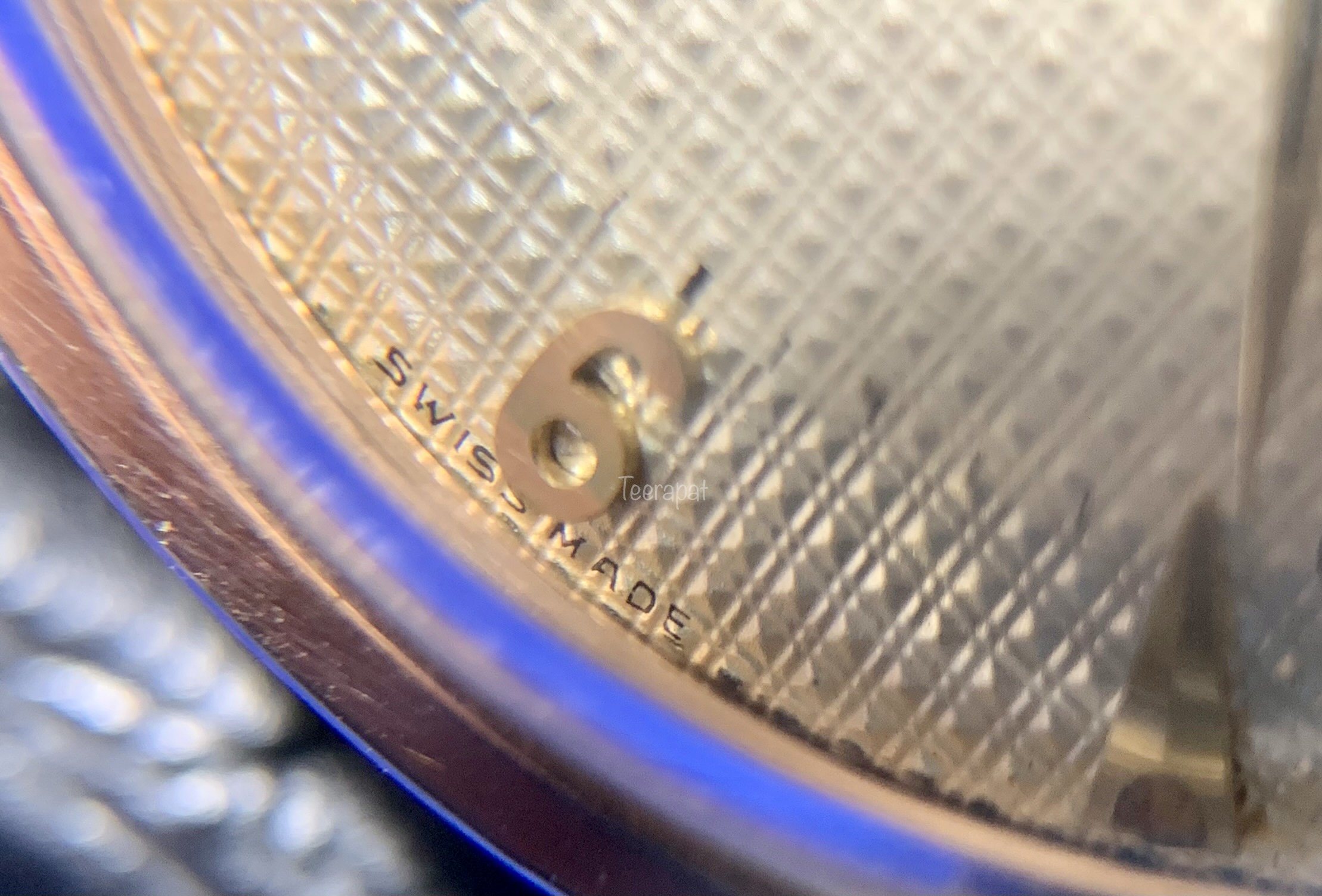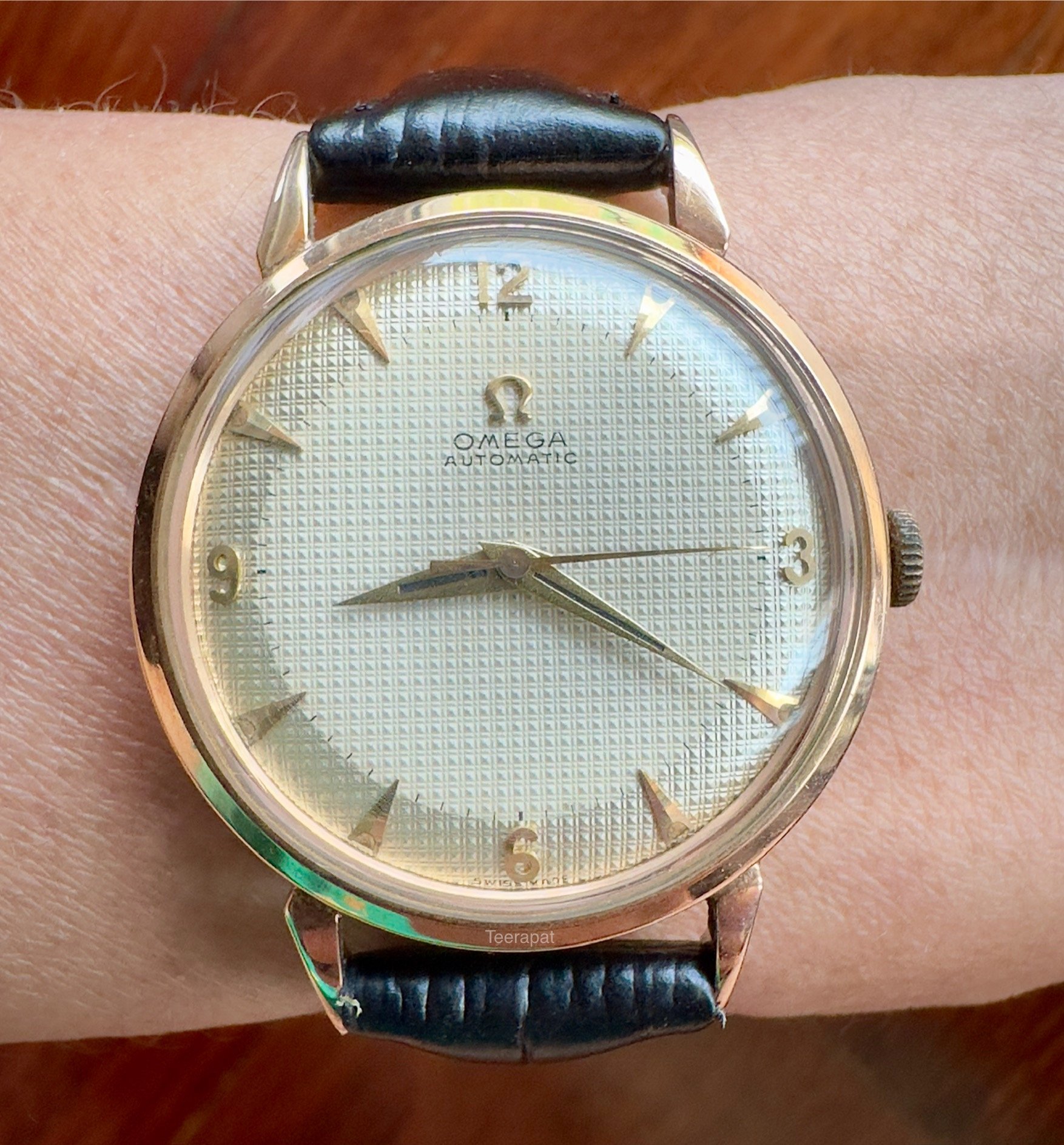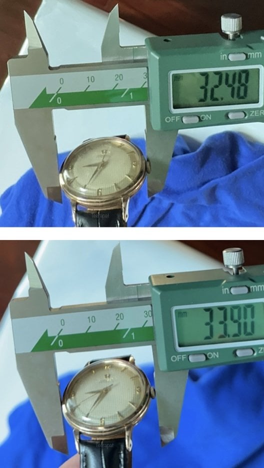 Case: “9CT Australian case” with diameter 32.5 mm (excluding the crown) and 33.9 mm (including the current crown). I believe it might be pink gold case? please see the wrist shot compared with my yellow gold constellation. I’m not familiar with this case, but I think the case has been polished at some stage in their life.