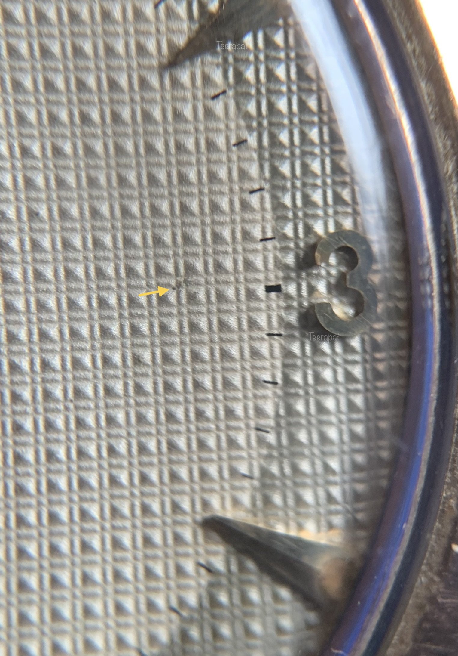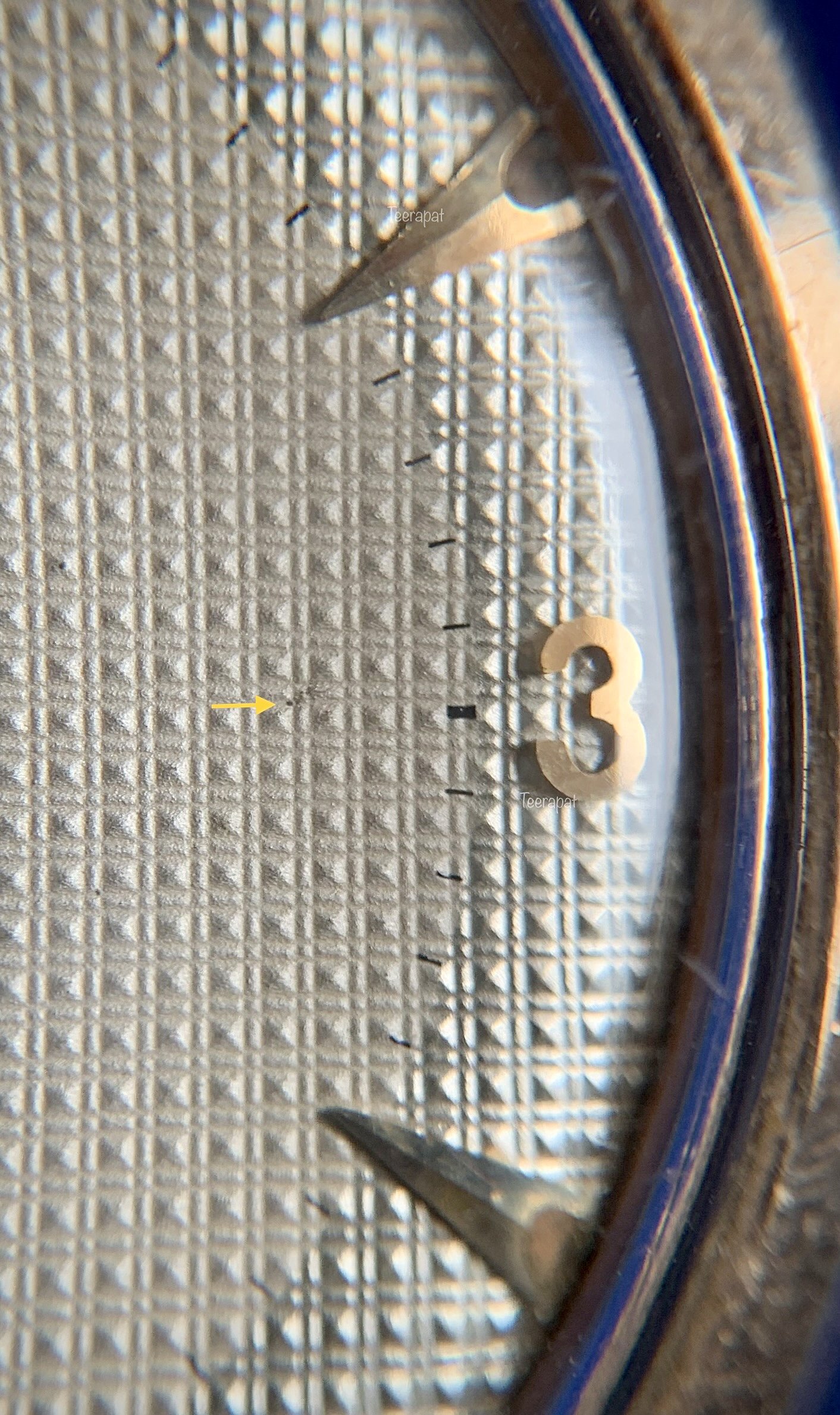 Dial: Original two-tone hobnail dial (non-refinished) with Arabic numerals 12-3-6-9, plus the original “radium lume” hour-markers in good condition.