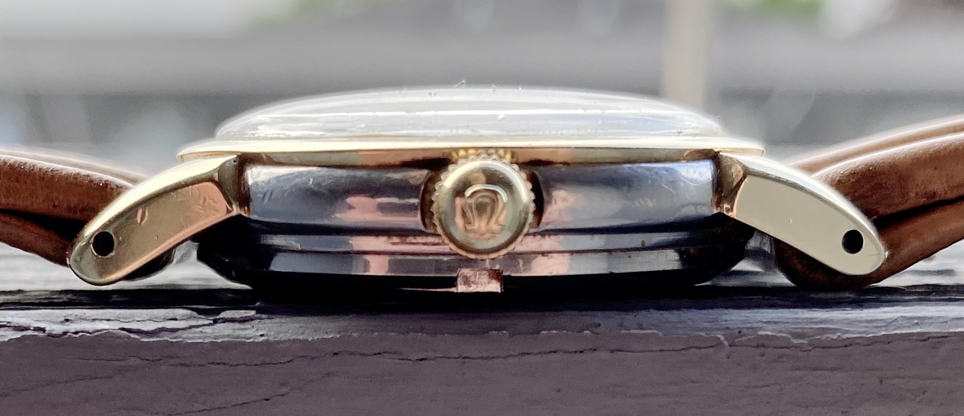 Overpolished on the lugs like most of these. Second-most incompetent dial printing ever. Depsite how badly it's done, I think it might be original. Not luminous. The crown is FABULOUS. Original-ish crystal. Fat numbers on the date ring, don't see that too often.