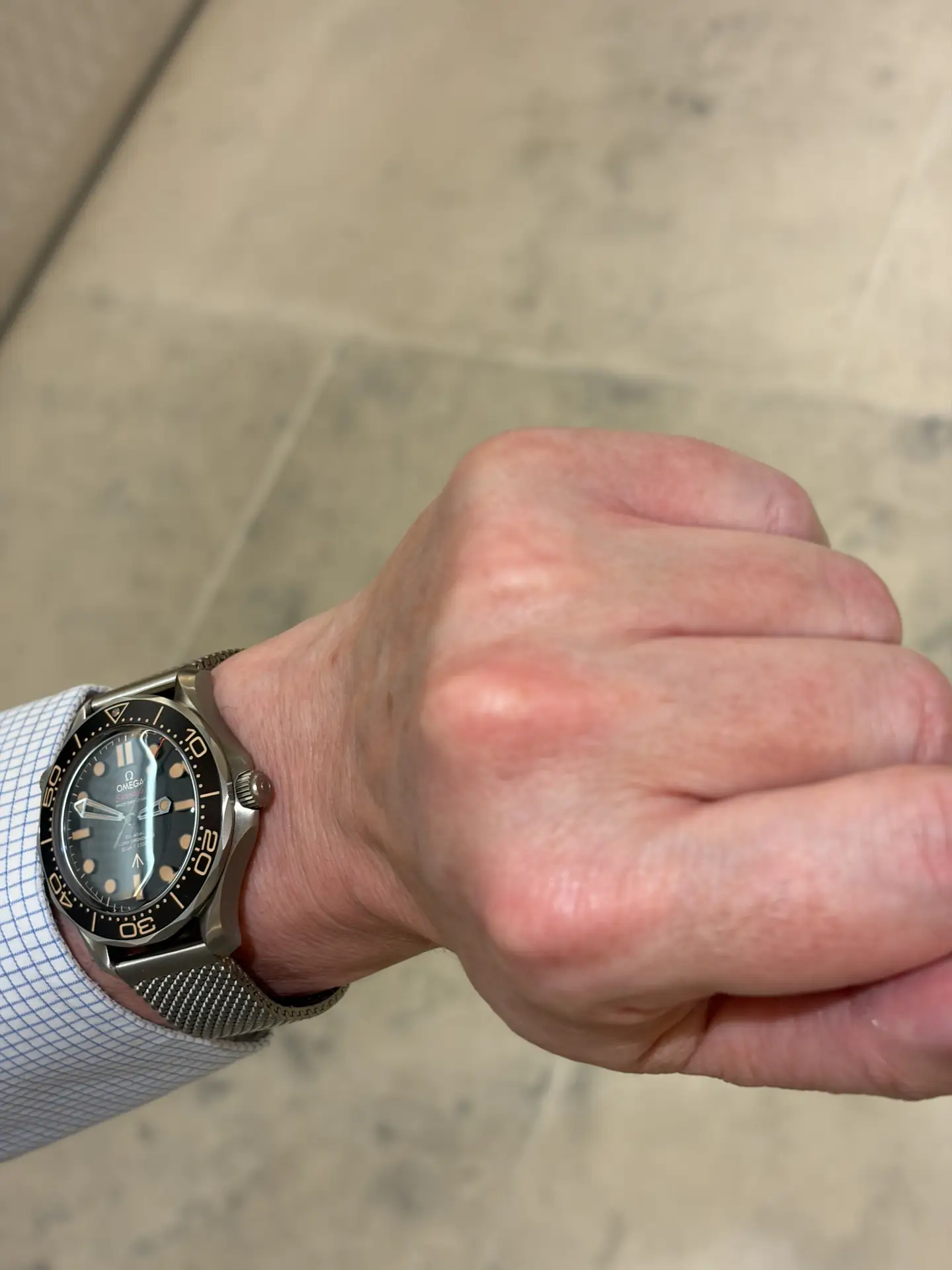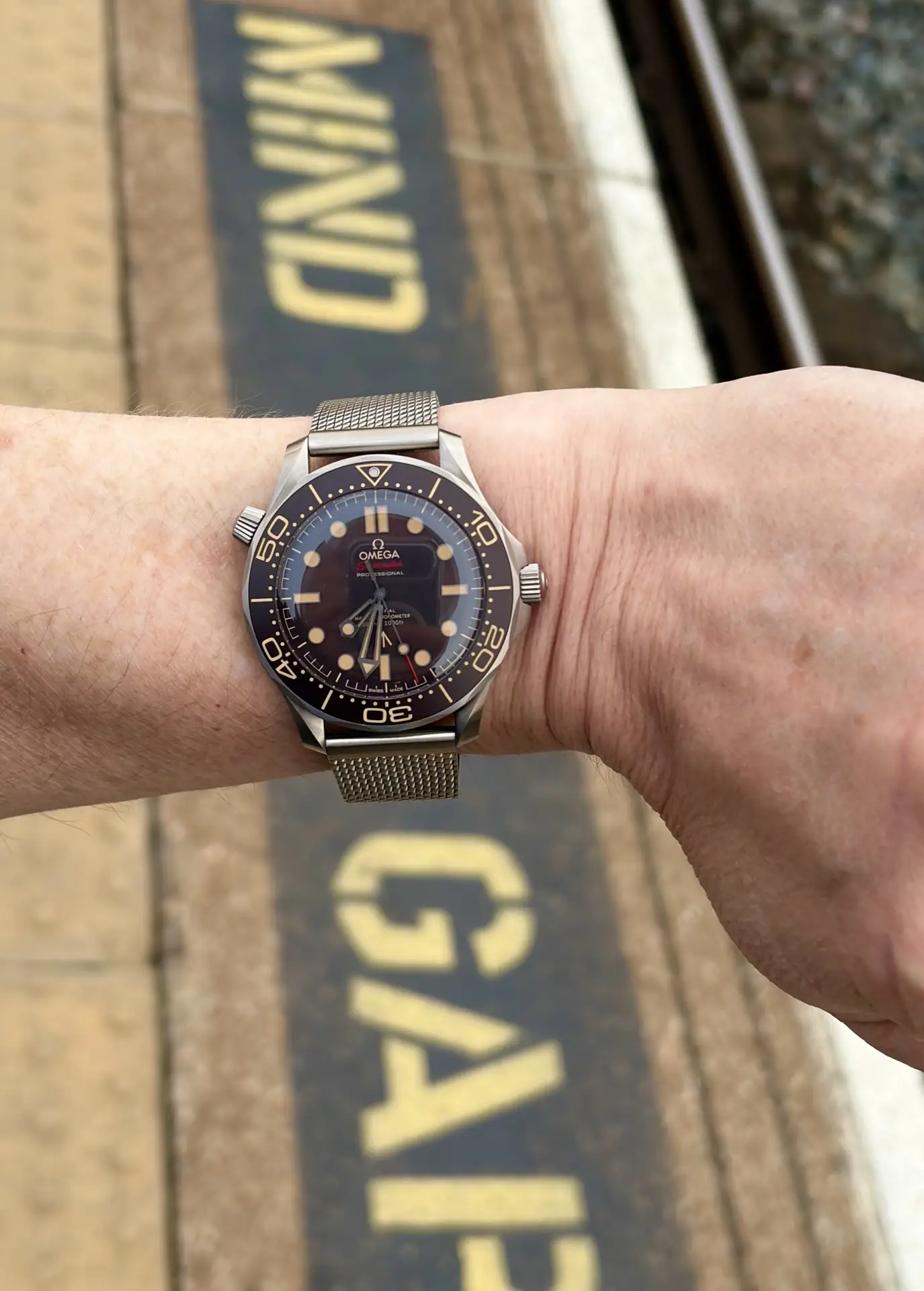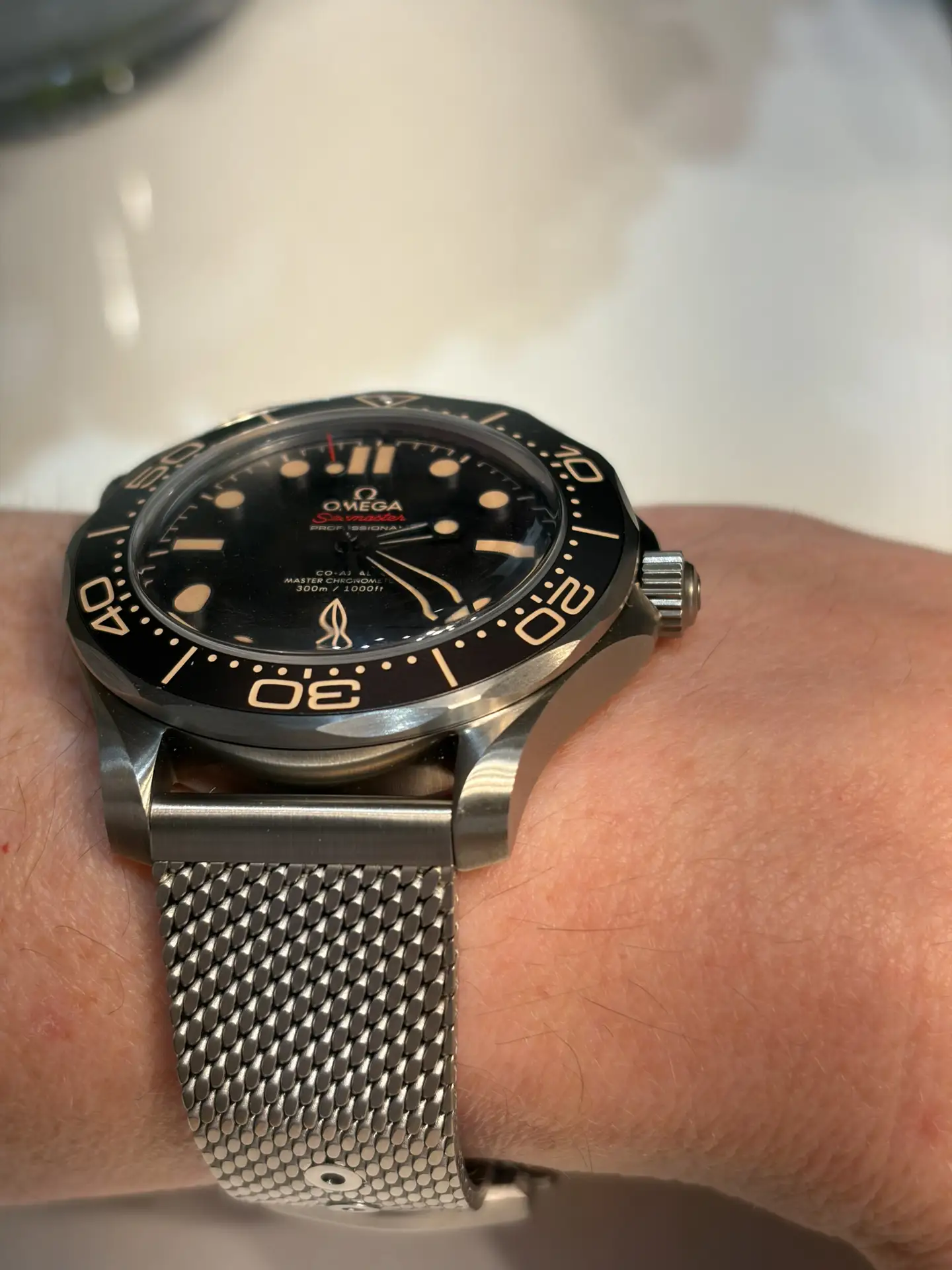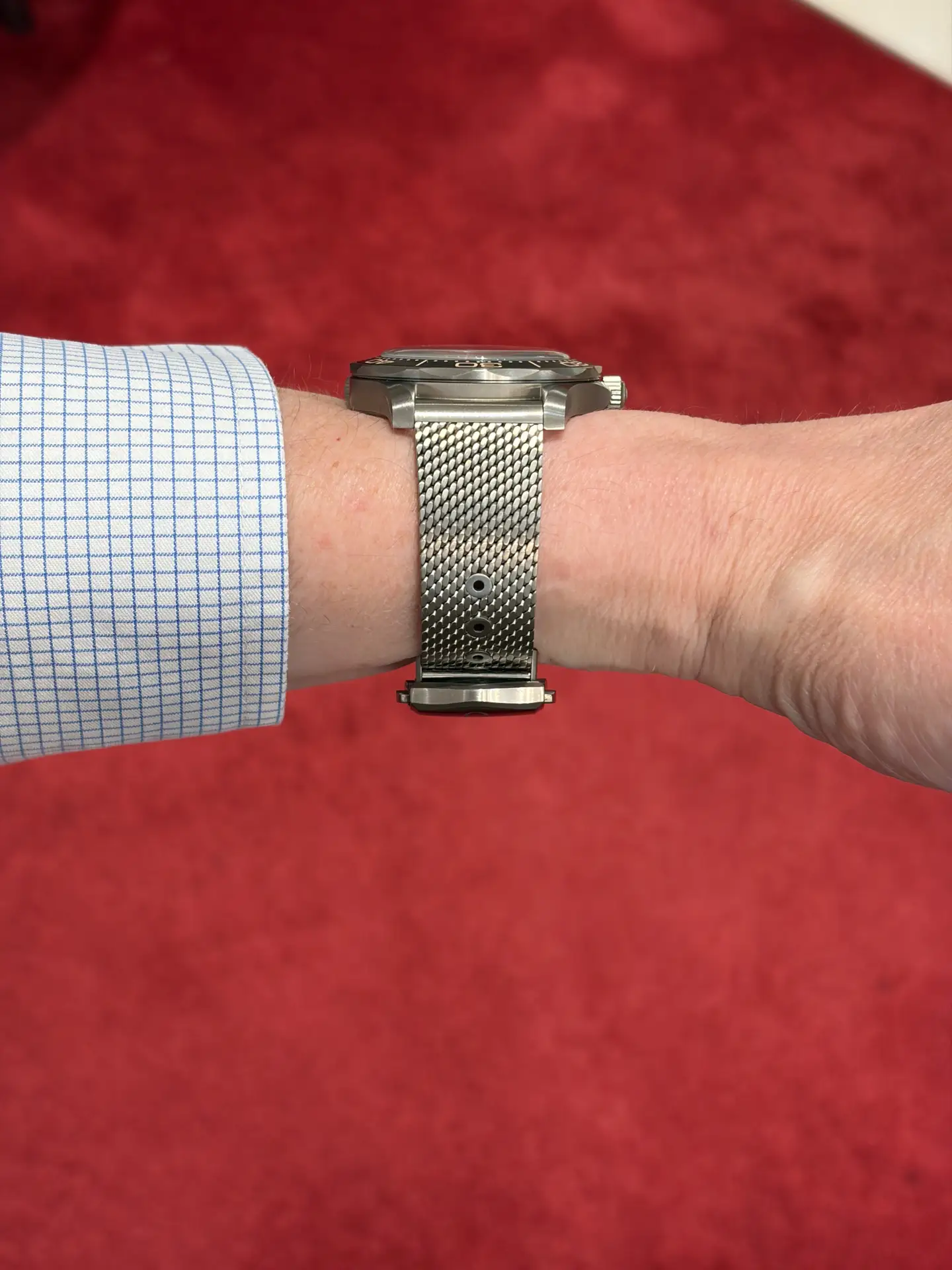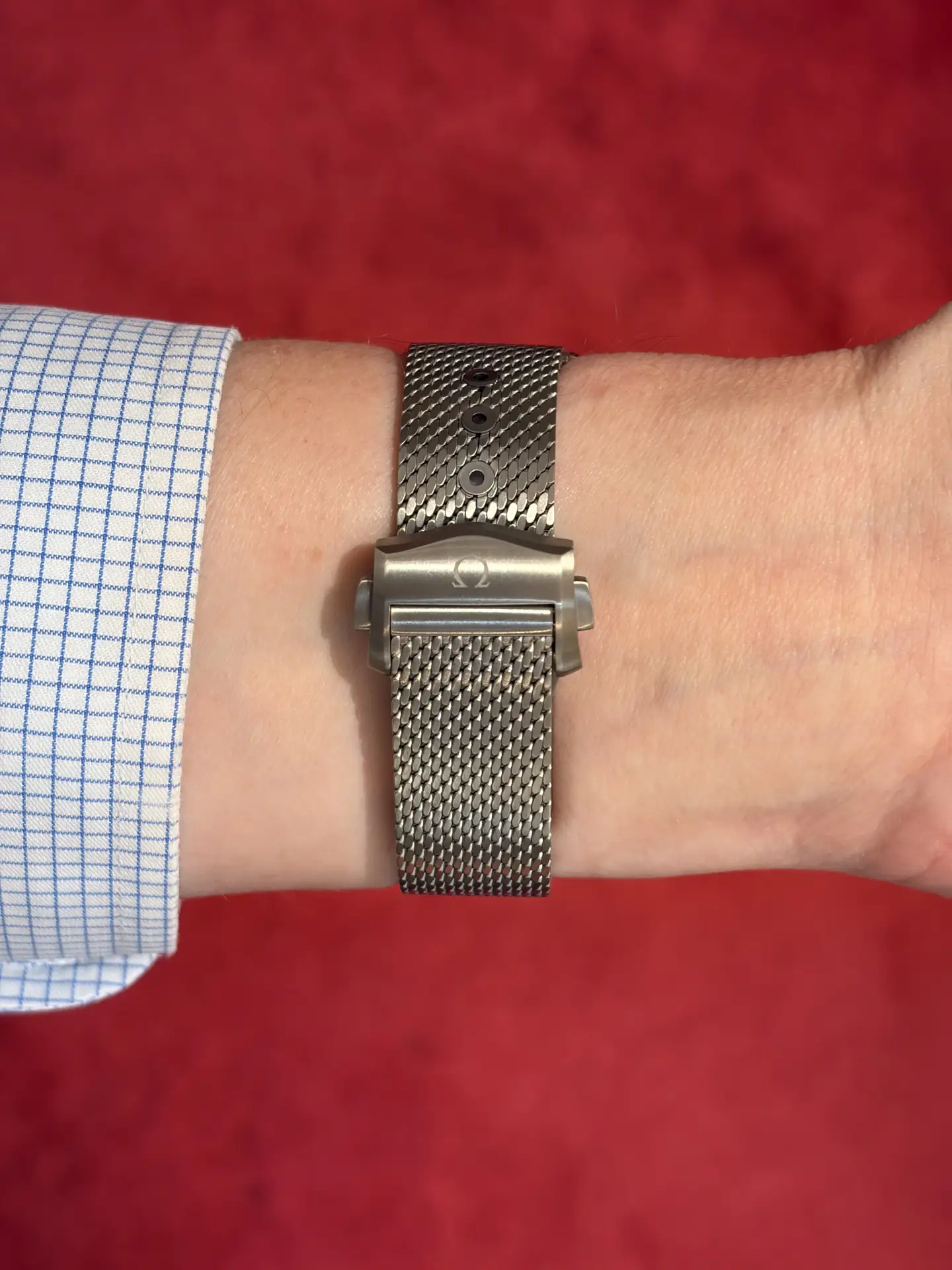The mesh bracelet is of course more comfortable then any oyster, multilink or beads of rice bracelet, simply as it drapes more around the wrist. The fact that it drops vertically form the lugs also helps. The effective links are around 1-1.5mm, compared to say a small jubilee at about 3mm. Confusingly, or usefully, Omega provides three sizes of titanium bracelet. I ended up buying the small bracelet. I have a 6.75 “ wrist, and in “summer sweaty wrist expansion” mode I am on the second last hole, which is perfect. The standard bracelet also fitted, coincidentally on the second smallest position. We all demand adjustable clasps these days, but a strap has always had the best adjustable system, just by changing holes. The metal mesh bracelet combines the benefits of both the strap and bracelet worlds.