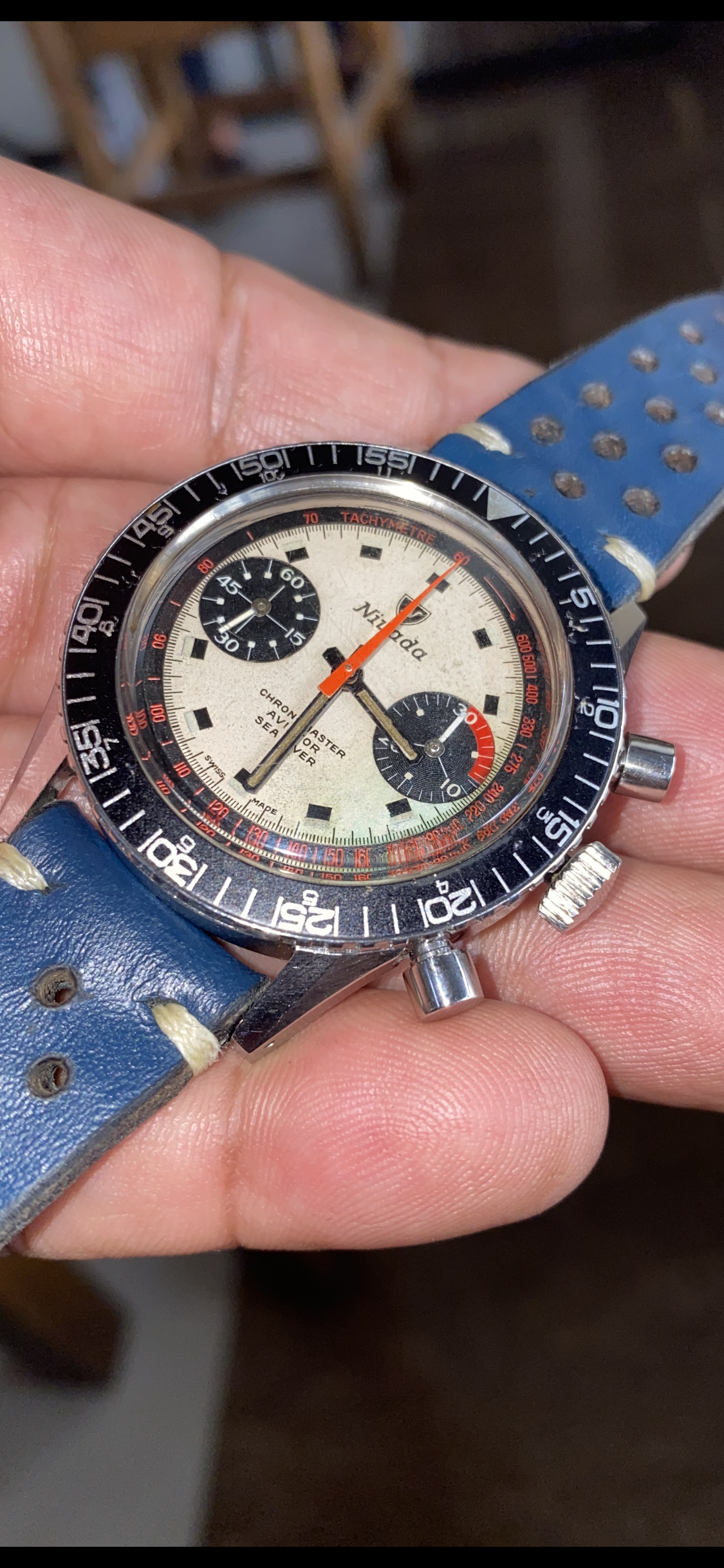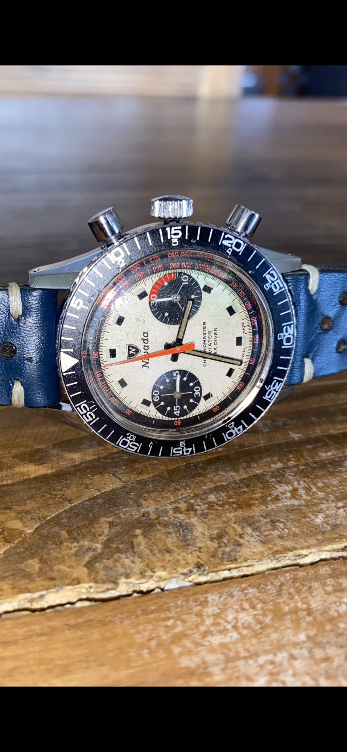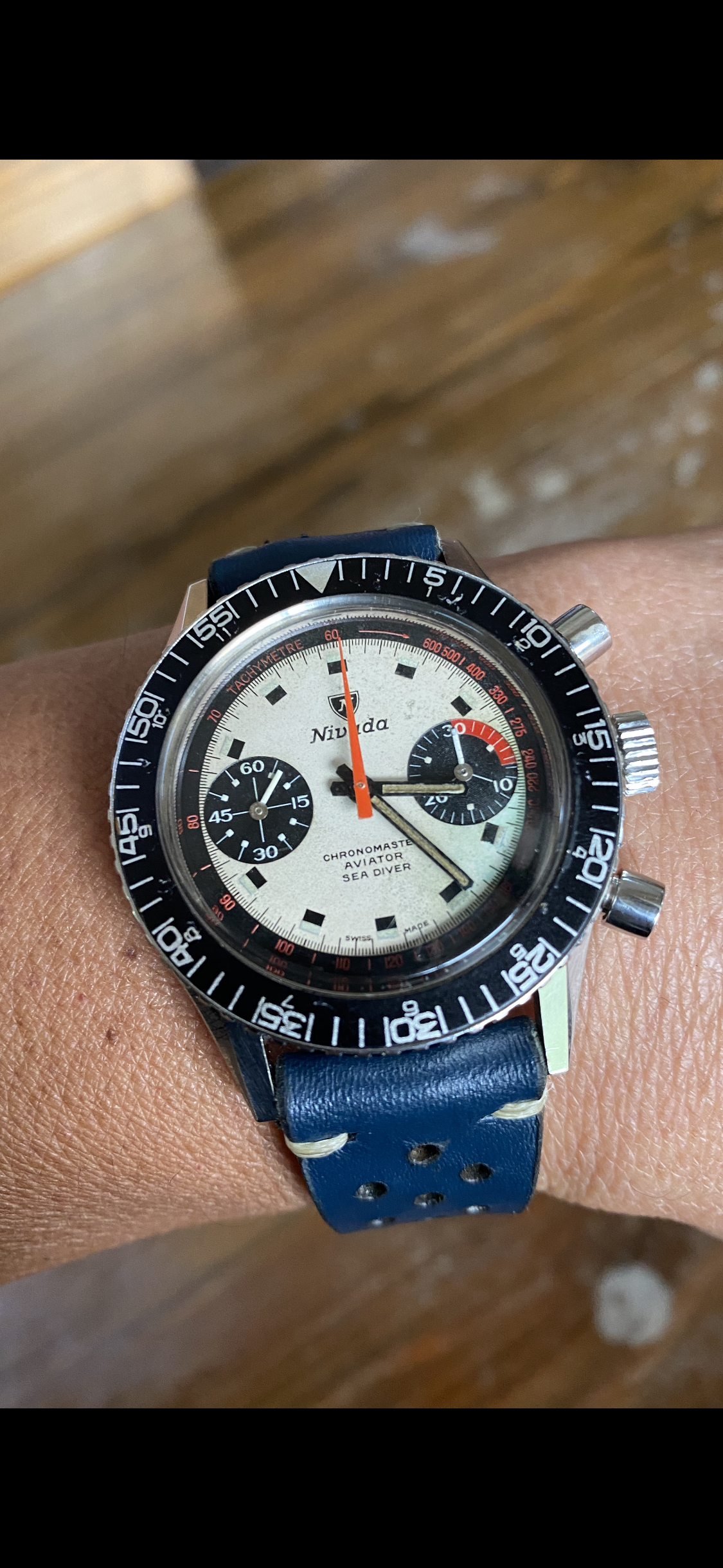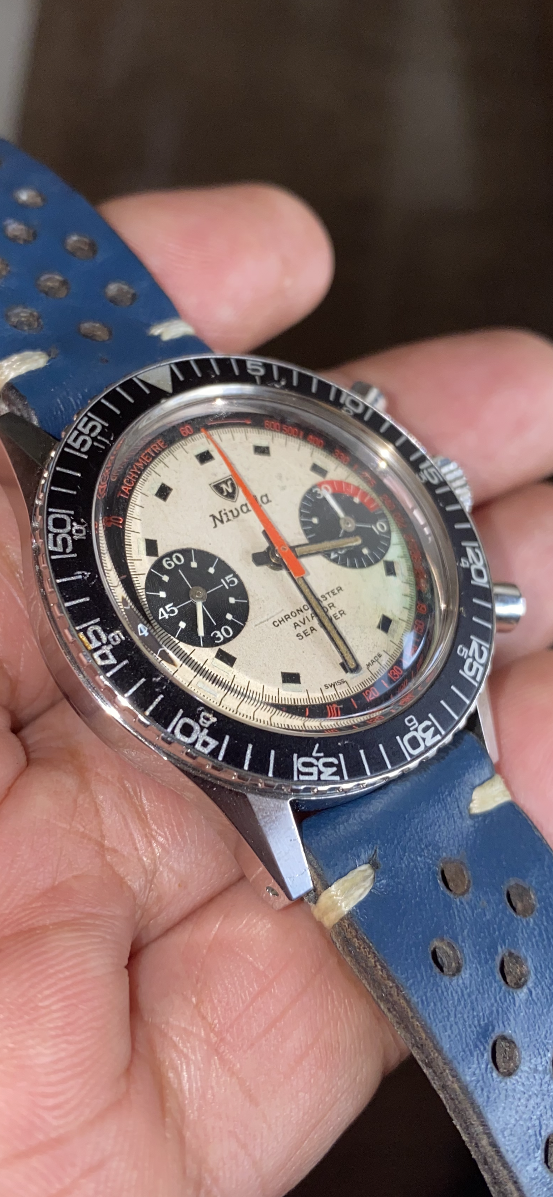 Its a 60s Nivada Gretchen Aviator chronograph with a tri-color panda dial which is totally cool to look at. It is also very rare and finding one is an achievement in itself already.