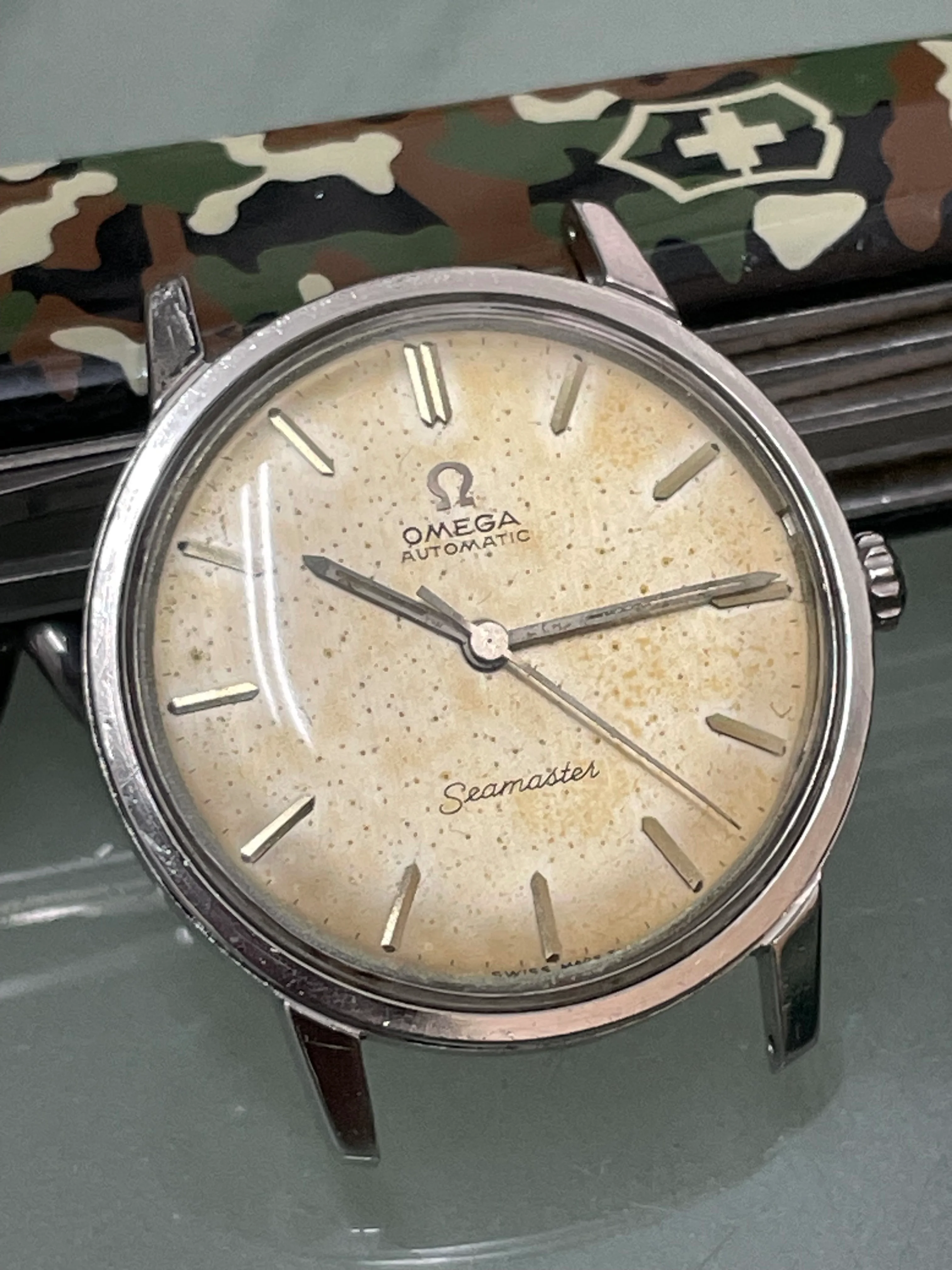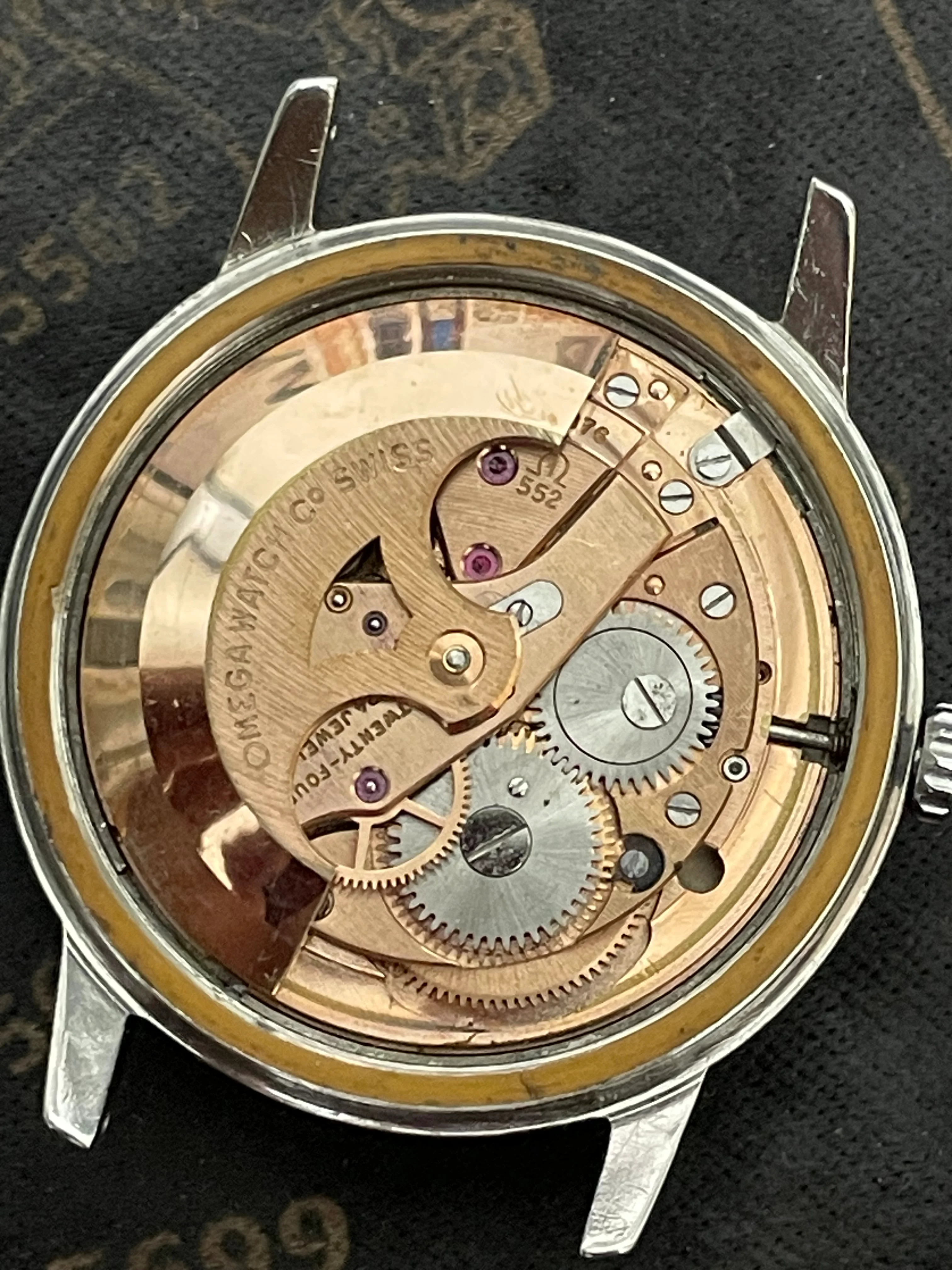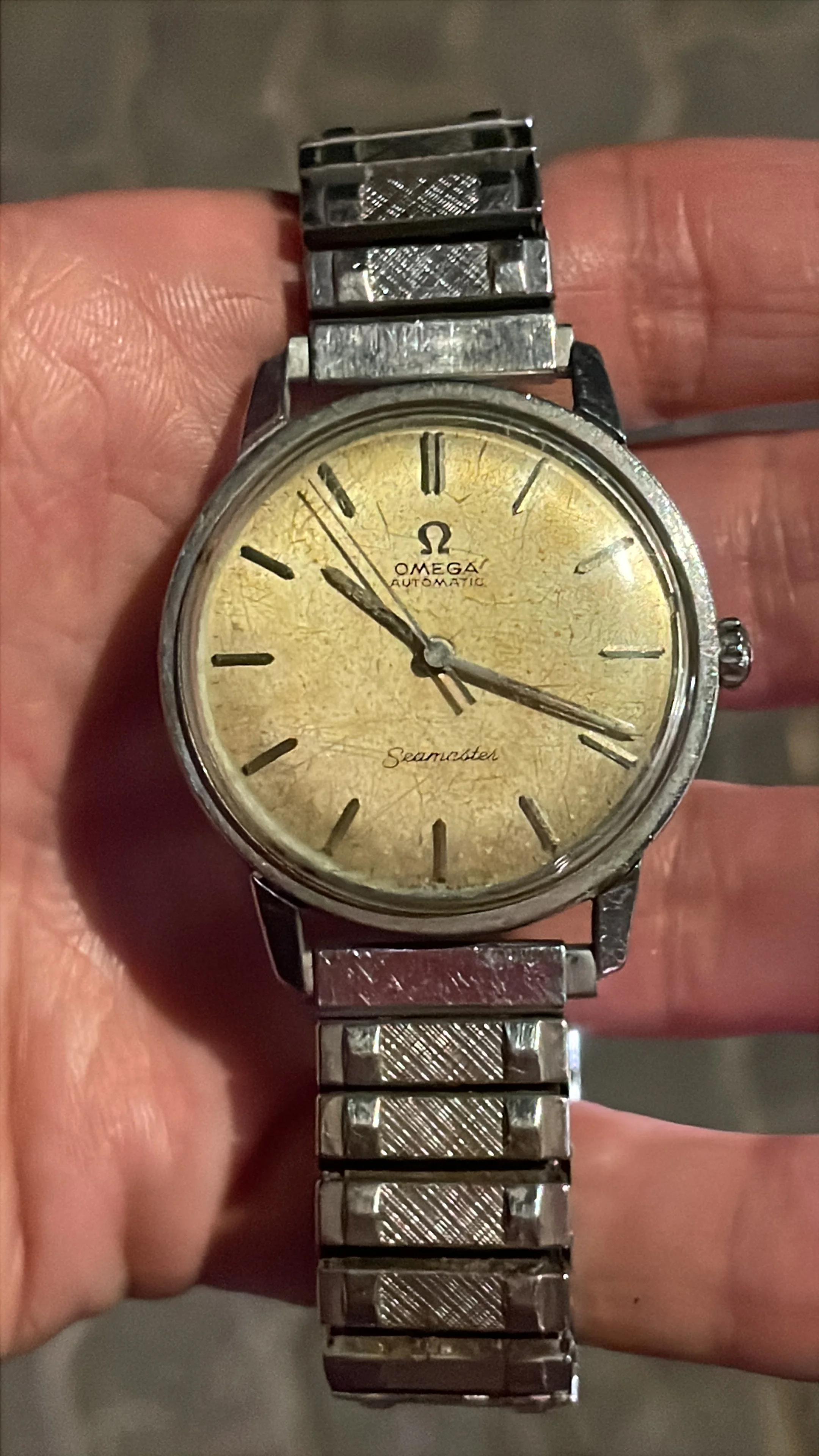 the watch was in catastrophic condition (see last picture) - all scratched, stops once in every rew minutes, missing the inner lever that dixes the mechanism to the case, and dial was super dirty, besides the patina. the band was a strechy hong-konmg marked, rusty internally, with some dead springs.
