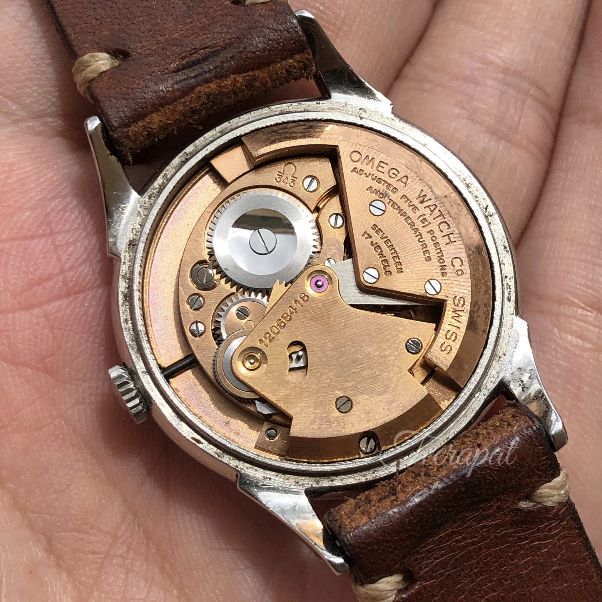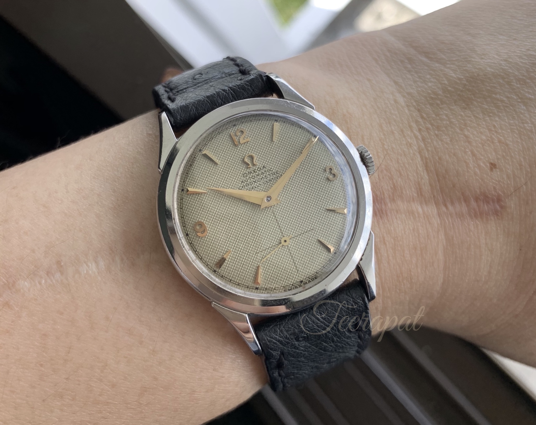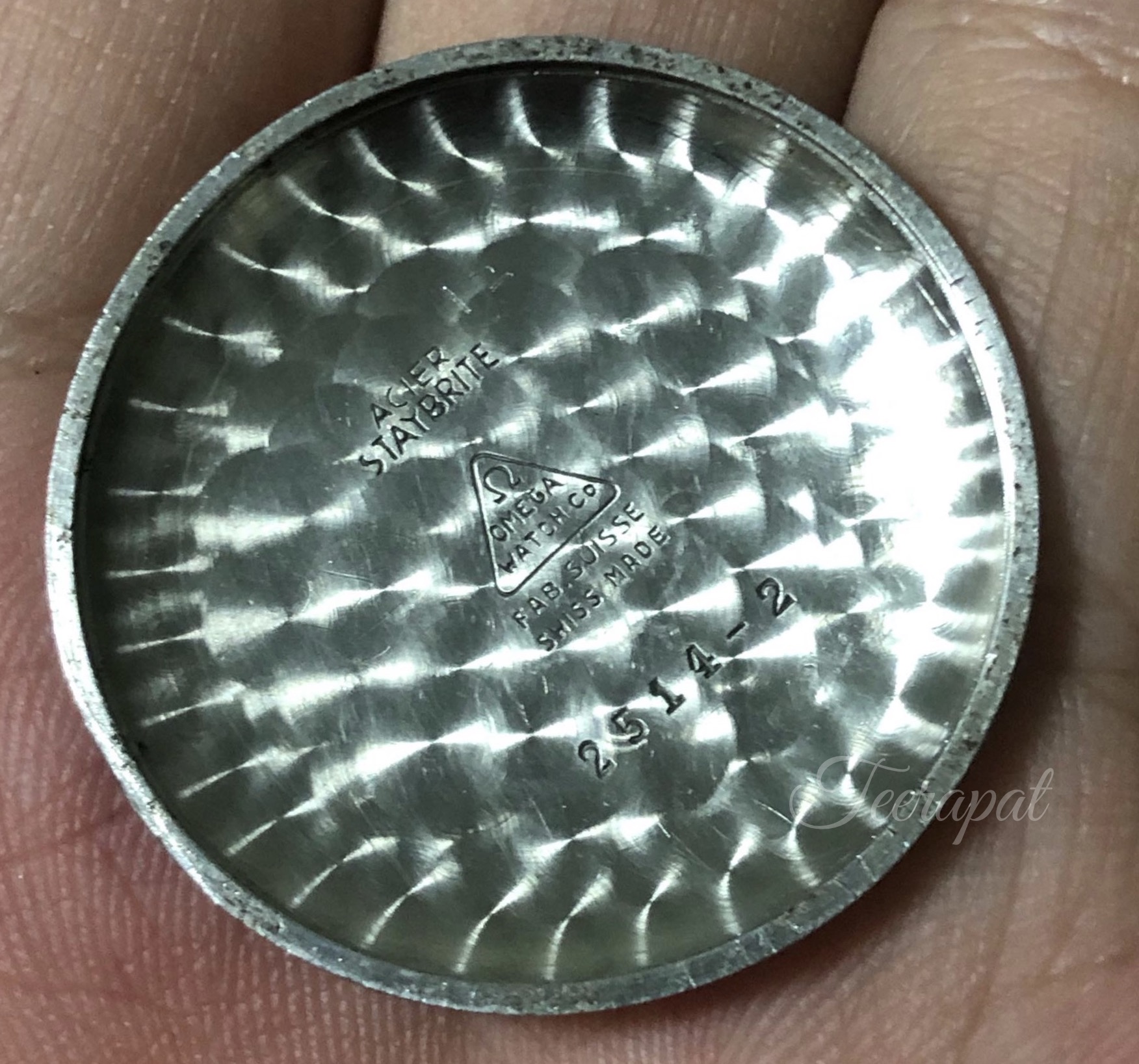 Omega reference CK2514 (caseback shows Reference 2514-2), waffle dial, 4-line version with “OFFICIALLY CERTIFIED”, “TRE” in word “CHRONOMETRE”.