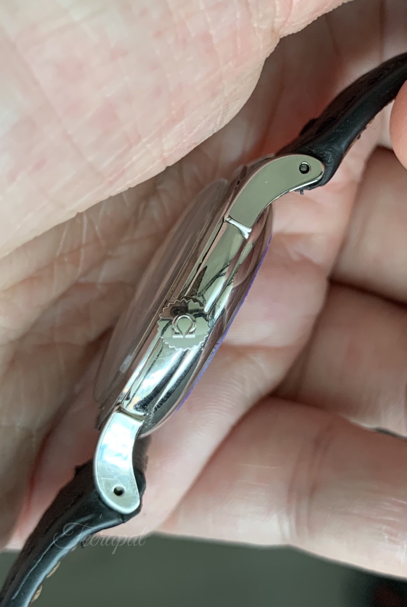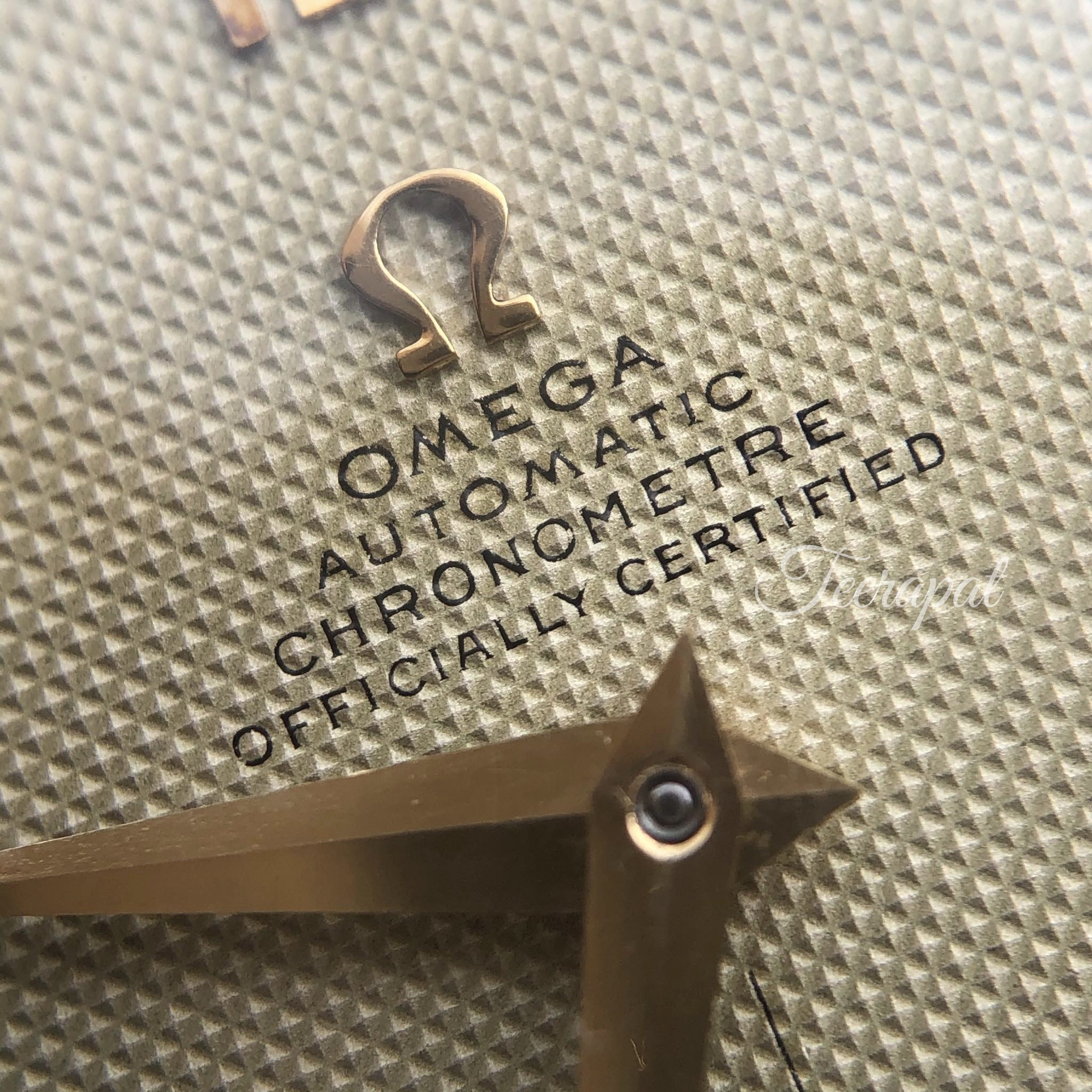 In addition, applied “omega” logo, dauphine hands (hour and minute), “railtrack” minute marker, plus “SWISS MADE” at 6 o’clock.
