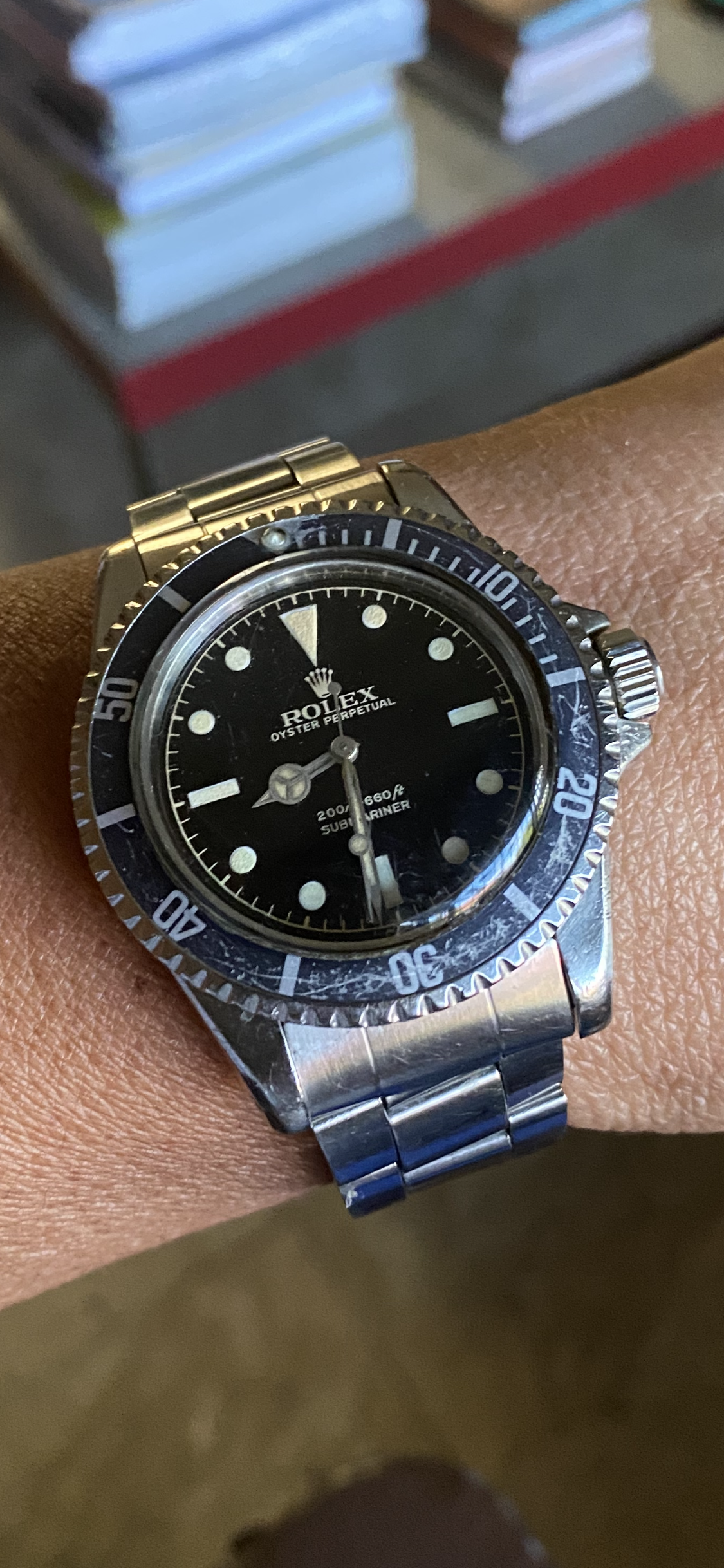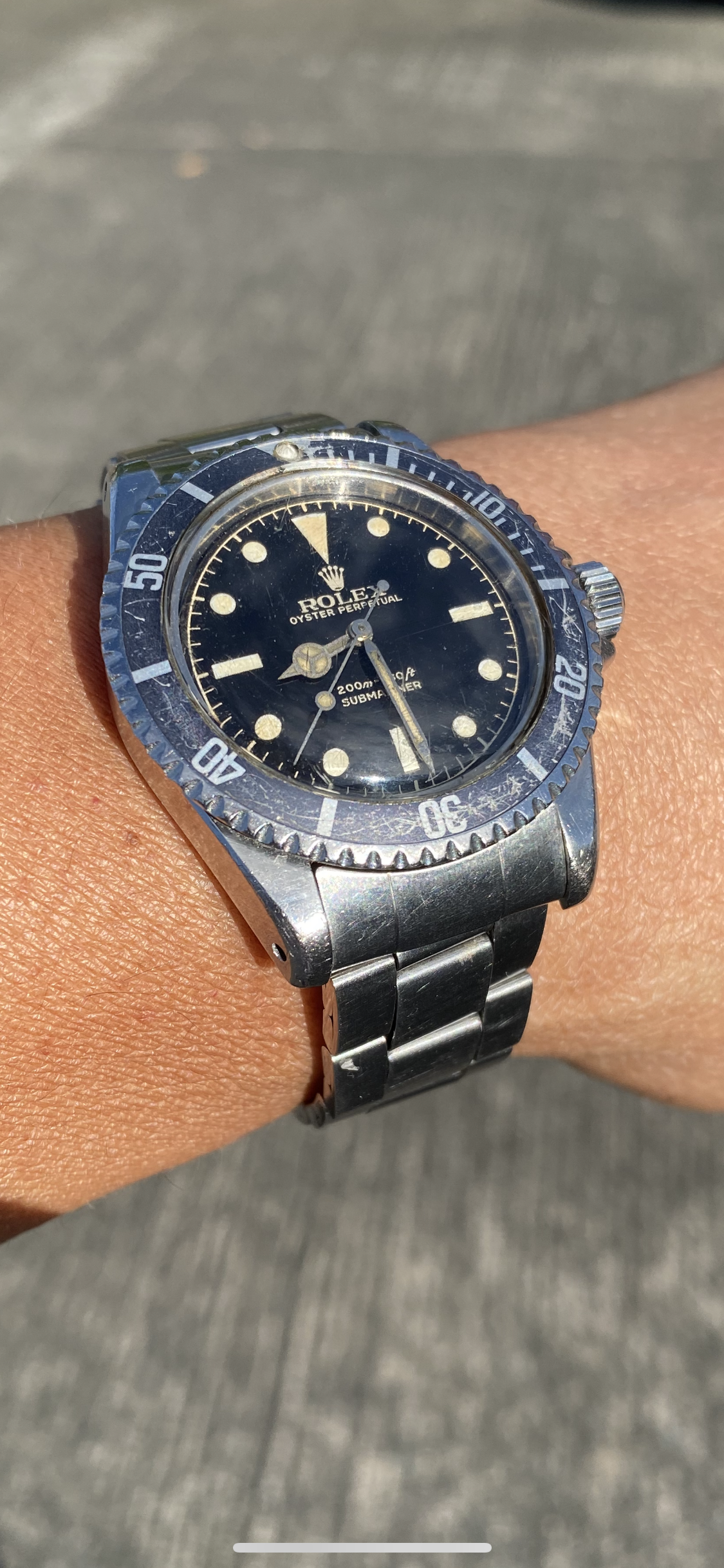 ·Its been a while searching for a Rolex Submariner 5512 and i finally got what i always wanted, a 1962 model with pointed crown guard and gilt chapter ring dial. I bought it from a nice gentleman from Hobart, Tasmania who is also a member of the Rolex Forum. He got the watch from a local diver who really used it for what it was intended. The case has pitting from salt water corrosion especially between the lugs but has not been polished to remove the pitting. Maybe some light hand polish to remove the grime and dirt. The original bevel on the lugs are still there. The bezel is faded with a fair amount of scratches which matches the overall character of the watch. The gilt chapter ring dial is in awesome condition despite the watch being used as a workhorse. Overall, a great addition to my collection.