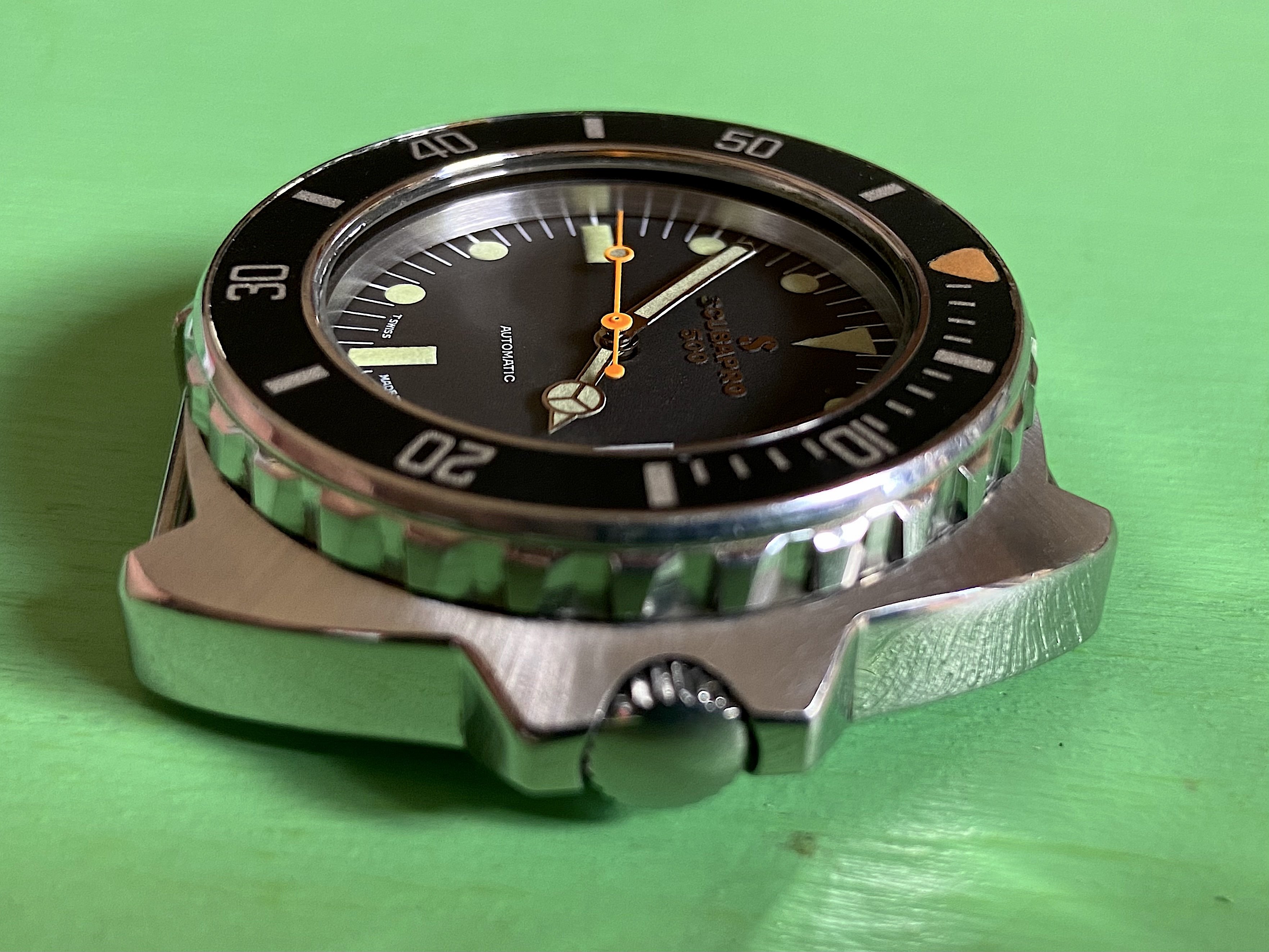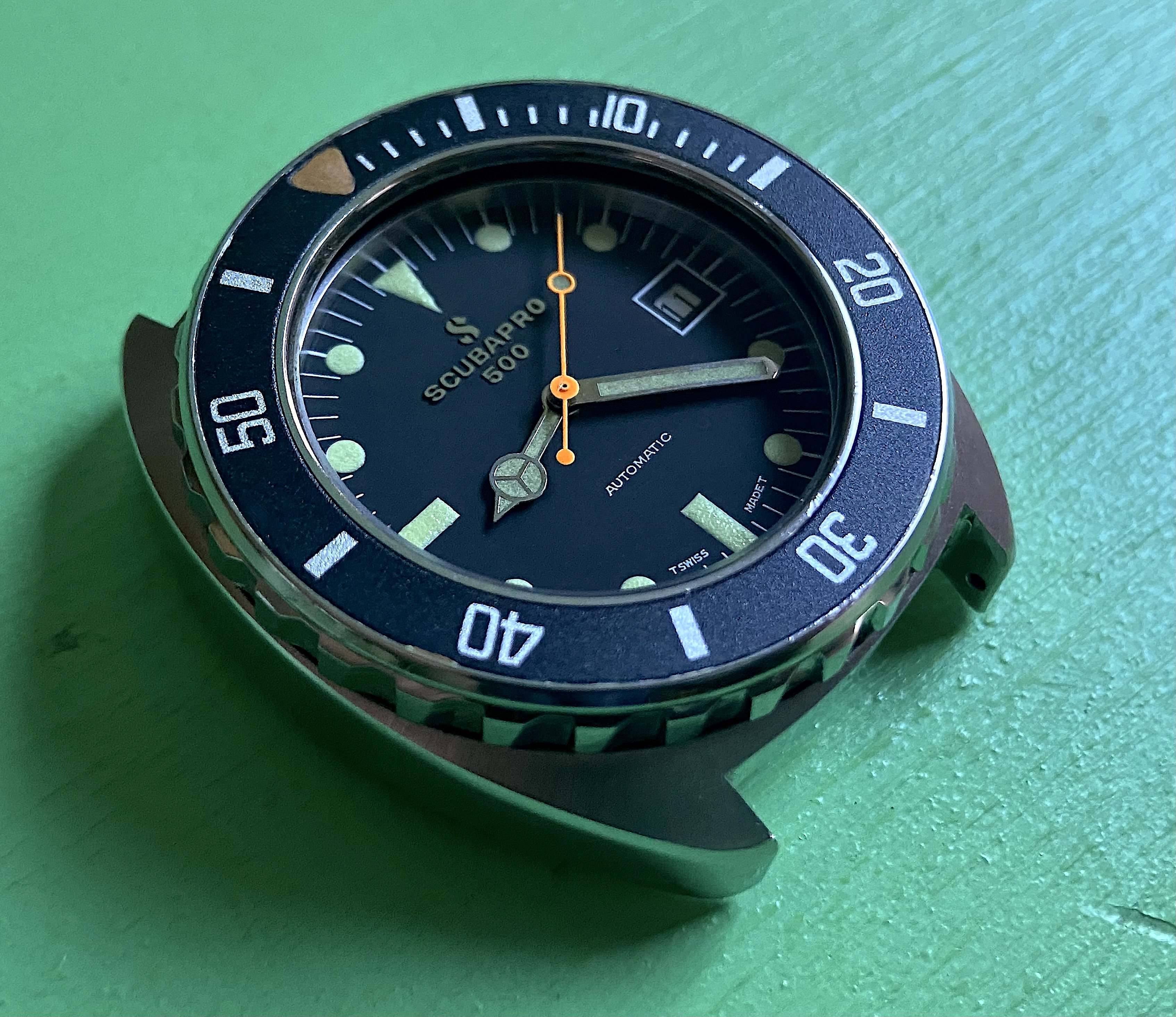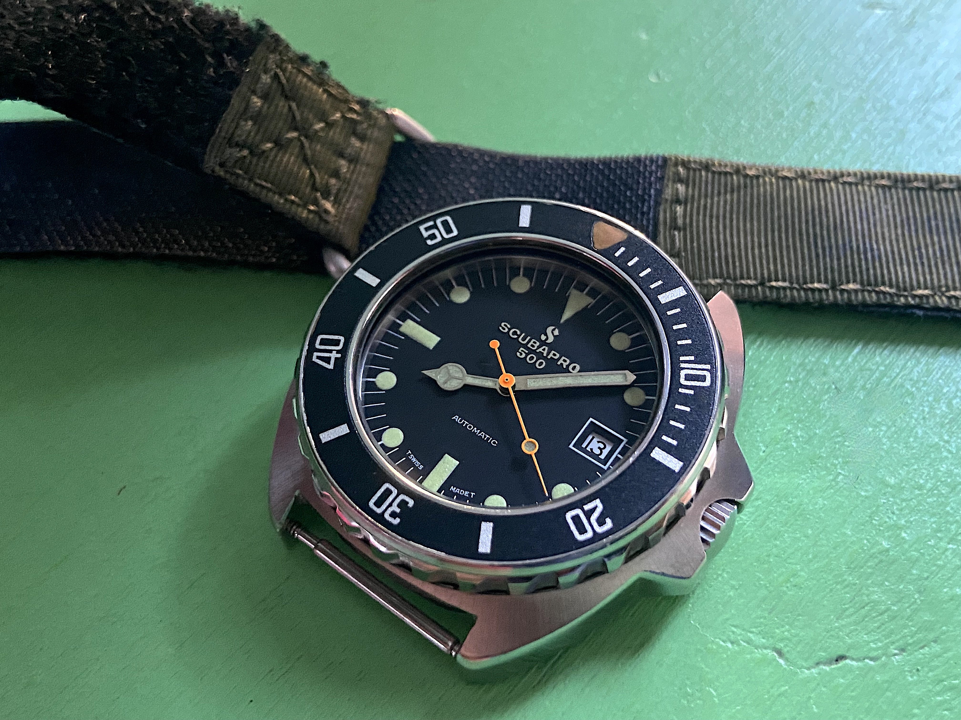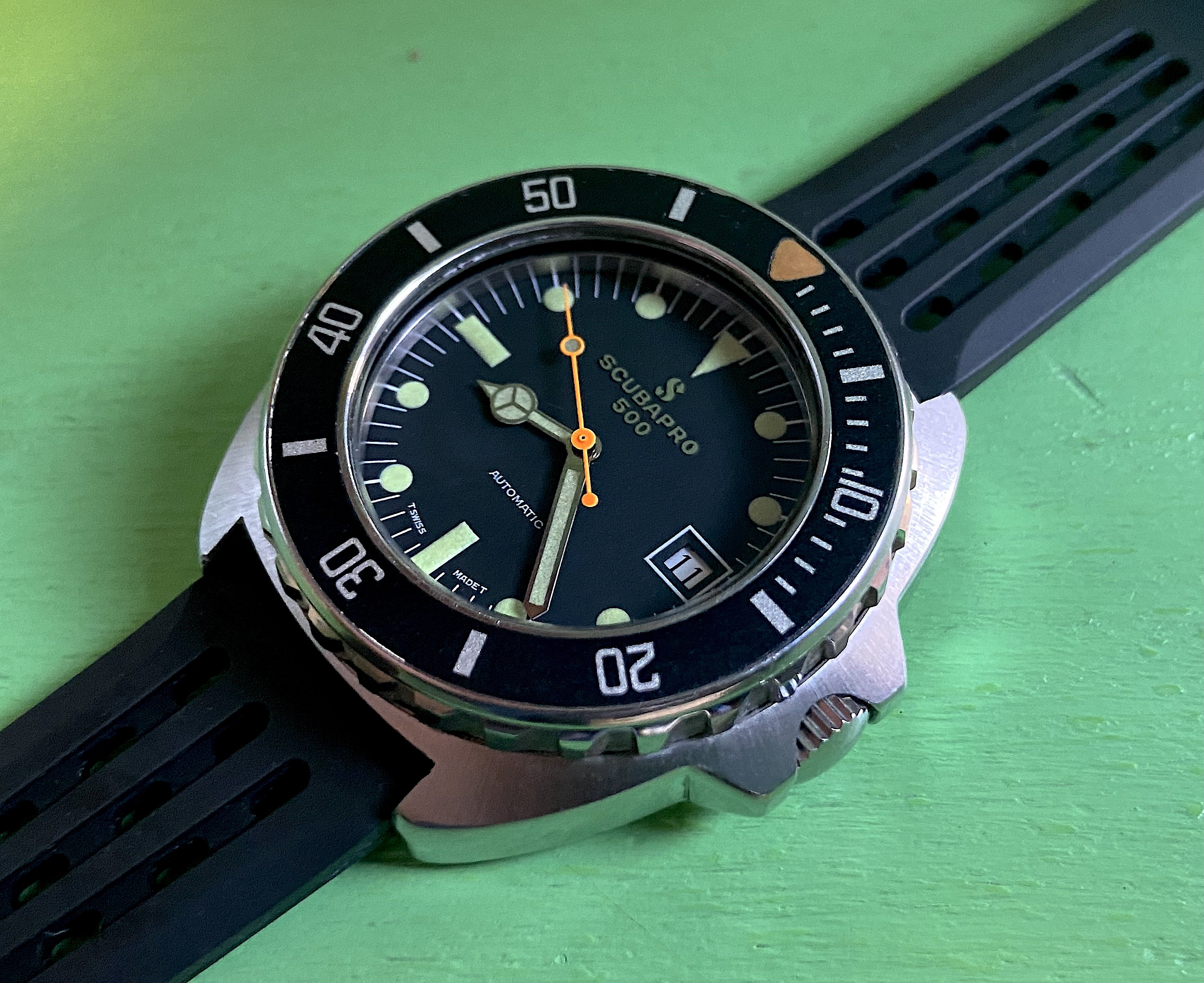 It's not uncommon to see lume color differentiation between dial and hands, usually some tan and green variants, from the factory on these Scubapro 500s. Makes for some interesting combinations, especially when they are distinct.