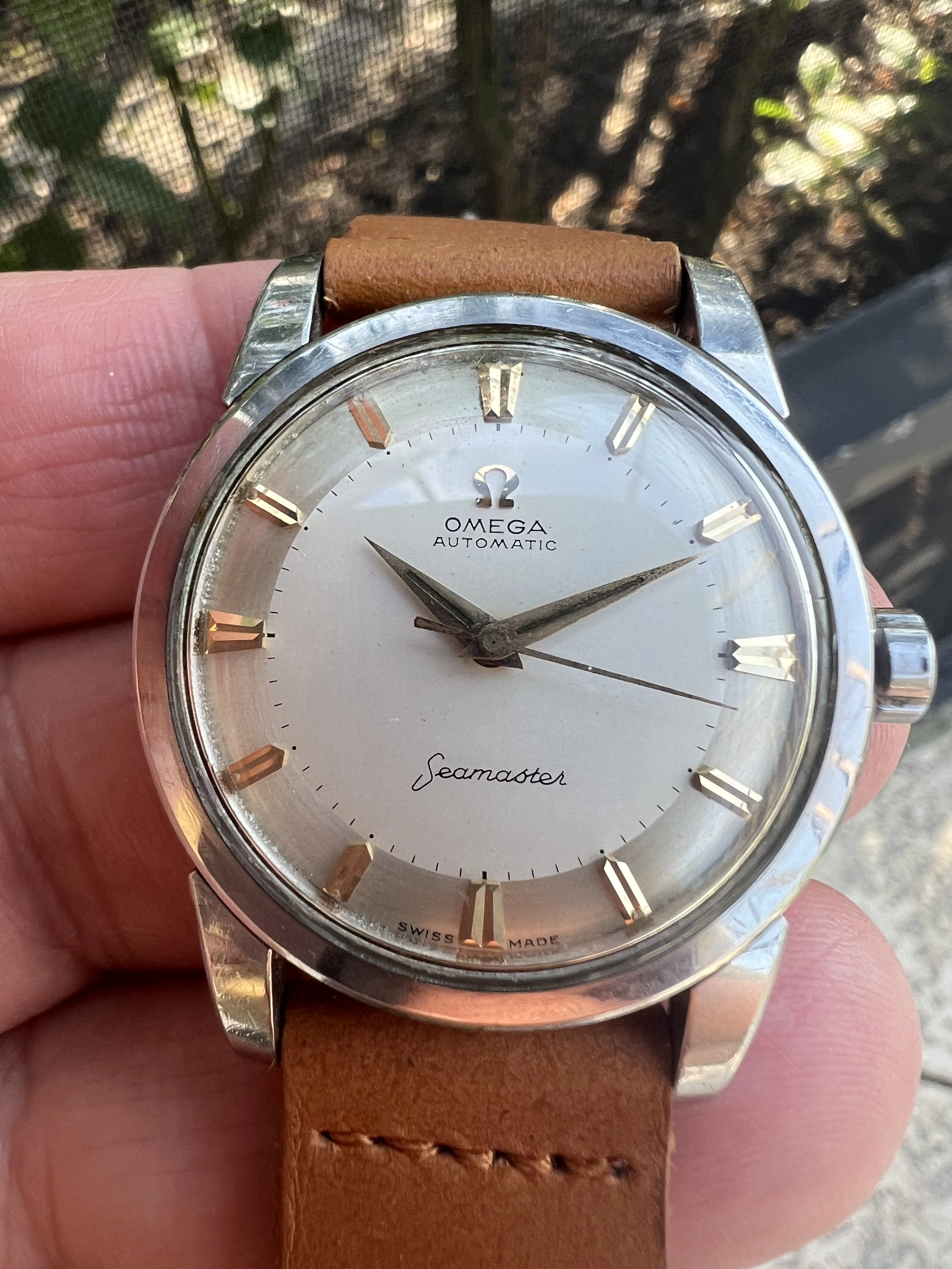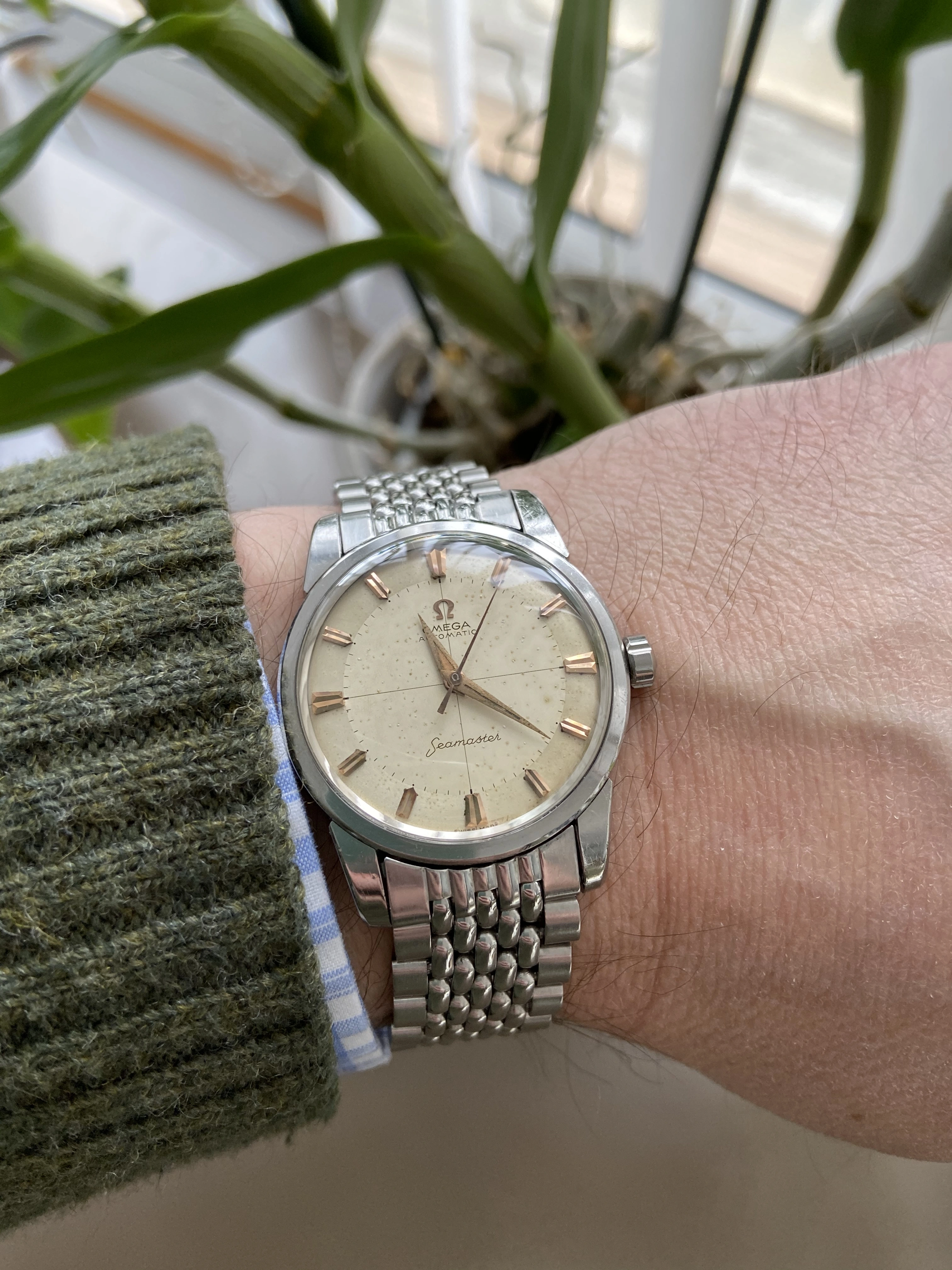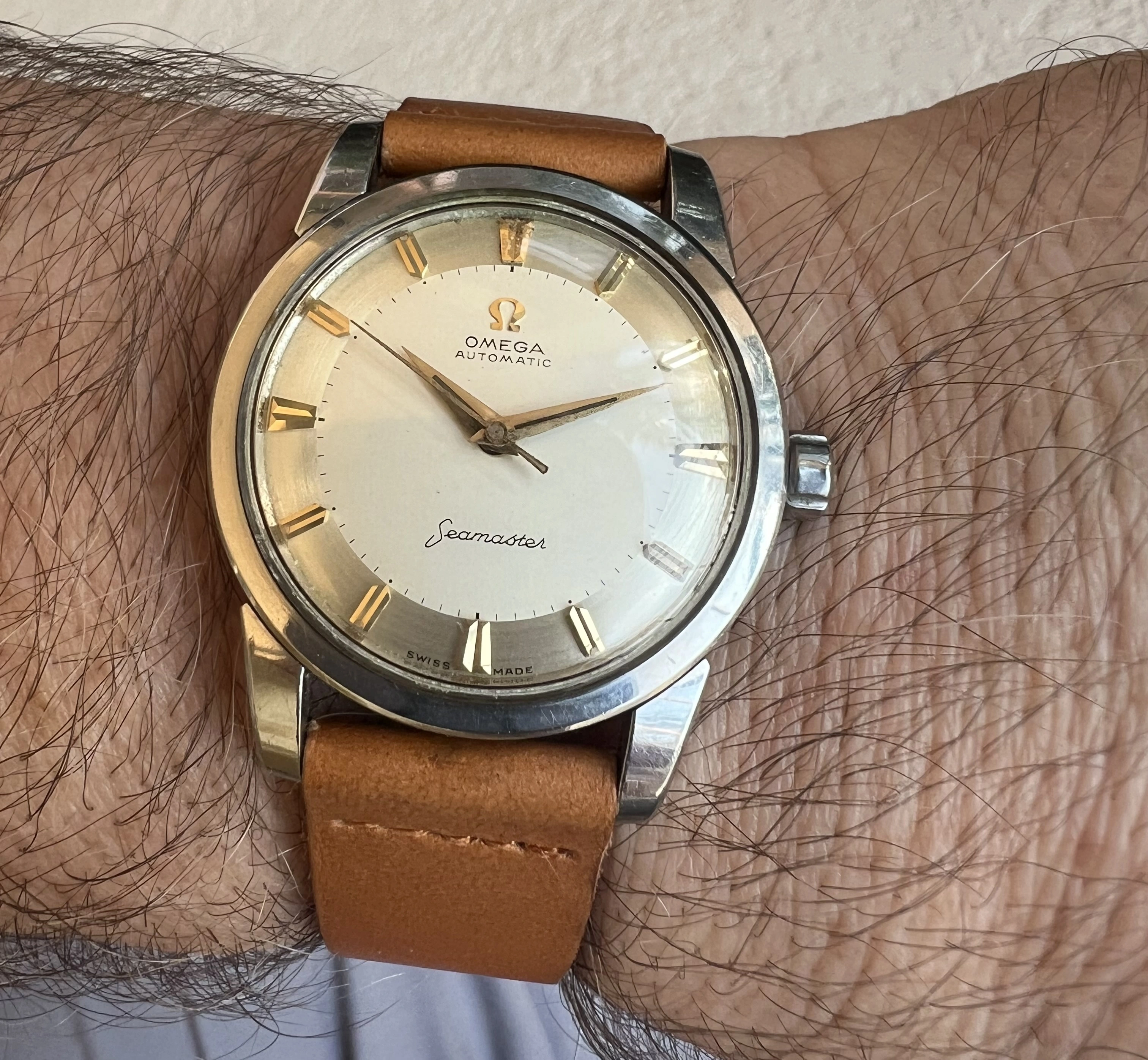 I love 1950s Seamasters, and my recent addition is this Seamaster 2846-14 SS automatic no date cal 501 from 1958. It came from an estate seller with very scratched up crystal as a bit of a gamble, but the 2 tone dial with gold furniture caught my eye and I hoped for nice surprise. The first photo is from the listing before, and rest after polywatch (repeated rounds). ( If this seems similar to posts by @qazwsx1 this is not accidental, as I enjoy and admire Teerapat’s discussions and collection.)