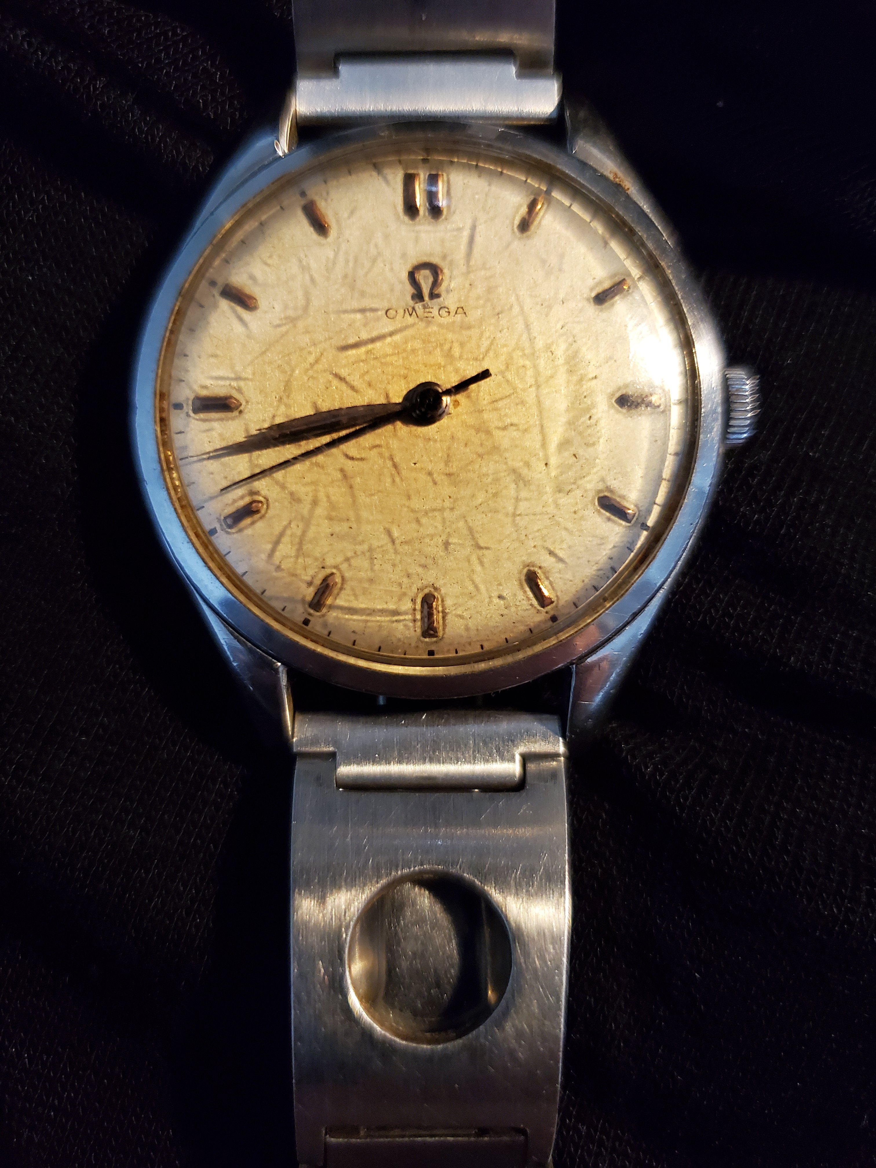 ·After my mother in law passed, my son Inherited an Omega we believe was his great grandfathers. It had been stored in a clean dry place for decades, and was unknown to the family until her death. We believe the watch was a post war gift from his wife. My son then stored it until recently, and I have decided to learn as much as possible about the watch, model, year, value etc. I am an Omega owner also, and I'd like to possibly get this watch repaired for my son's university graduation present. I brought the watch to my watch repair store, and they said it would have to go to Switzerland for refurbishment and repairs. Any advice on this watch would be greatly appreciated.