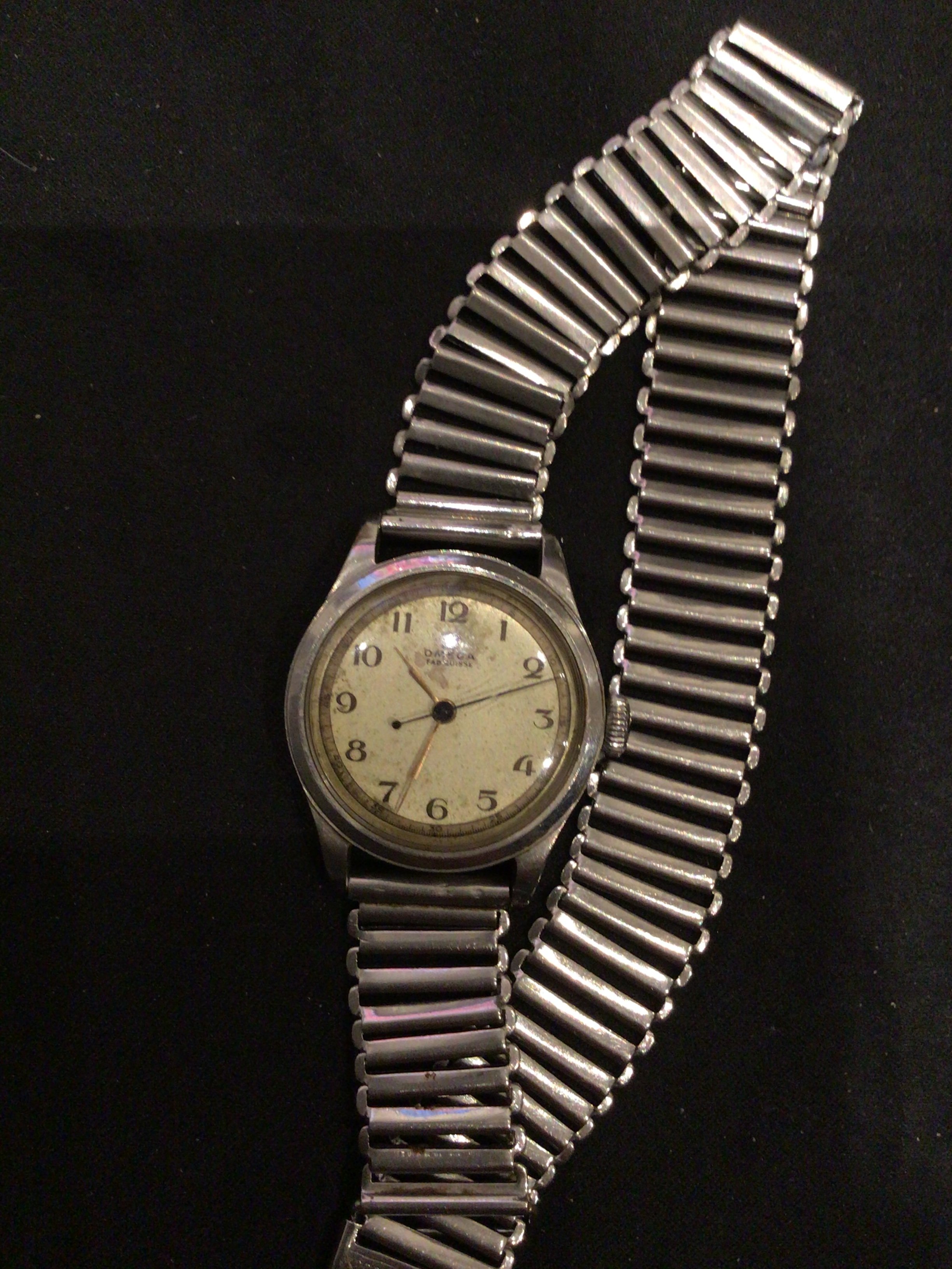 ·Hi everyone, I’m a newbie so please be gentle. My story is that my older brother died a few weeks ago and l have inherited Dads watch which was left to him when Dad died over 40 years ago. The background to the watch is that Dad bought it in the Middle East, when serving with the British Army during WW11. Dad was shipped off to war in 1939 and didn’t come home until 1946, missing the birth of my brother and only meeting him when he was 6, on his return home. I have been able to just about read the case serial number which is 10354512, and from that I believe that it was made in 1944. I’ve had some difficulty finding exactly the same watch, as the face includes the words “Fab Suisse”, which I haven’t been able to see elsewhere. Dad wore the watch every day throughout my childhood, I can’t remember him not wearing it but he would NEVER talk about the war or his time in Egypt, Libya, Turkey, Palestine etc. I’m not confident to try and take off the back, so any information that you wise guys could offer would be much appreciated, especially production, sale, rarity etc, thank you all. The watch is a precious reminder of Dad and one of only a few items I have from him and so I have no intention to get rid of it but if I could get some indication of value, that would be helpful.