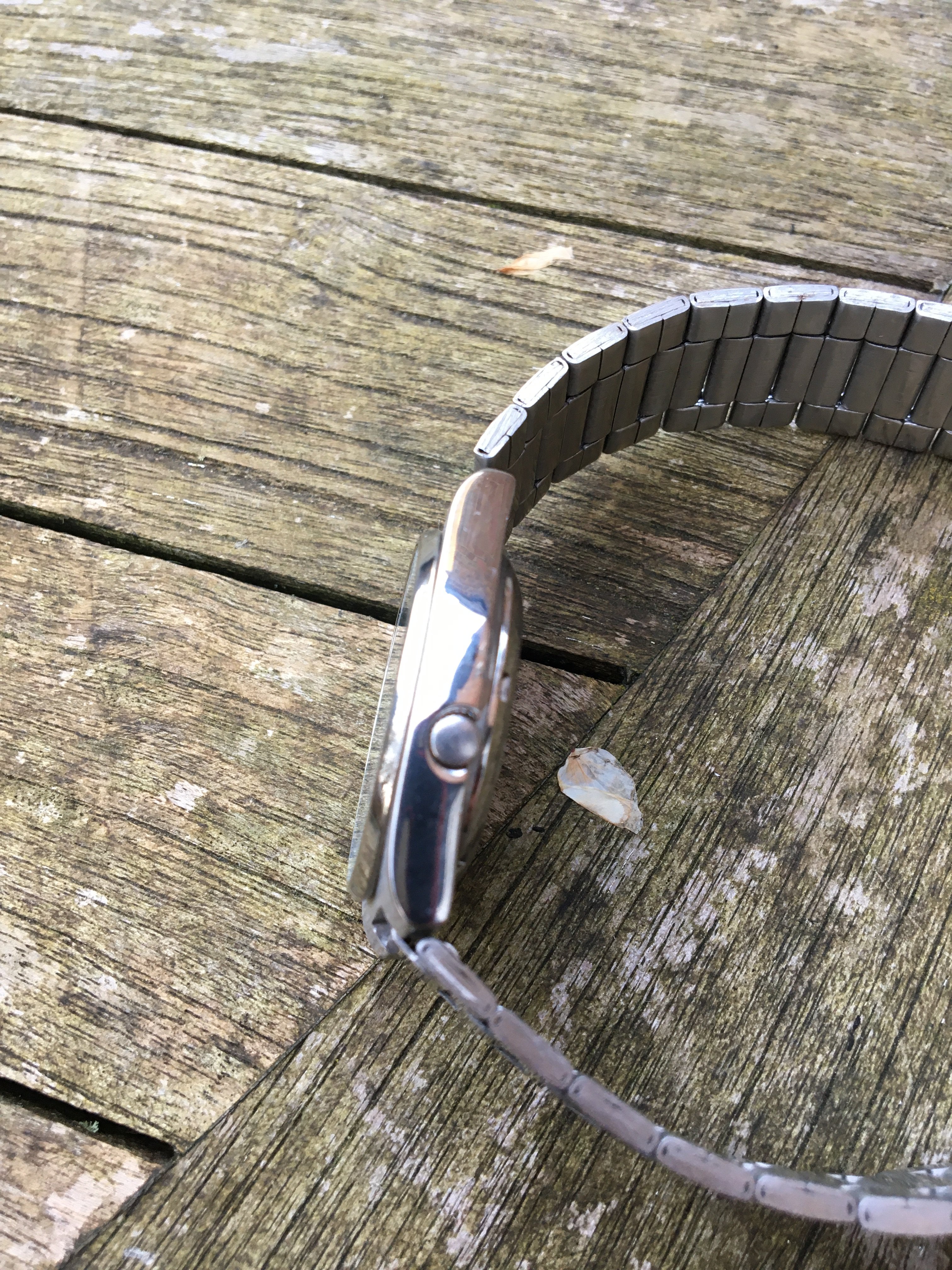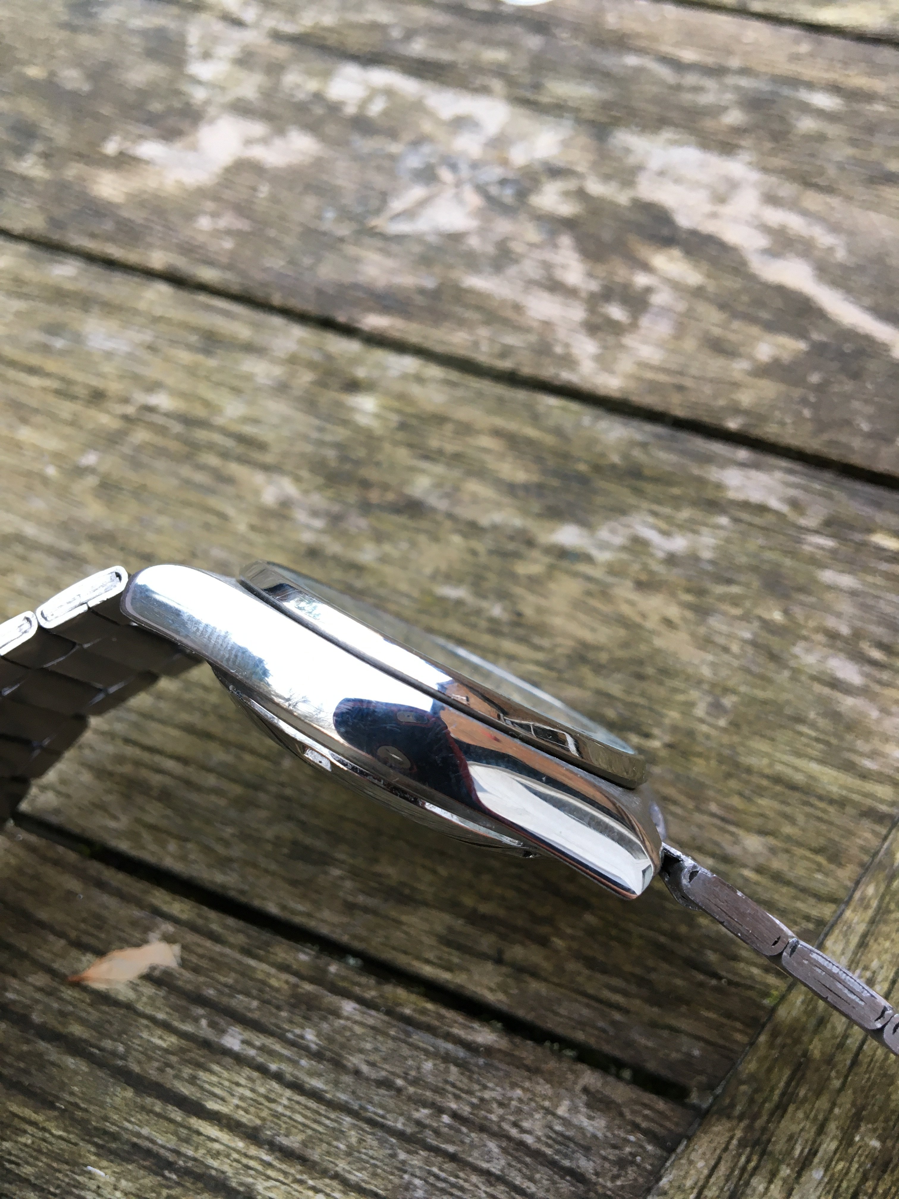 The patina is not great, I'm not sure if it's damaged. It has a reasonable aftermarket double-lock bracelet that suits the watch but has minimal adjustability - no removable links. The date changes bang on 12 and the day at 3.30 ish.