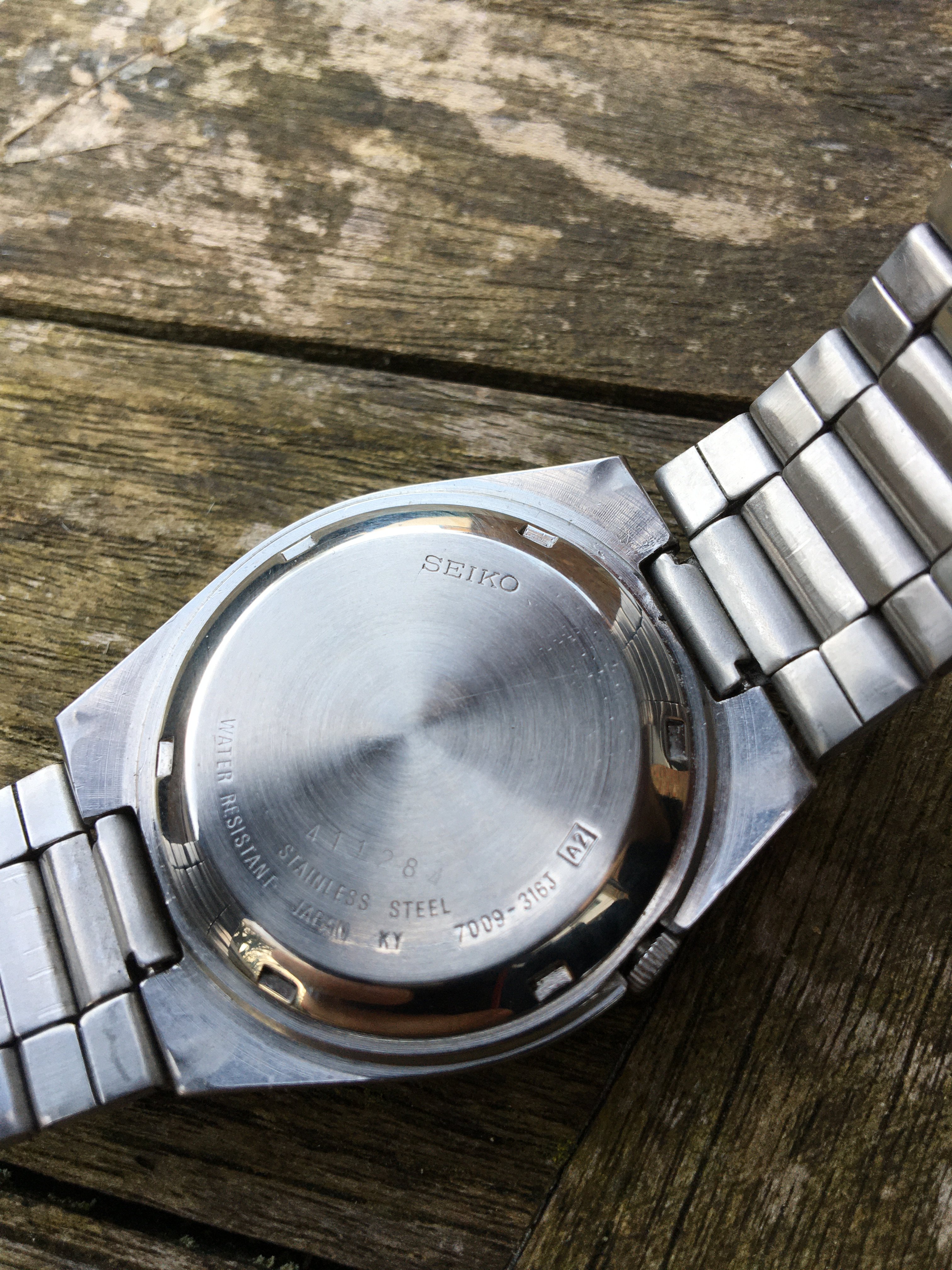 First is this 7009-316J dating, I believe from my research, to January 1994. I'll call it the white one. It keeps good time but the reserve power is poor. The watch looks to be in nice condition and, I would expect, relatively easy to get working properly. It's clearly been looked after in the past with service notes inside the case back.