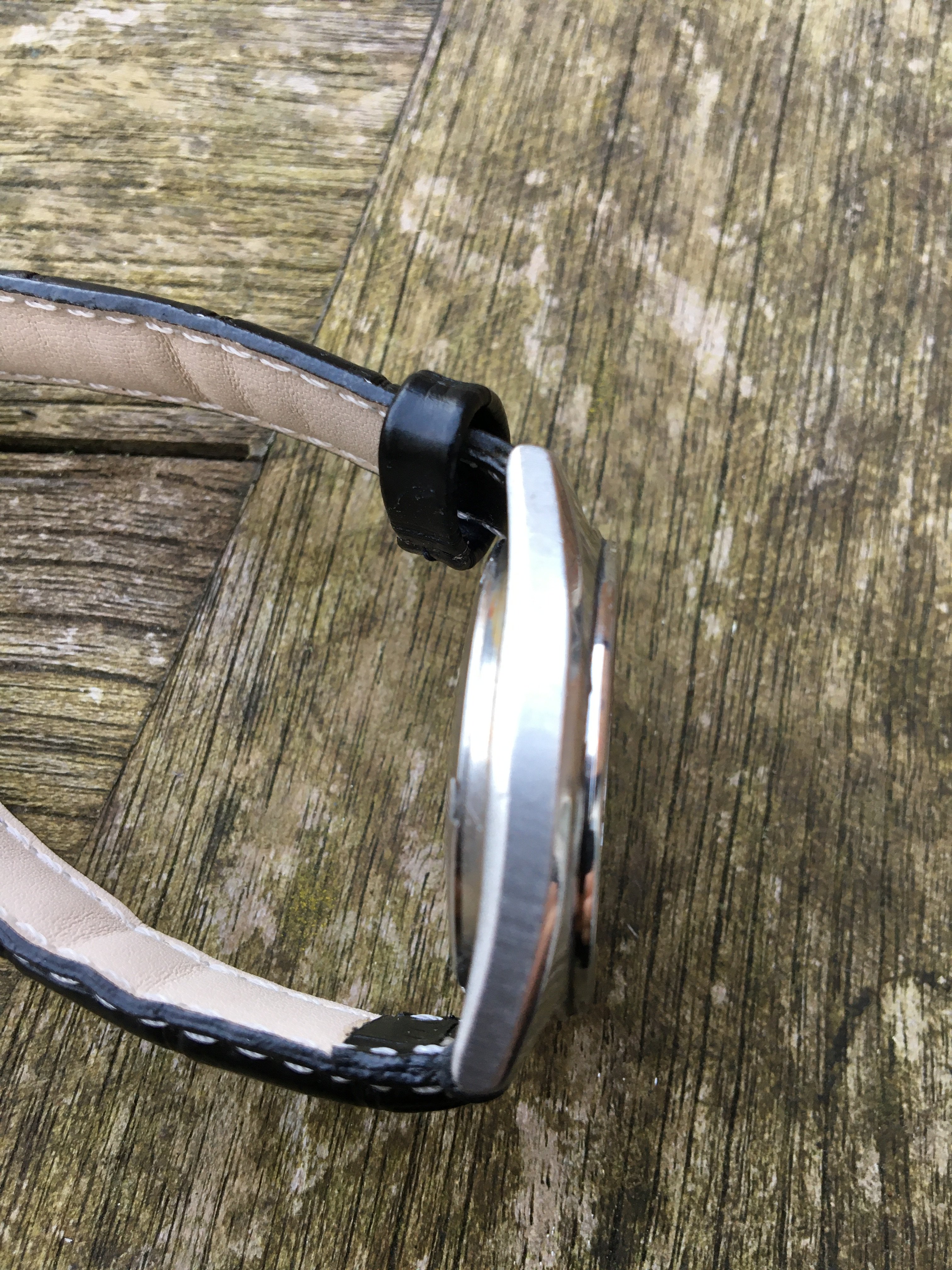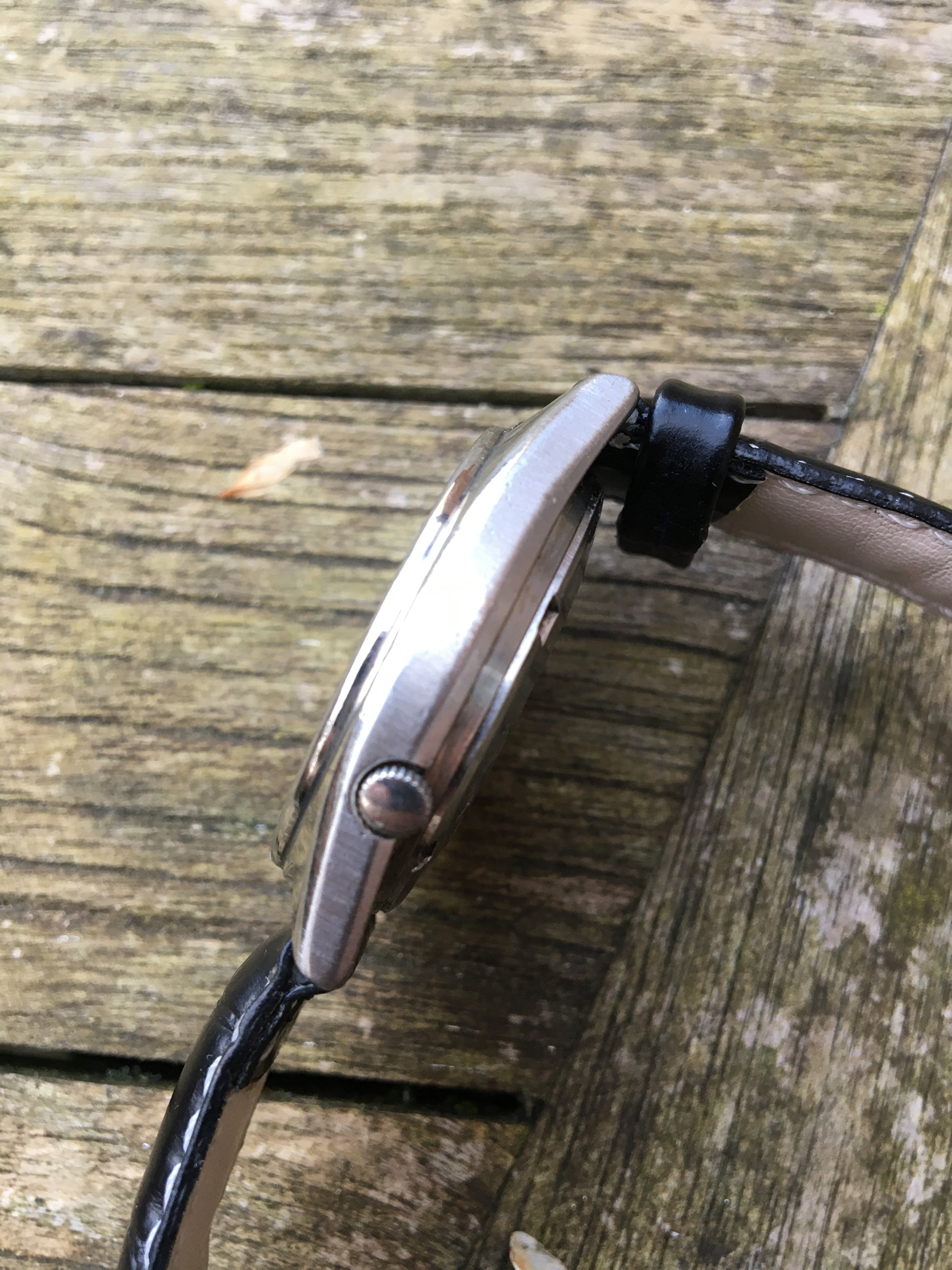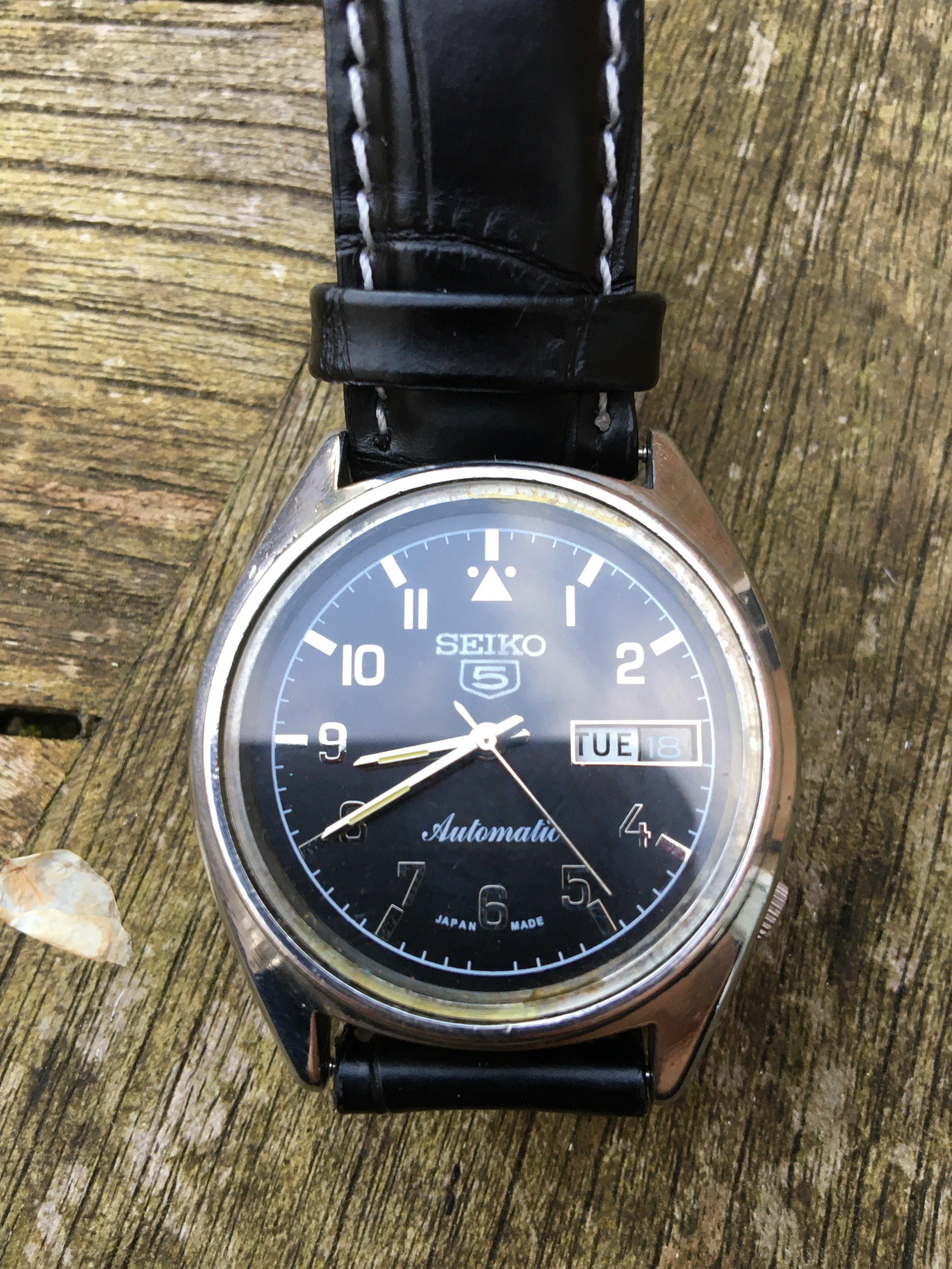 This should be the more interesting watch given its age, but I fear the dial may be wrong as I'd expect a dial code, but there is none. Besides, the dial does not go to the edge of the aperture so I think it's maybe smaller than the original. The date changes at around 1 o'clock and the day at about 2.20. It's on a newish generic leather strap.