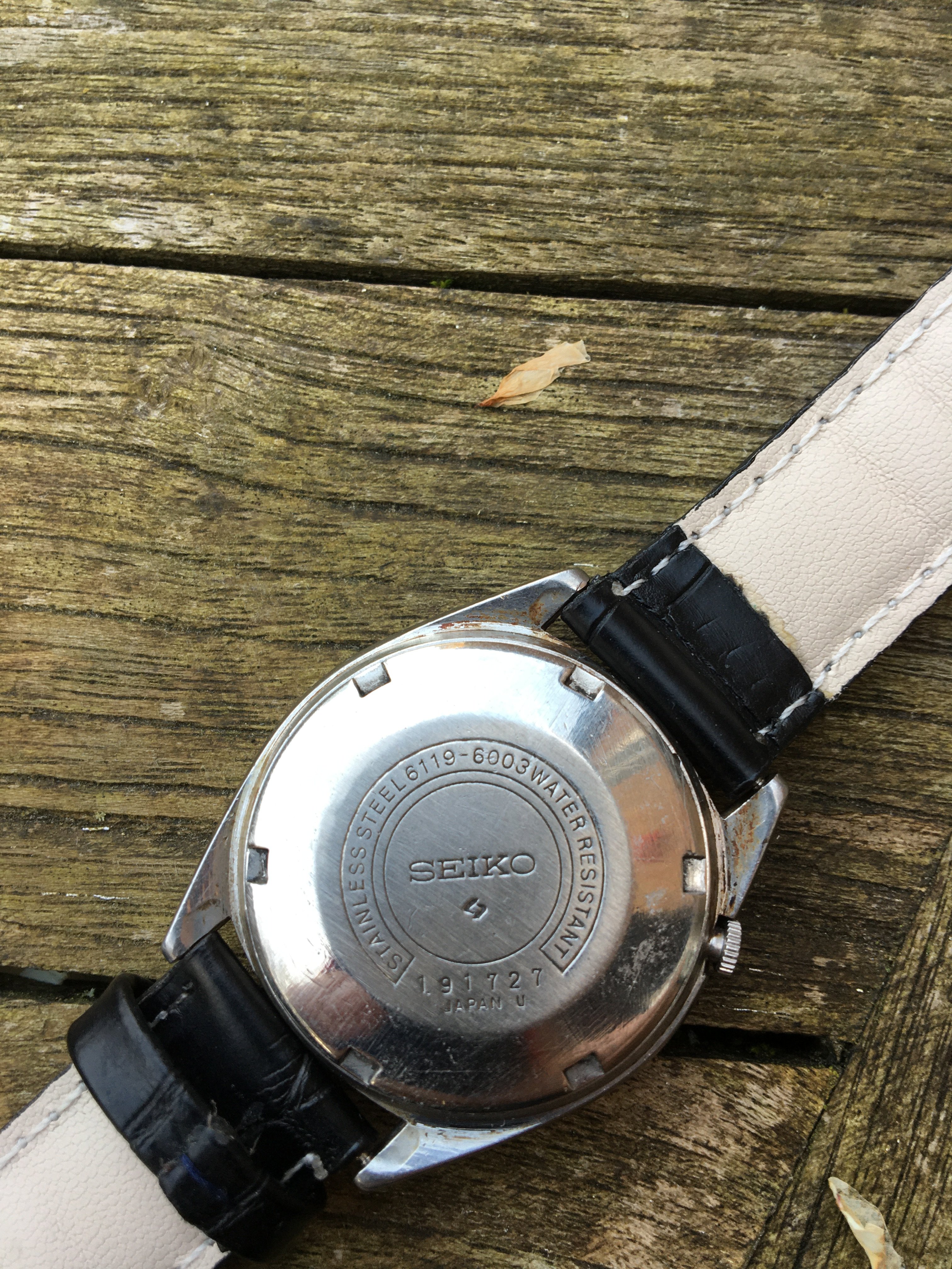 The second, black dial watch is 6119-6003 dating from September 1971. It's in goodish condition with possible traces of rust. Unlike the other one, I've not been able to open the back yet as I don't have a tool (the white one was loose enough for me to open with my fingers).