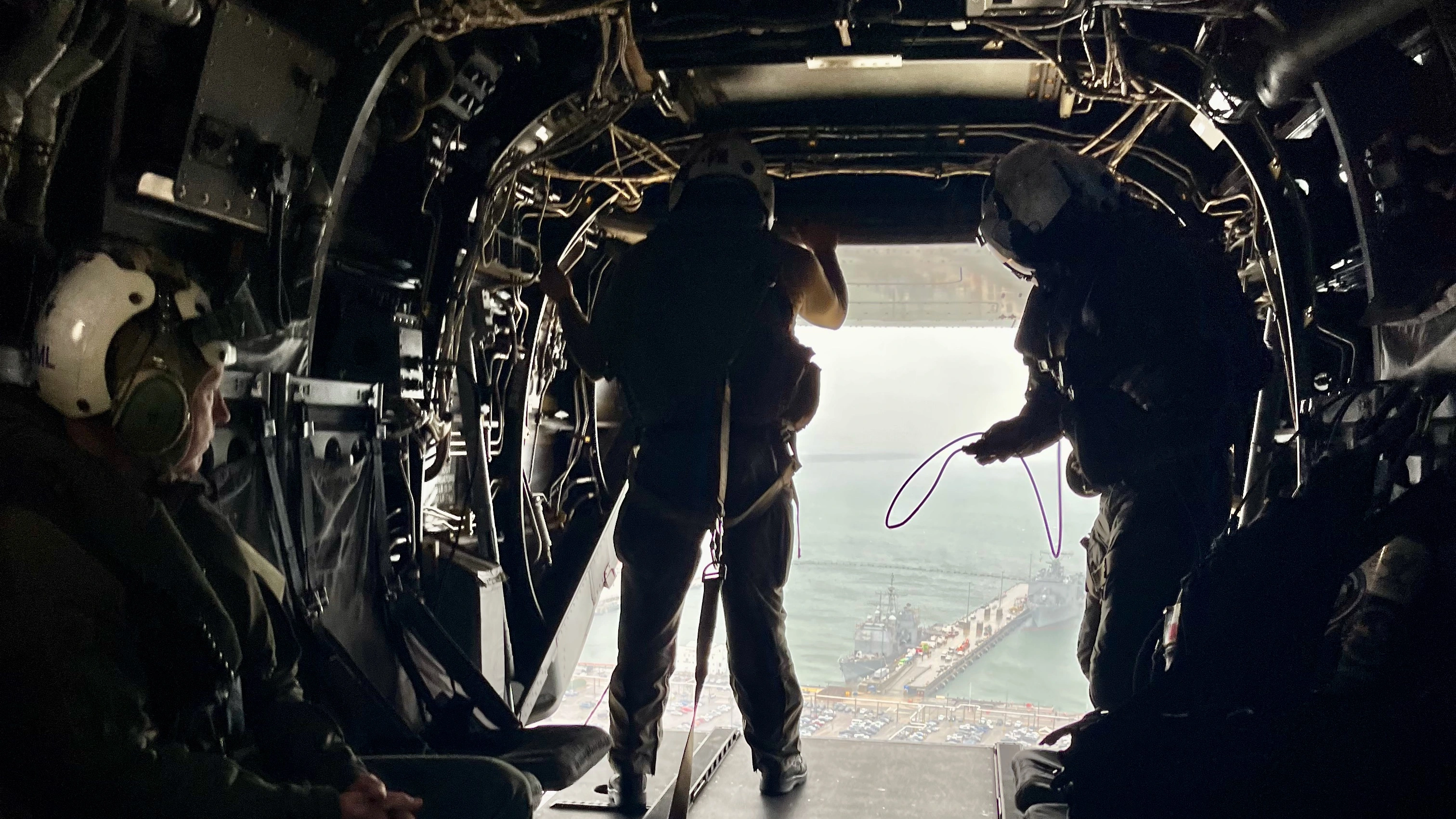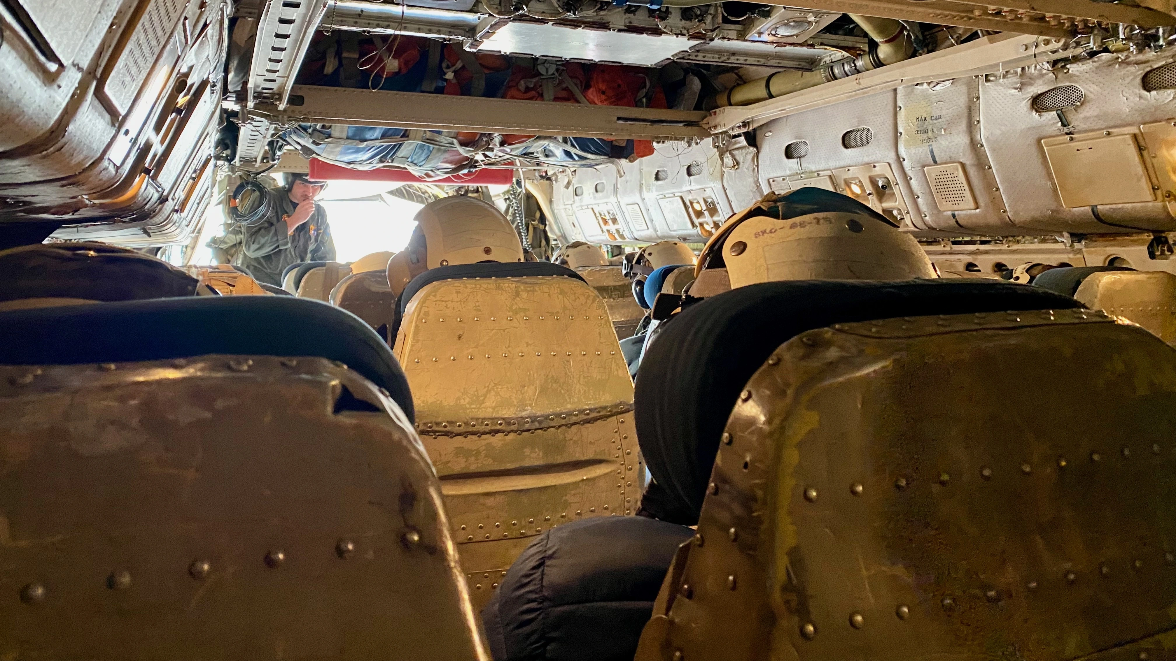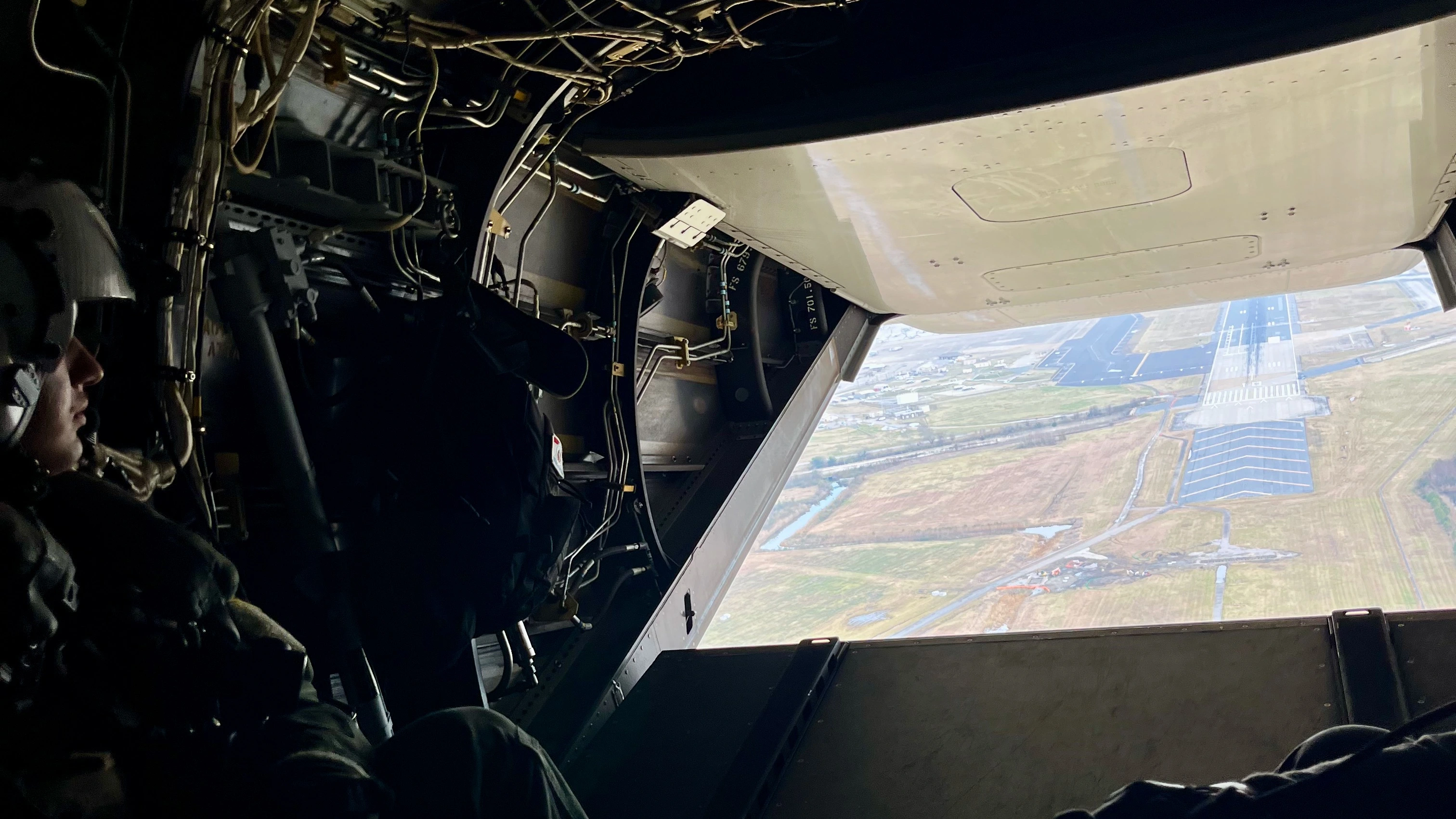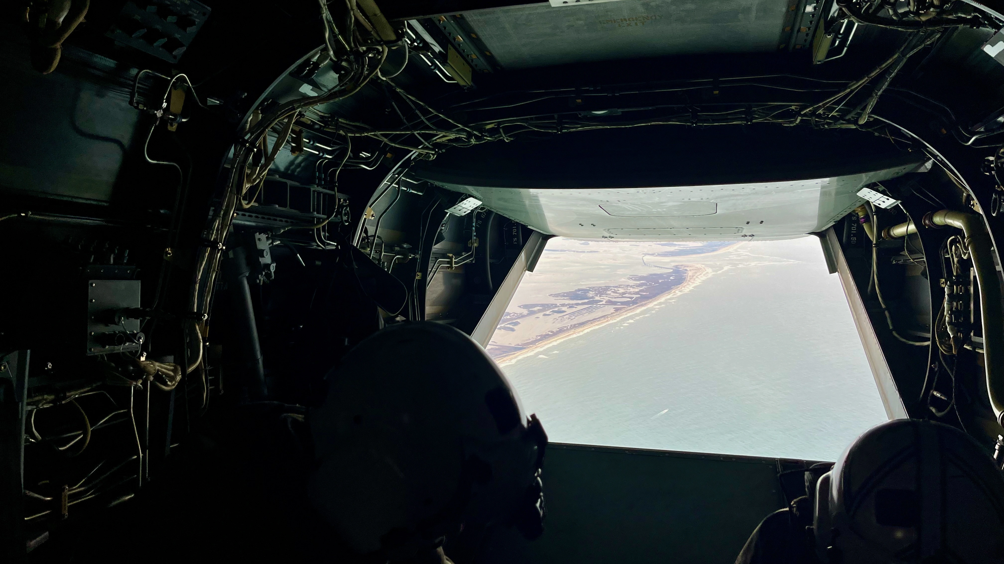 For the flight out the rear cargo ramp is open. We were told that if we went down this was our exit. This was shortly after departure with the runway behind us.