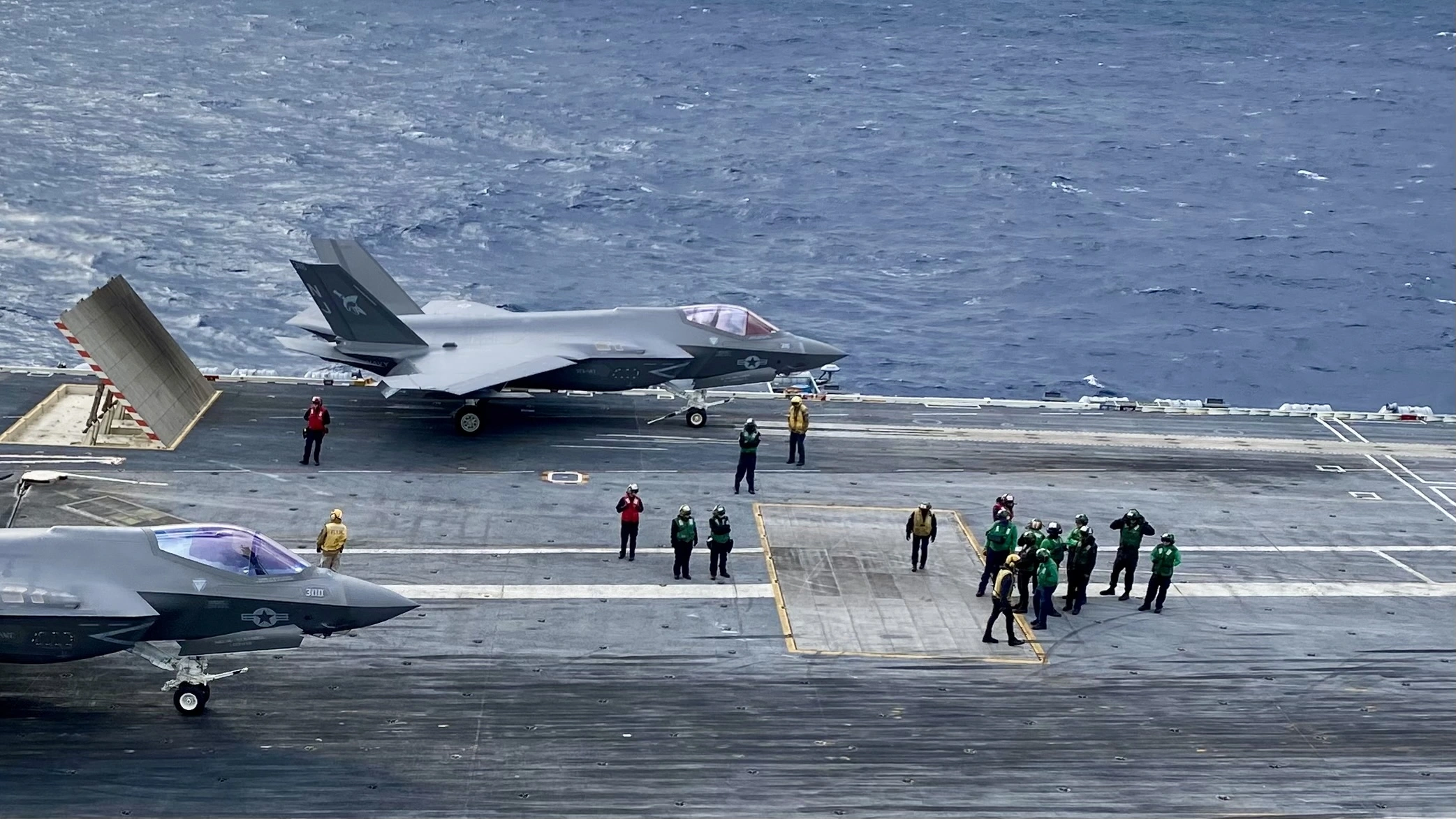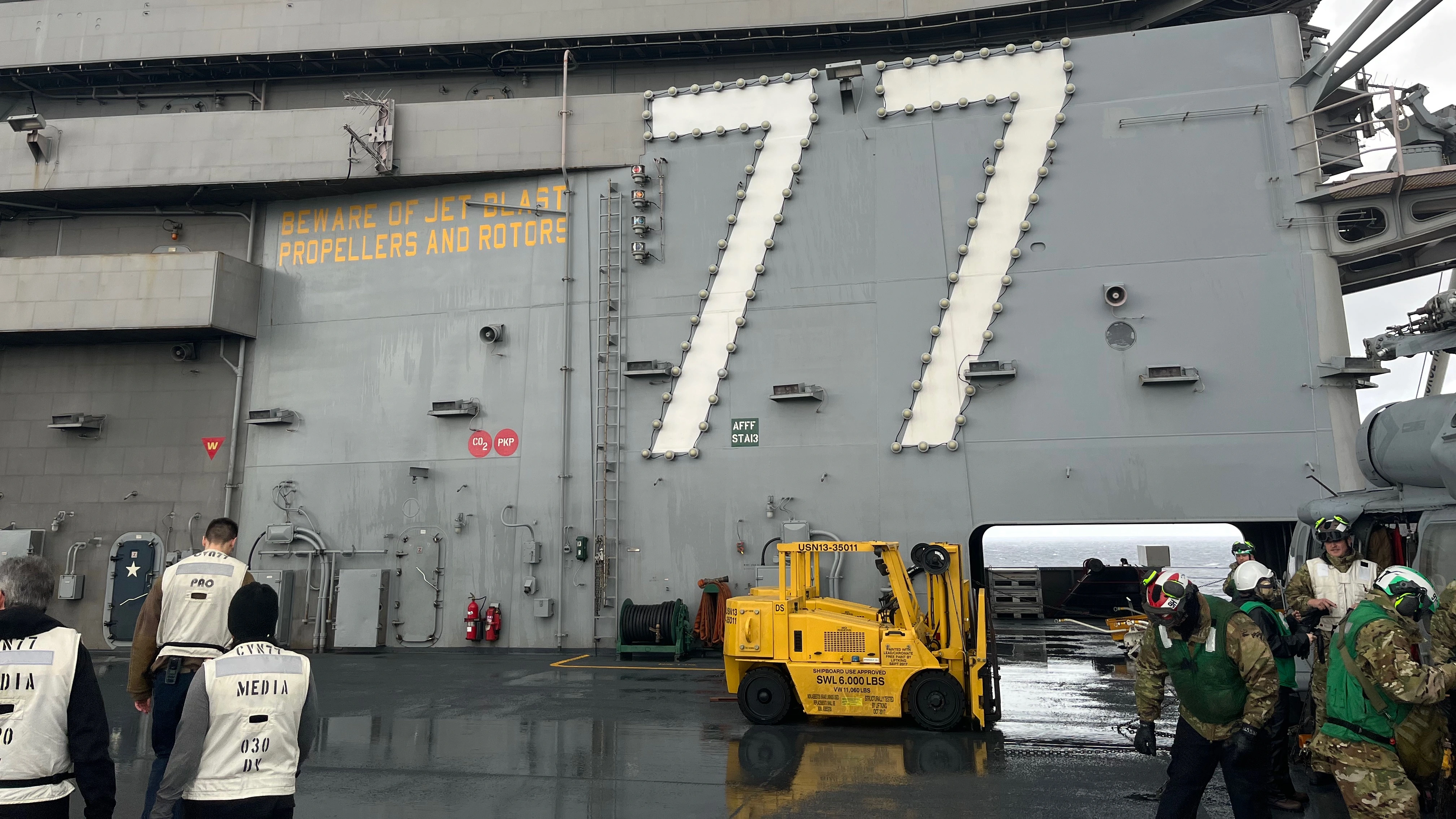 Now, for one of the most incredible opportunities we had. It was to go out to the LSO (Landing Signal Officer) platform. From this area on the aft of the ship adjacent to the landing area, pilots will talk to the landing jets advising them along the way as they look at monitors showing the planes approach. This platform is grated and open to the ocean passing underneath.