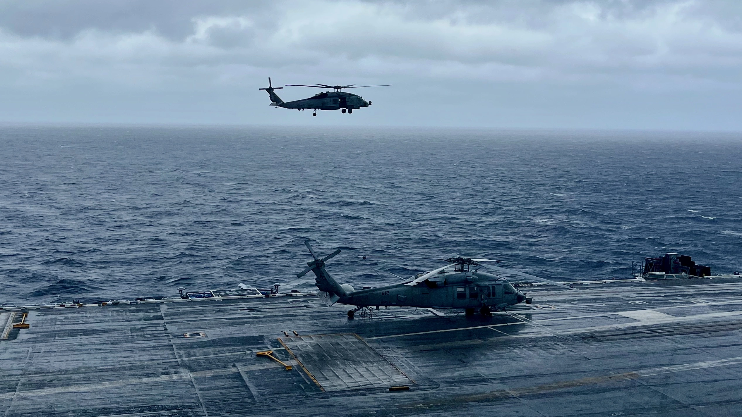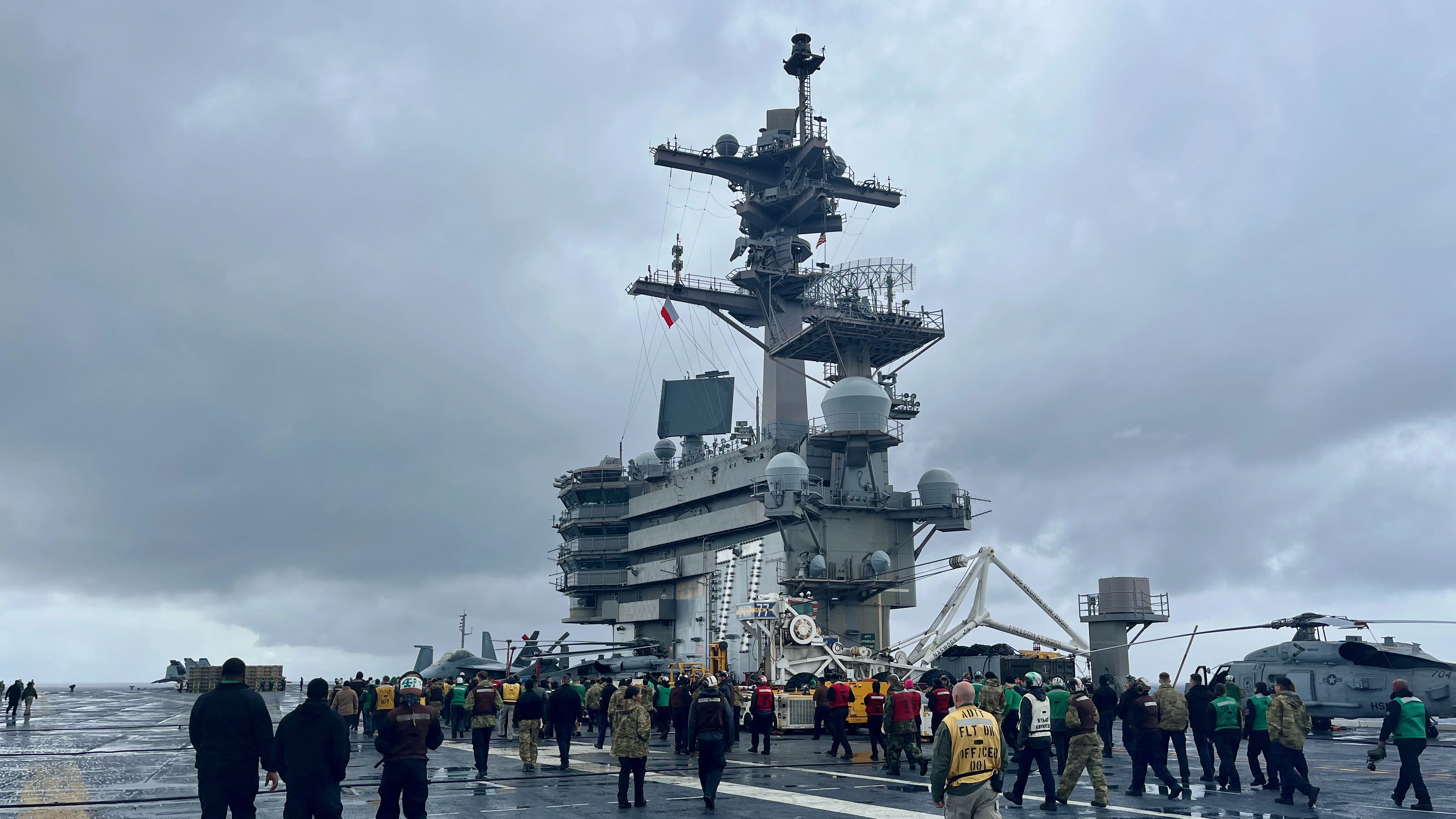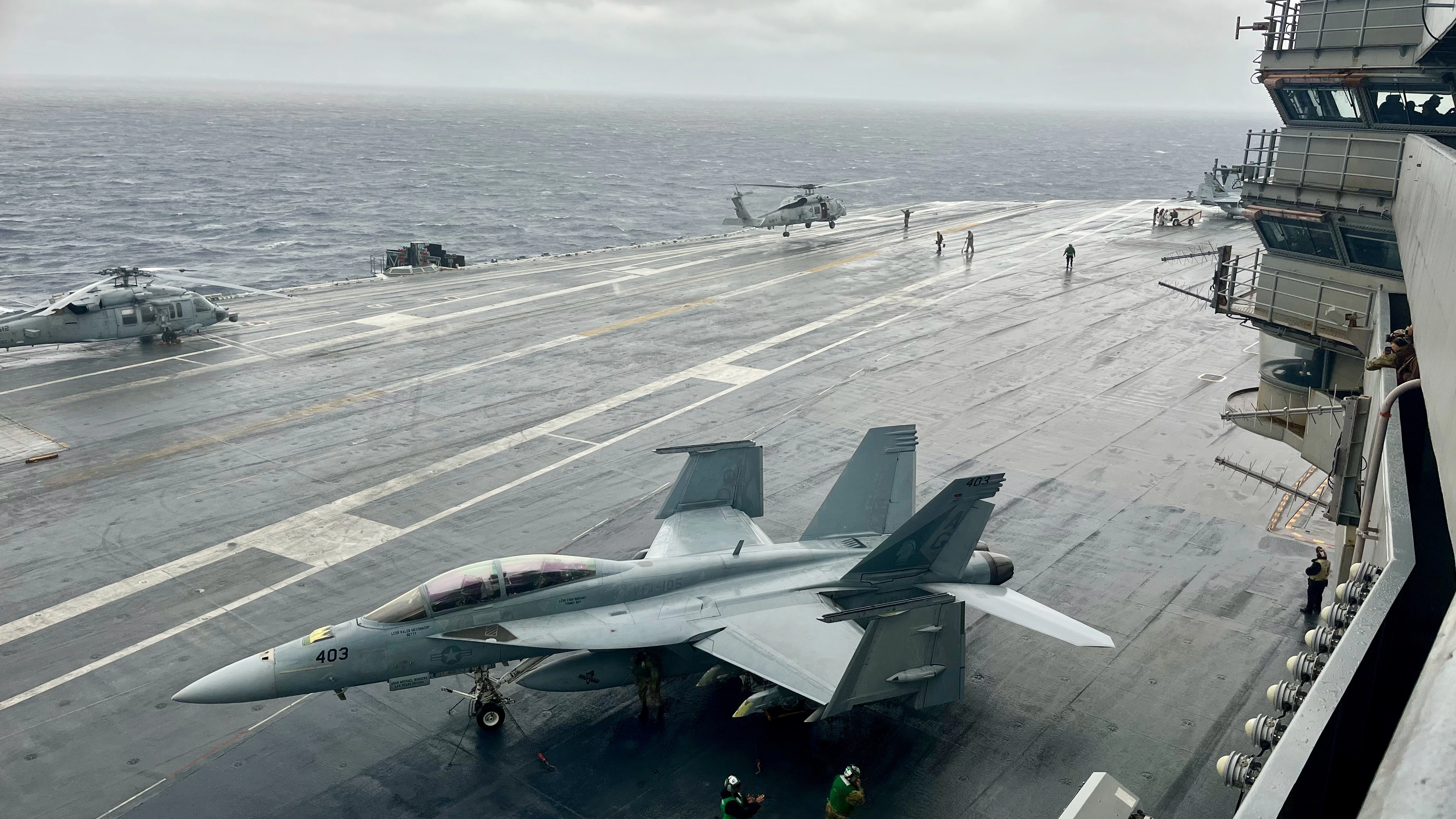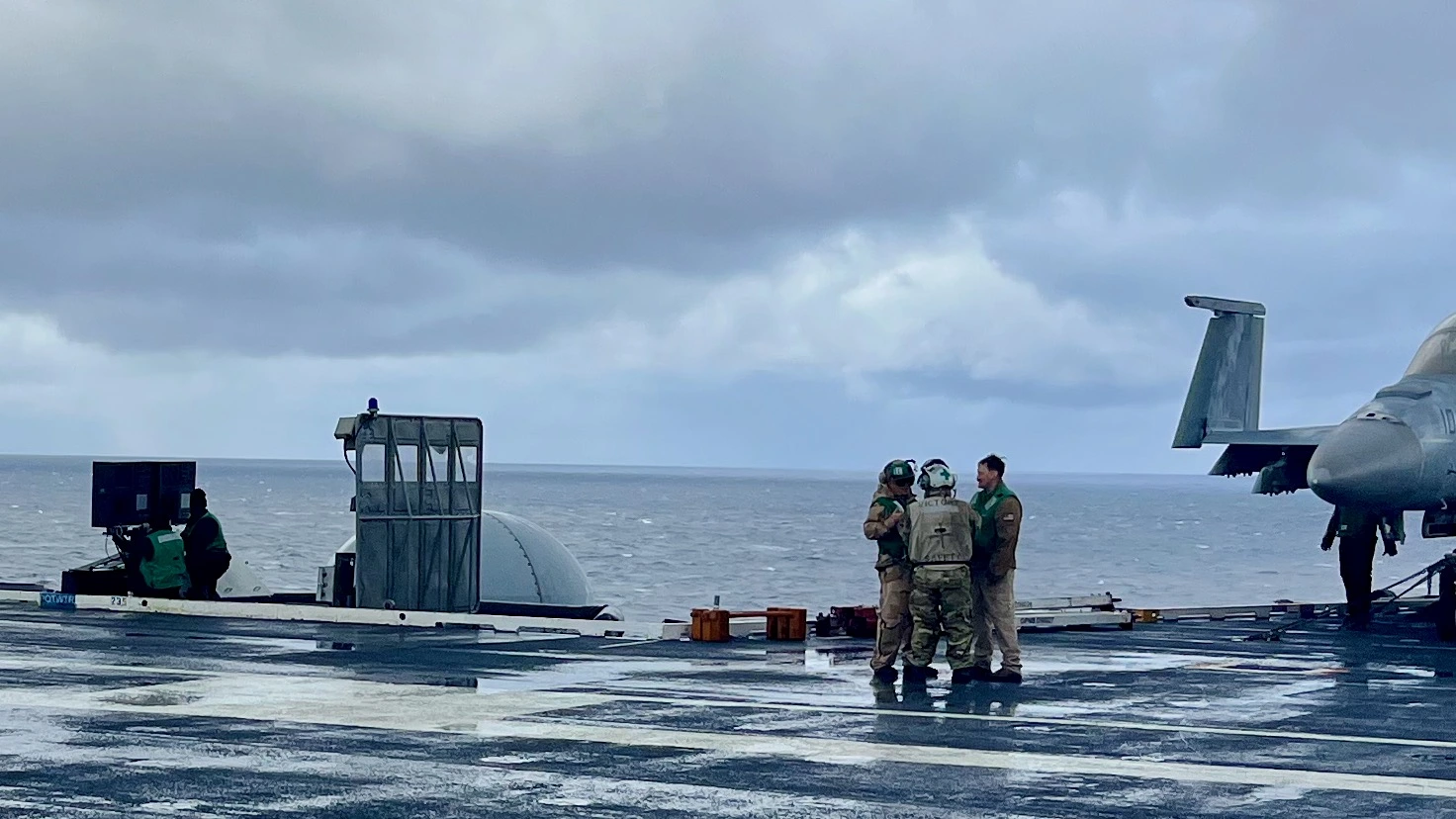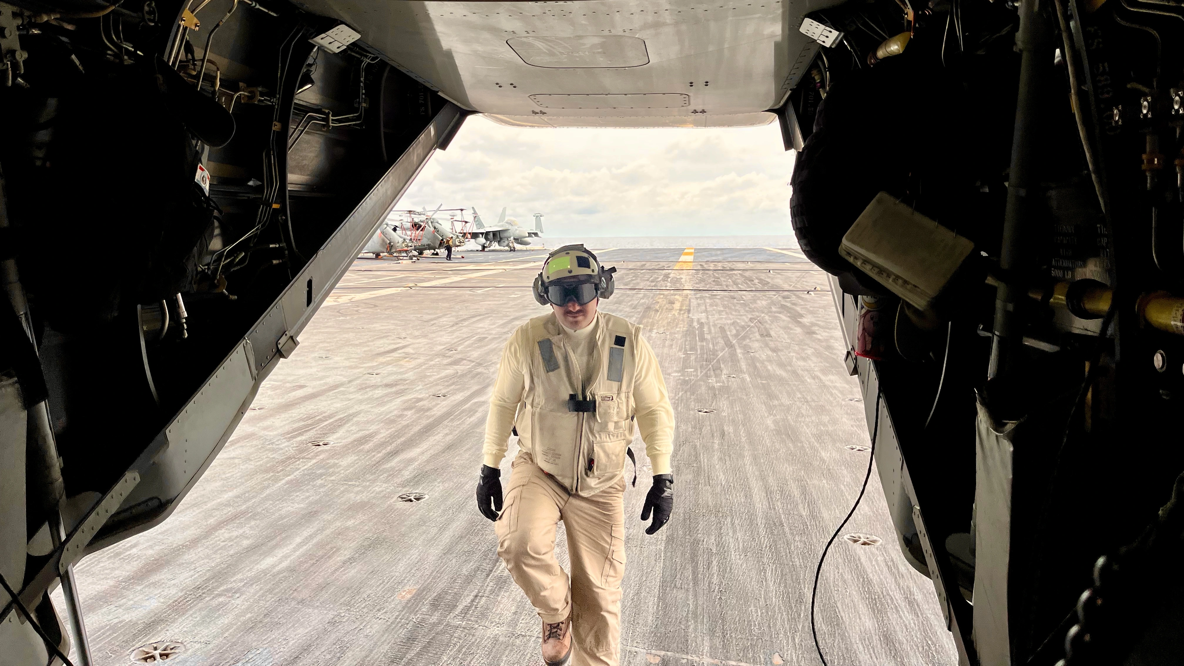 After just over an hour flight time we arrive at the ship and are greeted by the Aircrew Transfer Officer. I love this picture.