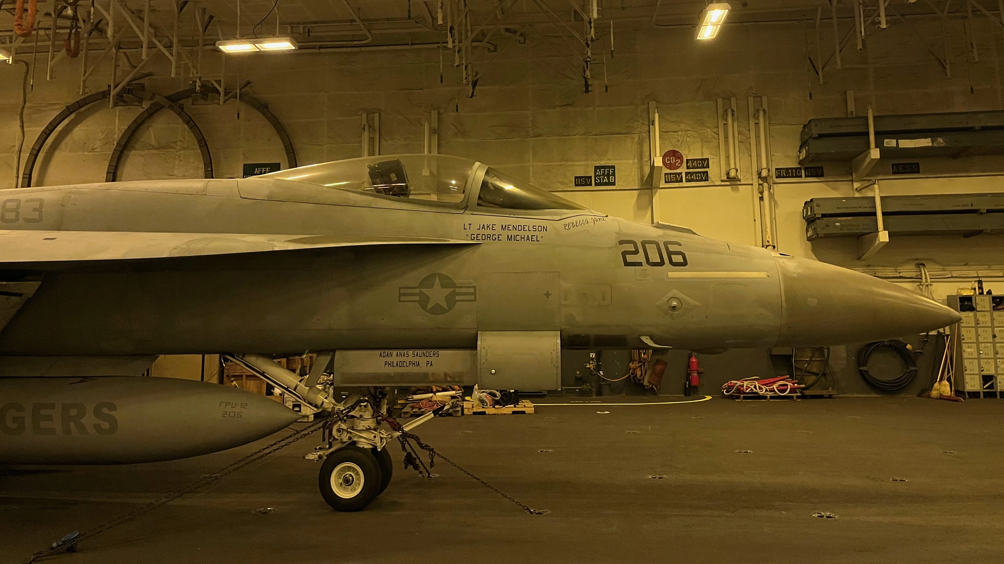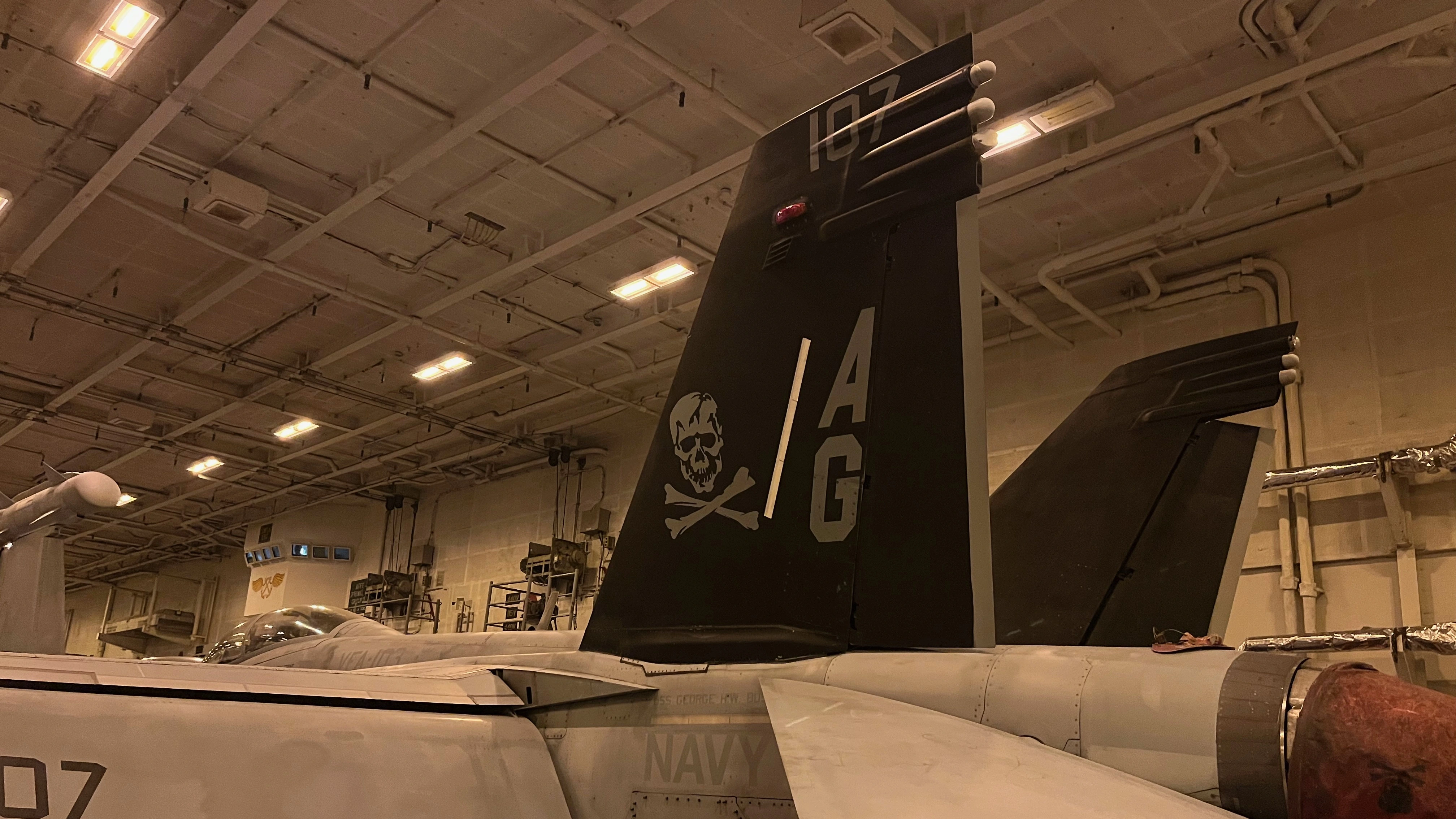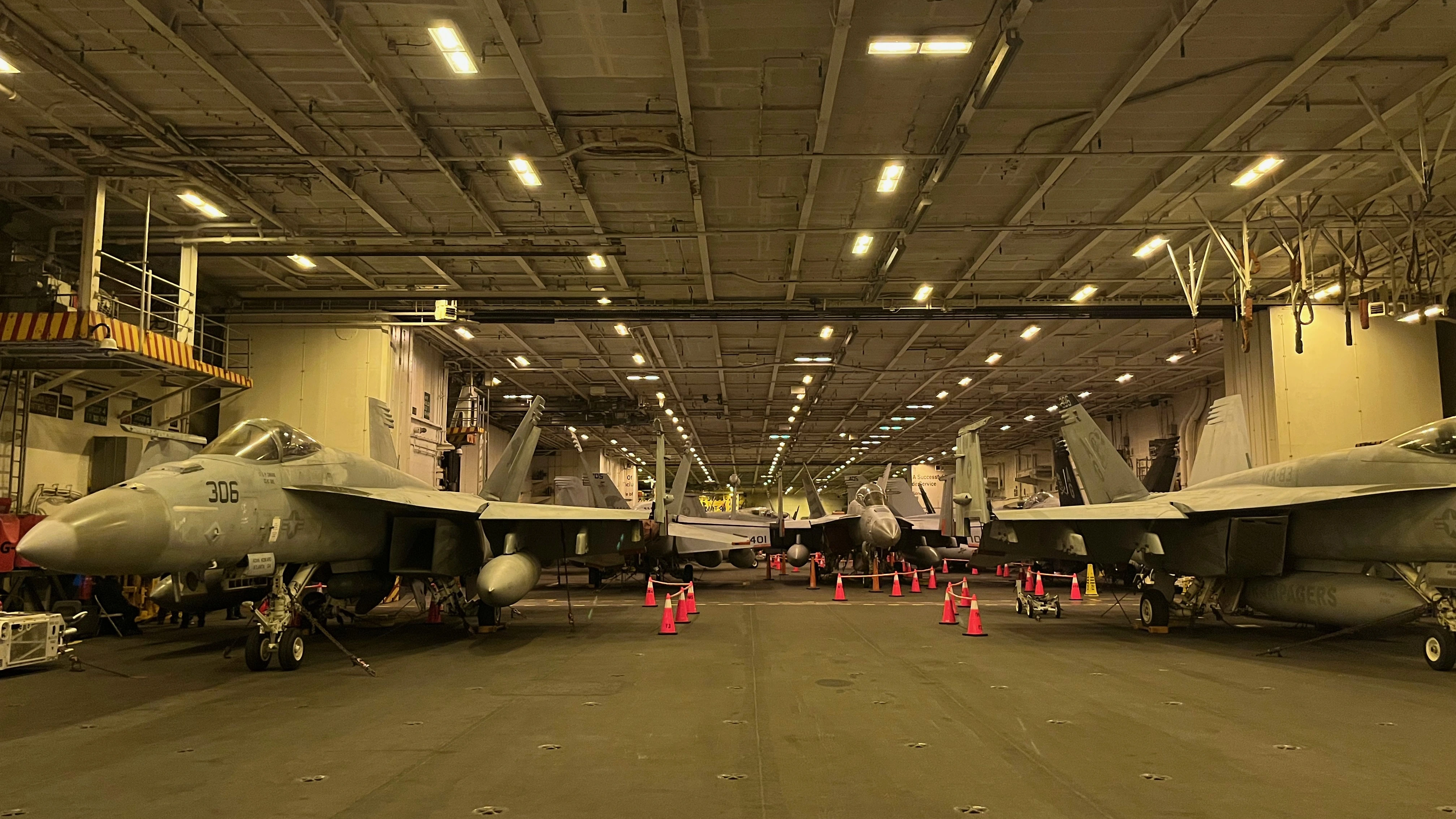 After a great dinner with the Executive Officer and the Commanding Officers of various squadrons we took a tour of the hangar bay where up to 24 aircraft can be stored and where maintenance is performed.