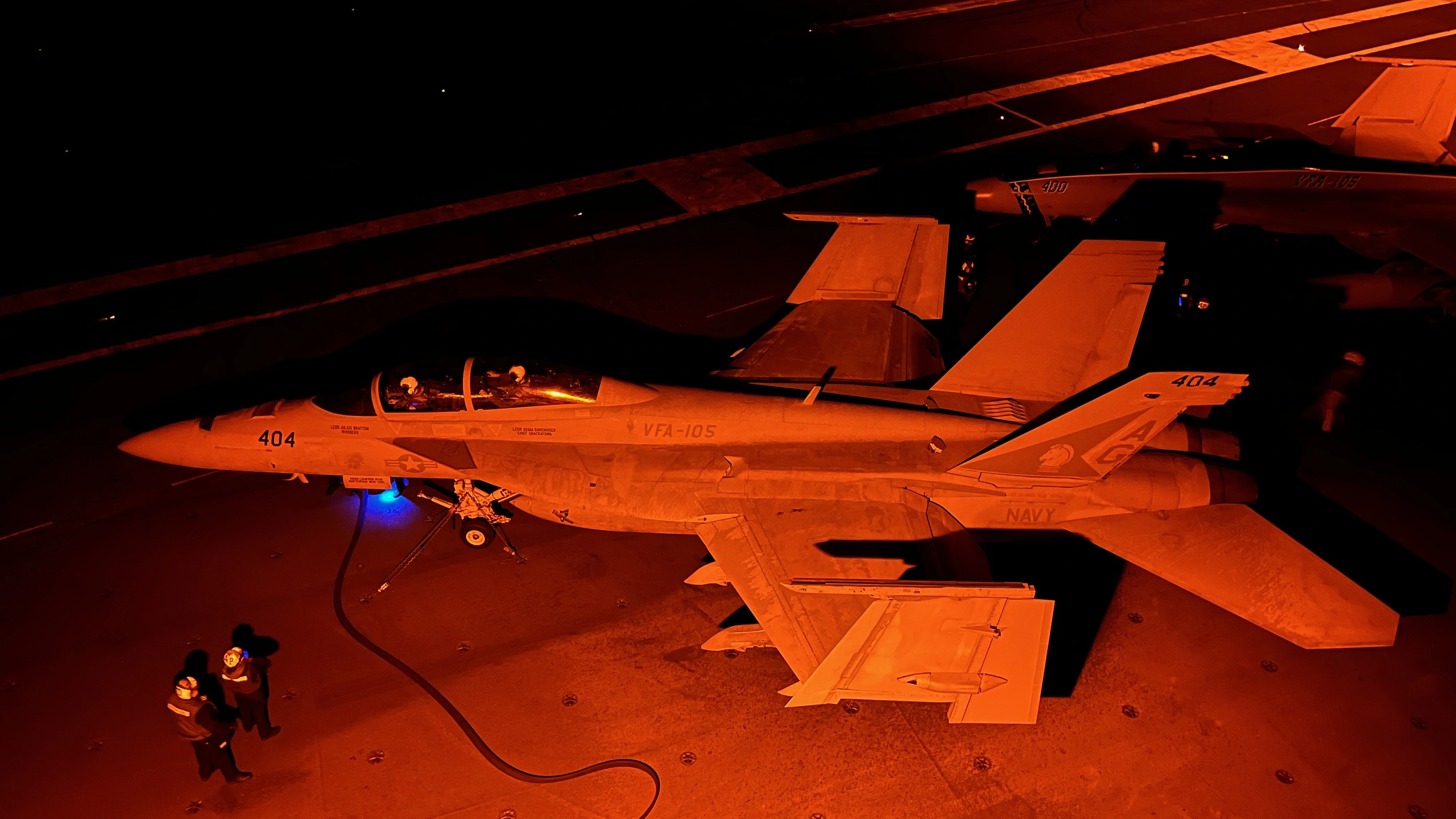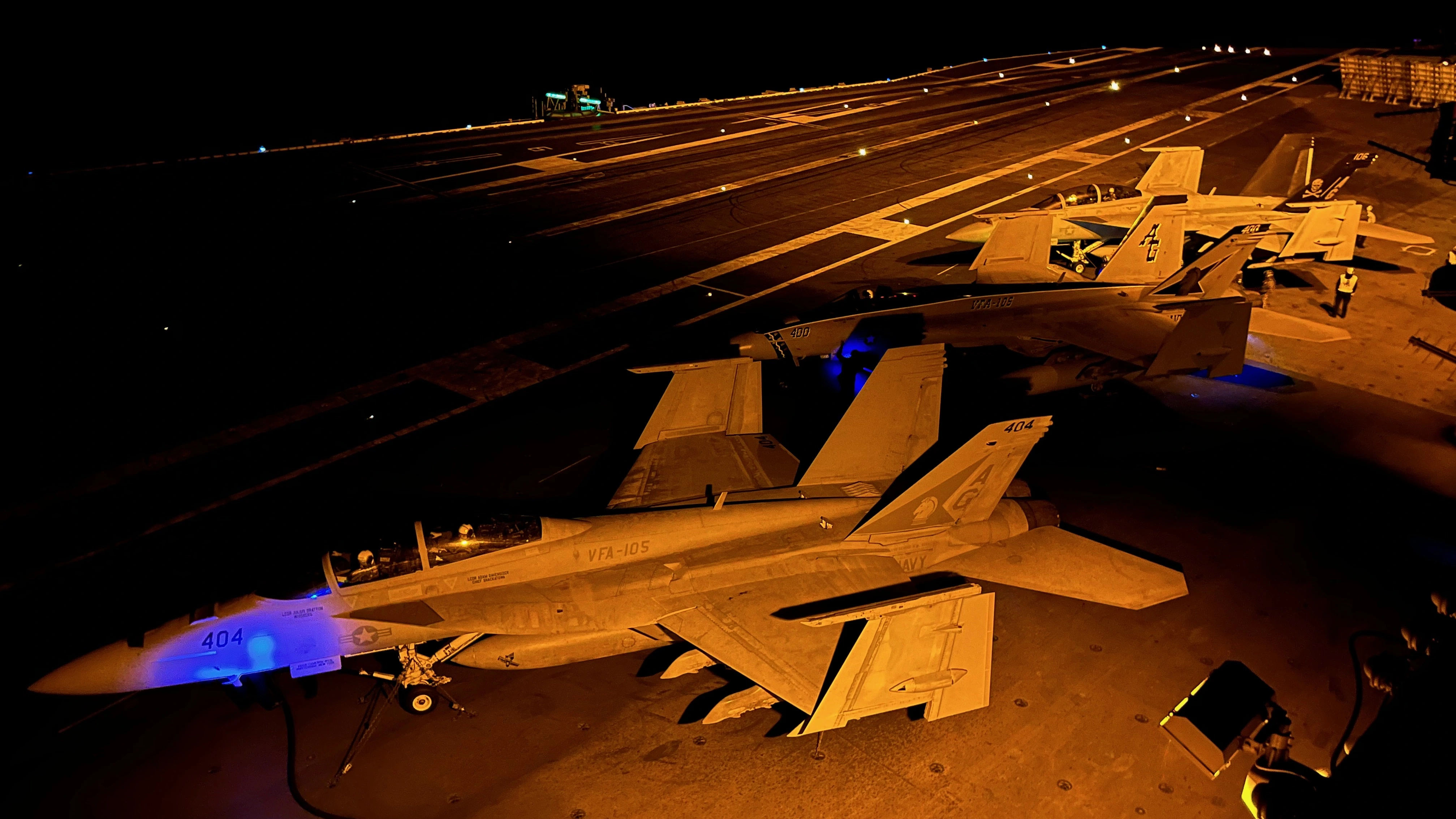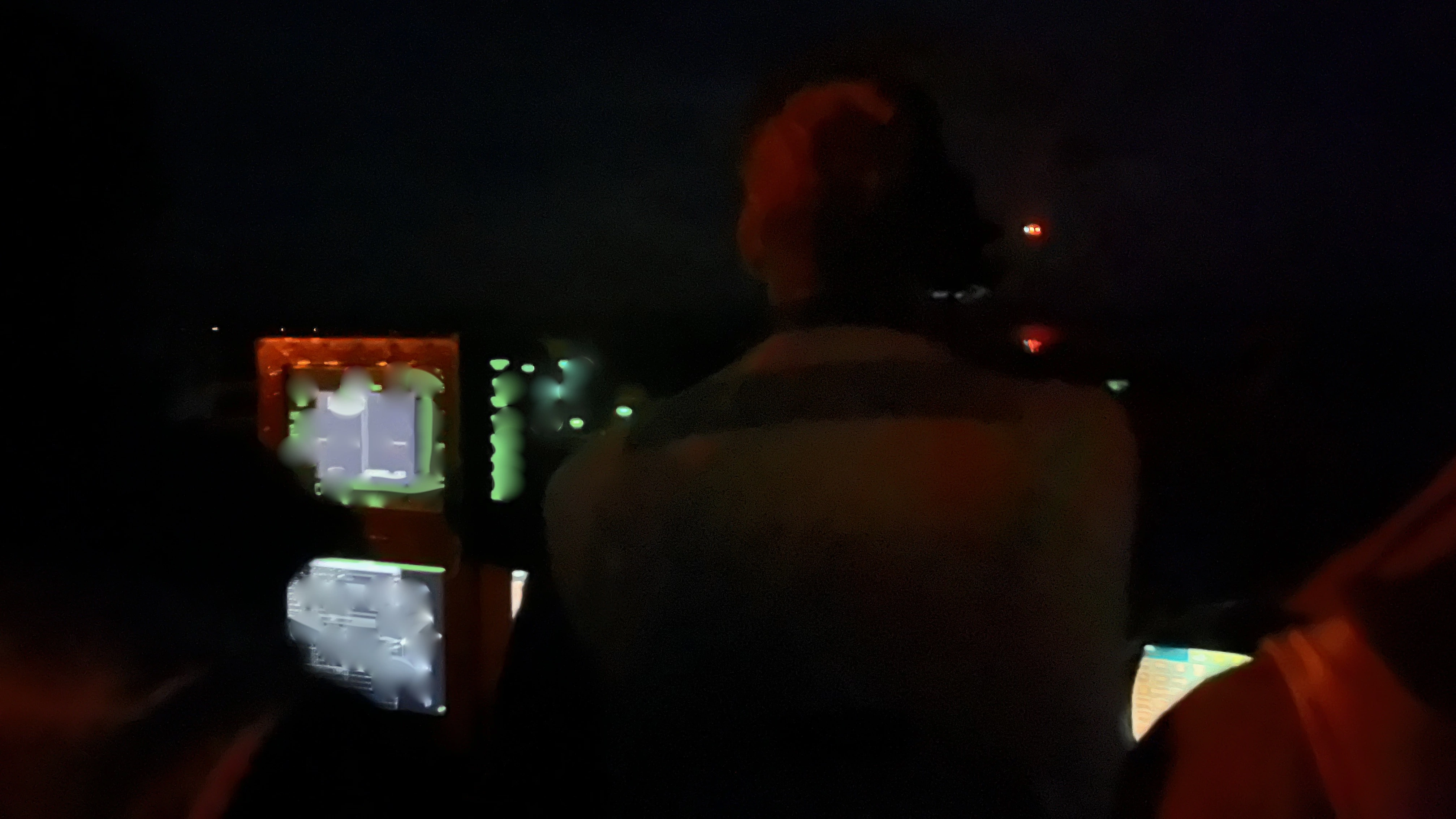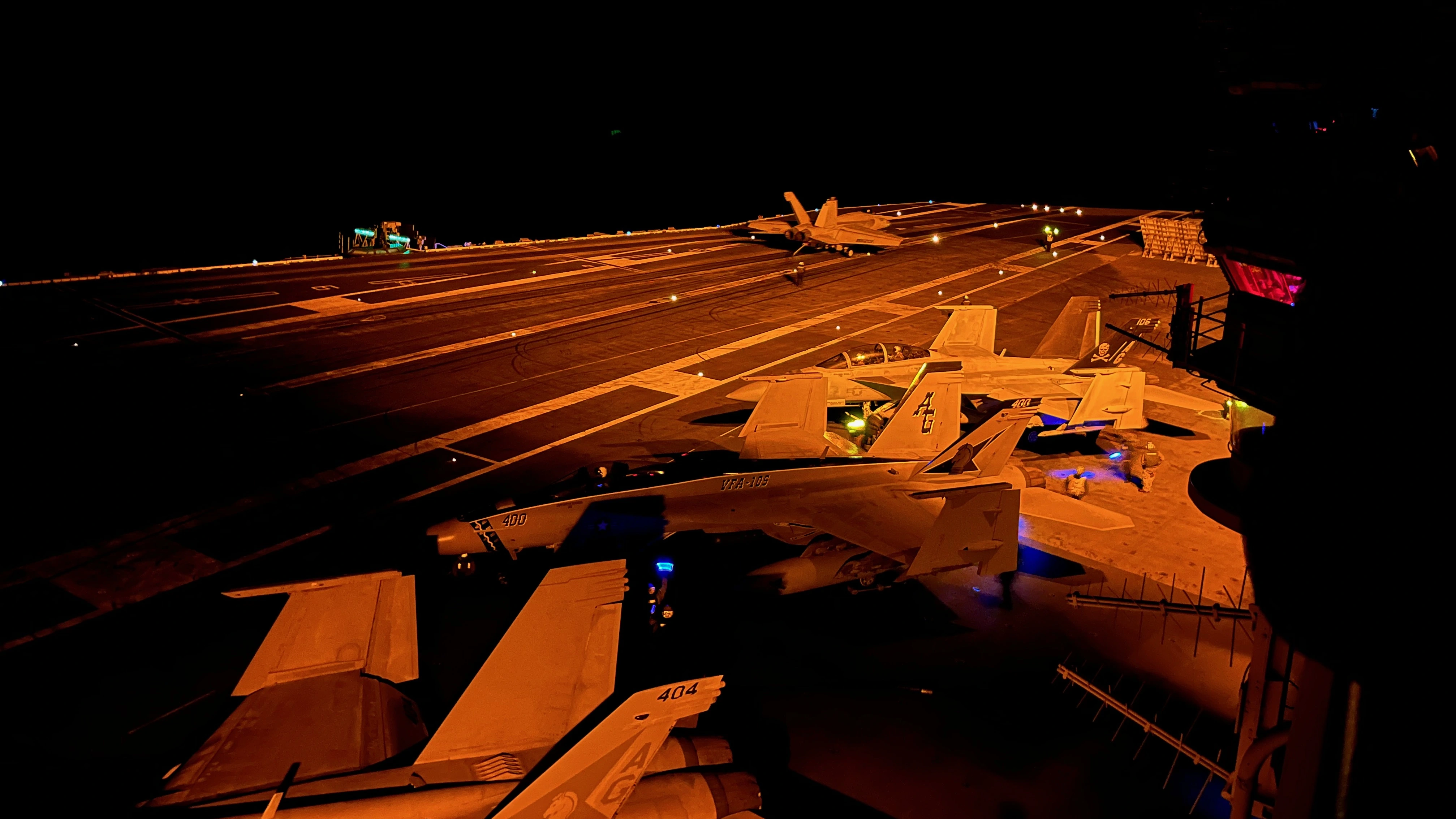 Please pardon my language here. There is dark, and then there is dark as fυck, and this is dark as fυck. Here is a picture from the platform. To the right of the LSOs head you can see the lights of a landing Hornet. This is as close as you can get to a landing jet. The jet would pass us at about 40 feet at 150 knots. In the pattern, each different type of aircrafts navigation lights would flash a specific number of times so the LSOs could identify what kind of aircraft they were looking at. The Hornets flashed 3 times. I've blurred out the monitors.