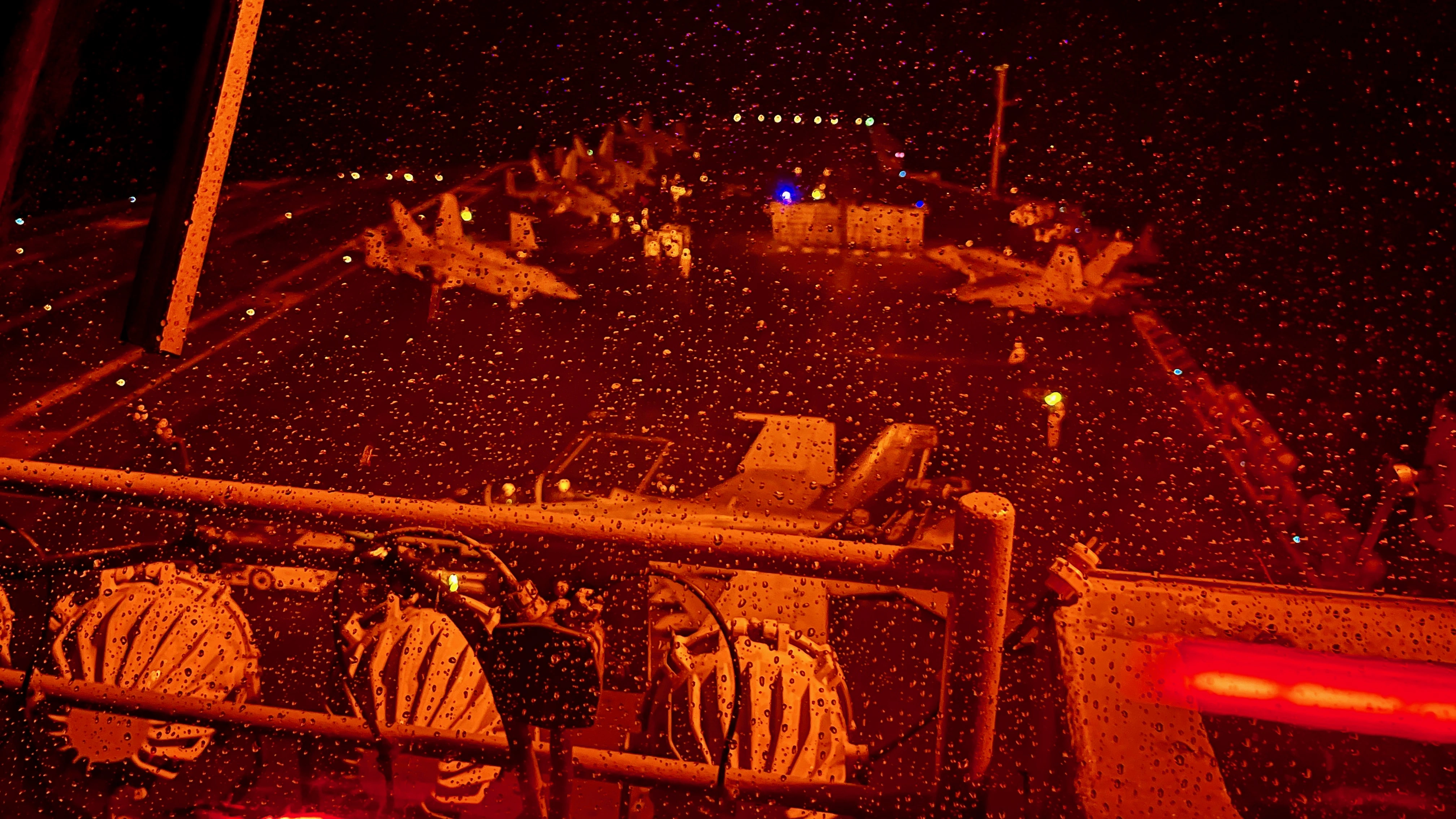 From the hangar deck it was up and out into the wind and rain to watch night flight operations. Even with all the wind and rain it was hot. The heat coming off the jets was incredible.