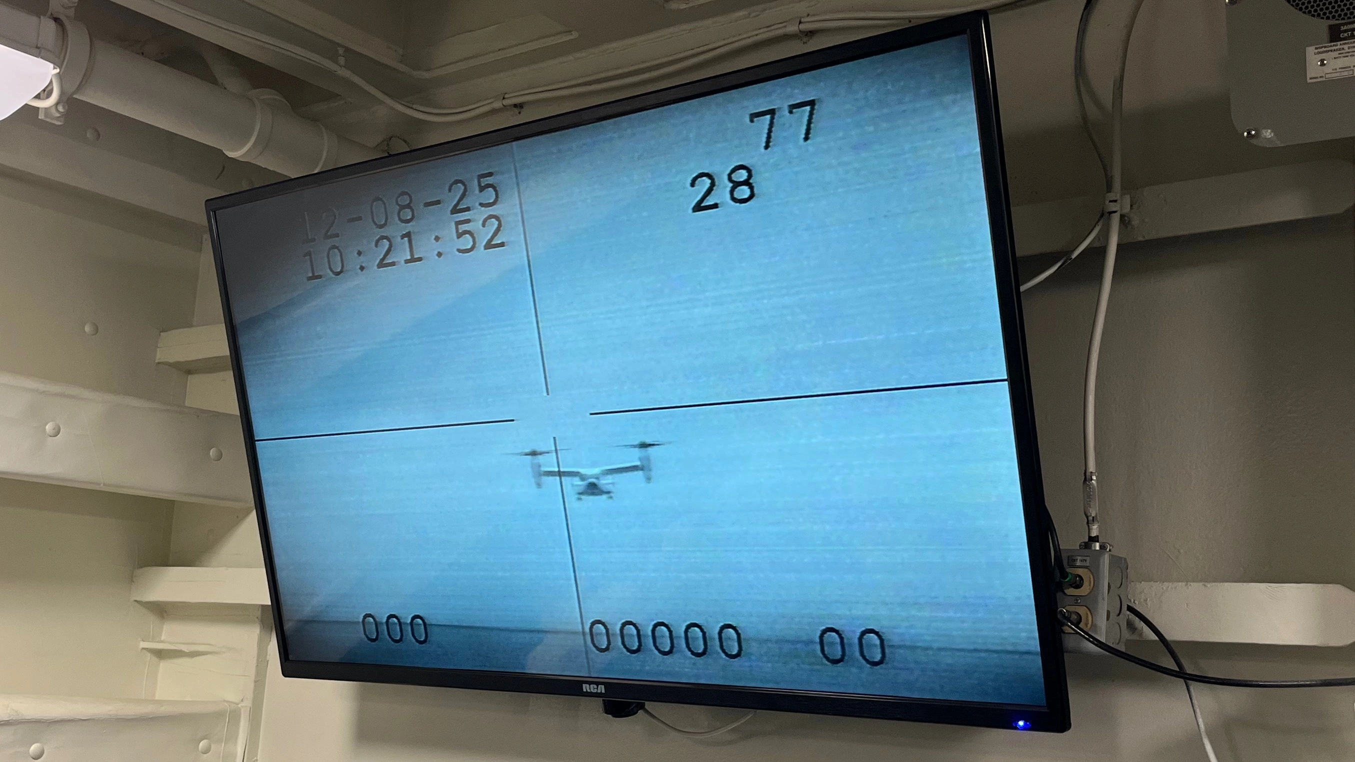 After 2 days onboard it was time to head home. Here is the monitor showing the Osprey arriving back at the ship to pick us up.