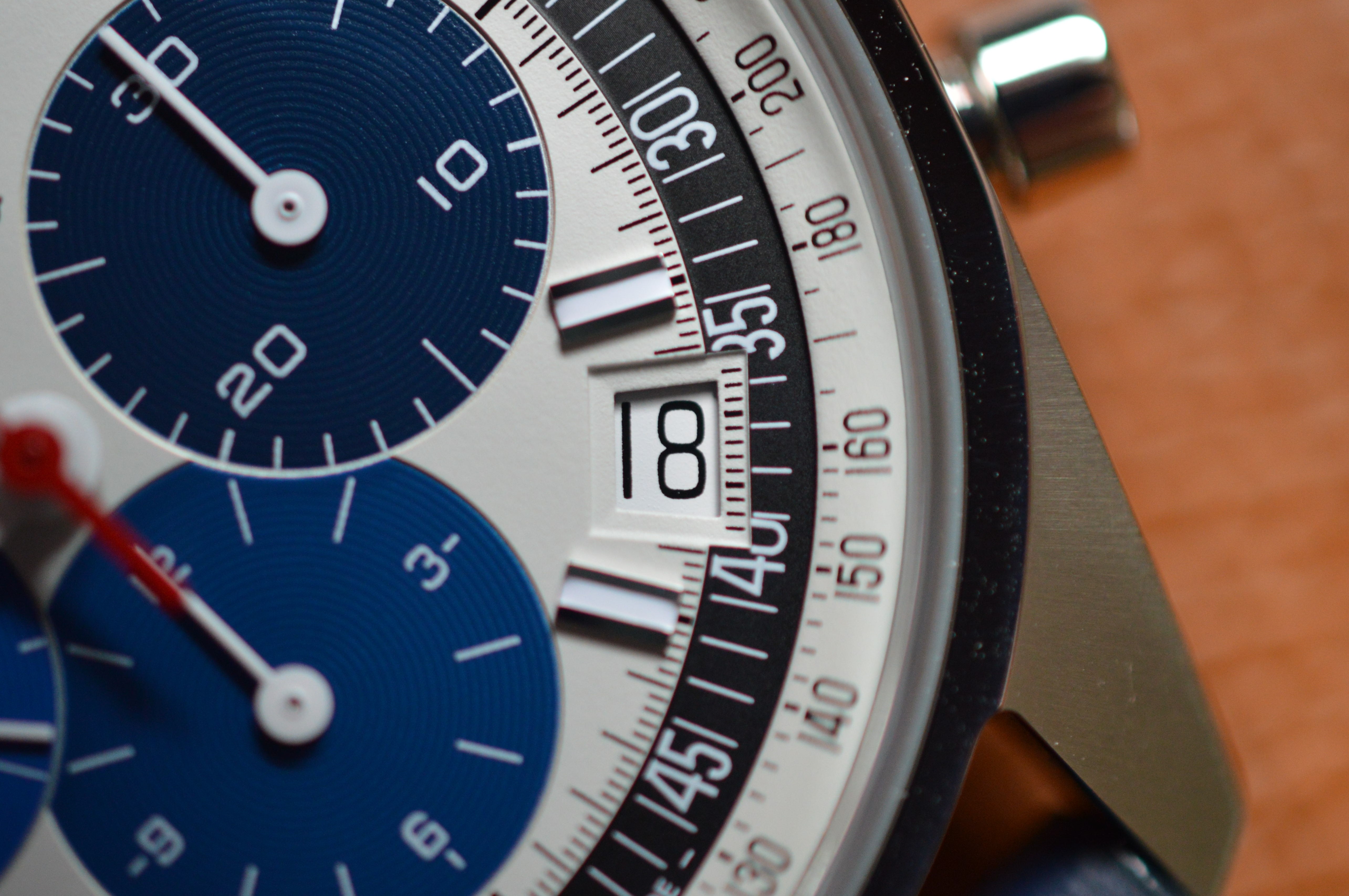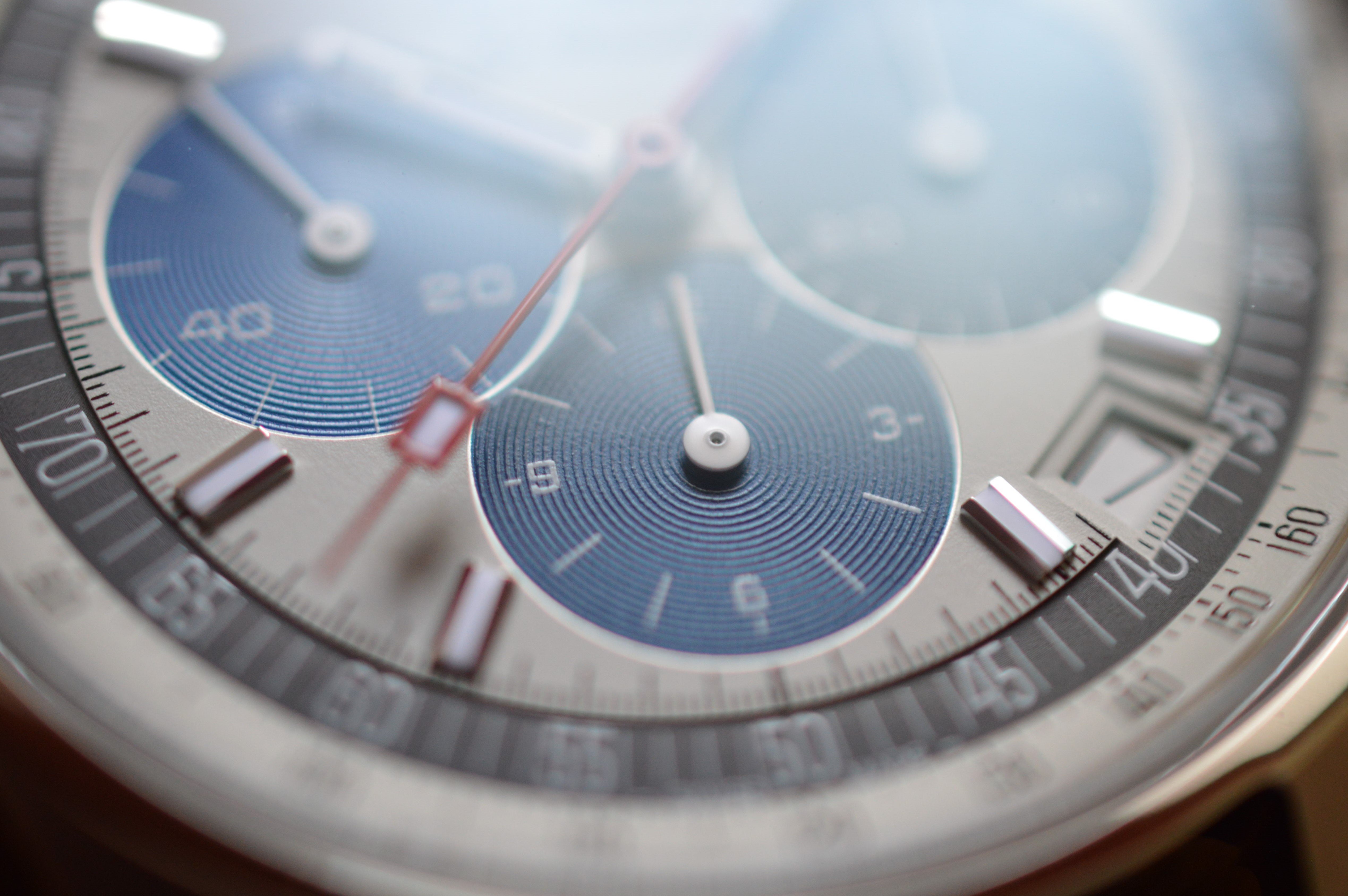 - There are sharply defined lines between subdials that are rendered in pearlescent white. The main dial is more of a flat white - Which allows for an interesting contrast in certain lights, beyond just that of the blue subdials and black decimal scale. The guilloche circles of the subdials are also clearly defined, and reflect the light wonderfully, as they're each finished in gloss blue.