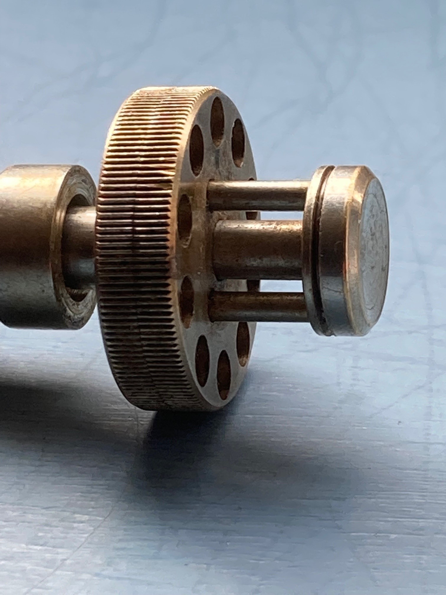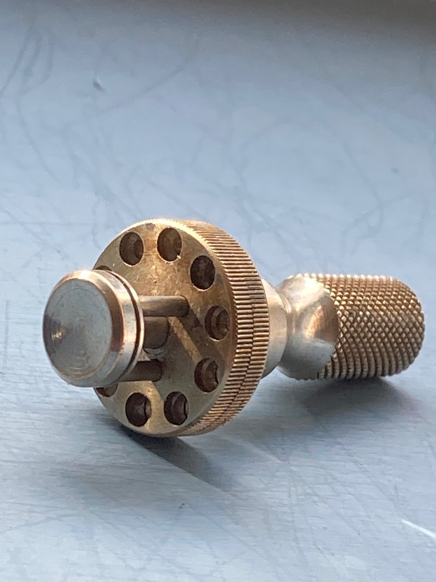 It is about 40mm long and 20mm across the two plates. The plates have 10 holes of graduated sizes. The holes are counter bored so that there is a shoulder inside each except the largest. I you look at the other pictures you will see that the the plates are held together by a concealed spring but can be separated by pressing on the opposite ends. The thumbscrew could either be used to lock the plates together or set an exact separation when depressed.
