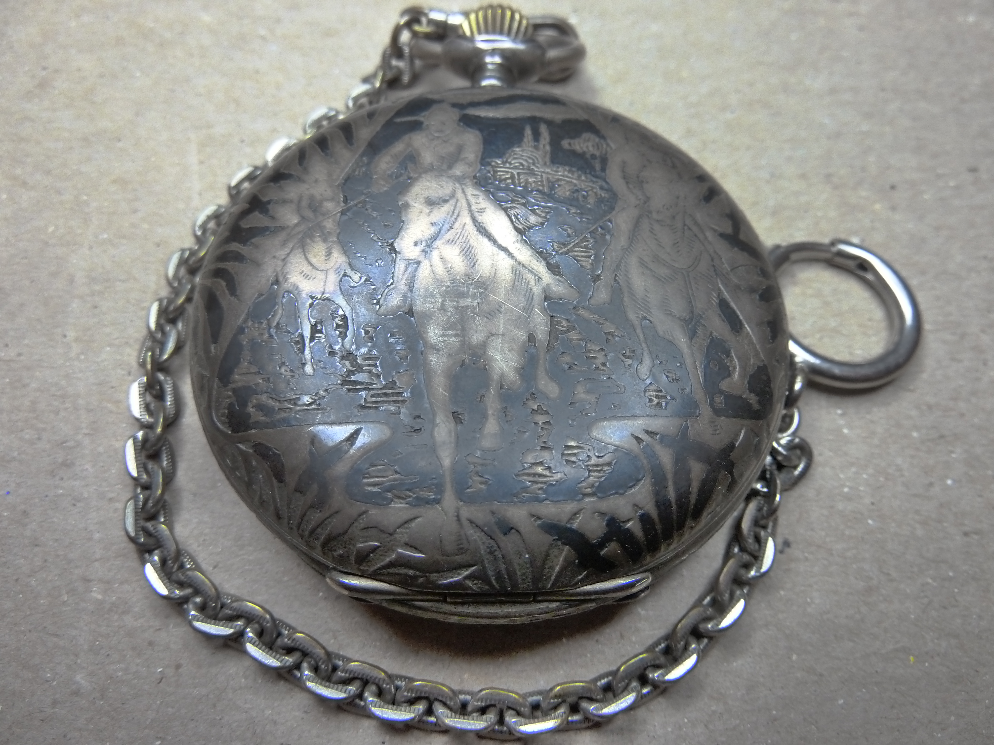 I have a ~1908 Hunter cased Omega pocket watch that I've had for many years. Every once in a while I've tried to find another like it on the web with no success. I'm curious what the decorative case treatment is called. Both members I mentioned suggested that I add some photos to my inquiry. So, I shall.