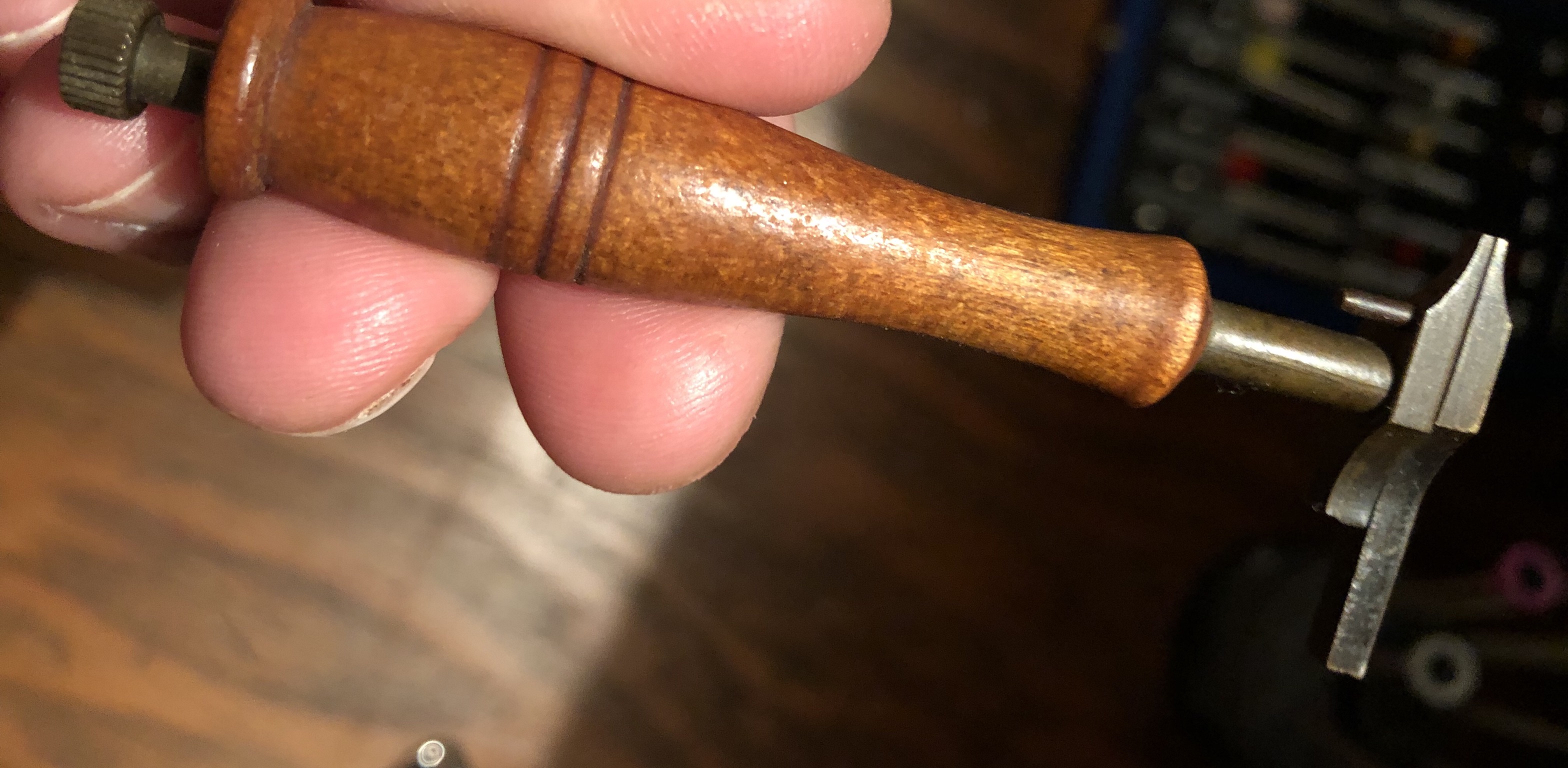 Can be used for warming a pallet for adjusting or re-setting a pallet stone, or for heating a wheel arbor prior to straightening a bent pivot. The item is clamped between the jaws, then the “tail” heated to the required temperature. When straightens a bent pivot, the tool acts a a heat sink to hold the temperature during straightening a bent pivot. After heating, steel arbors must be allowed to cool slowly. If it cools too fast, it will temper, and the steel hardens and the pivot will break.